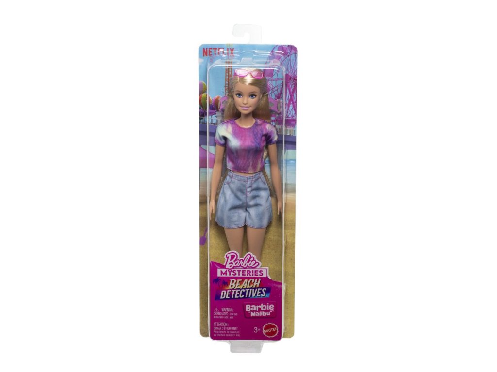 S panenkou Barbie „Malibu“ můžete vymýšlet nejrůznější detektivní příběhy. Tato módní panenka má batikovaný top a džínové šortky s růžovým prošíváním, její outfit doplňují vysoké tenisky a sluneční brýle. Děti a fanoušci od 3 let si zamilují vymýšlení vlastních záhad. Panenka nemůže stát samostatně. Barvy a vzhled výrobku se mohou lišit.