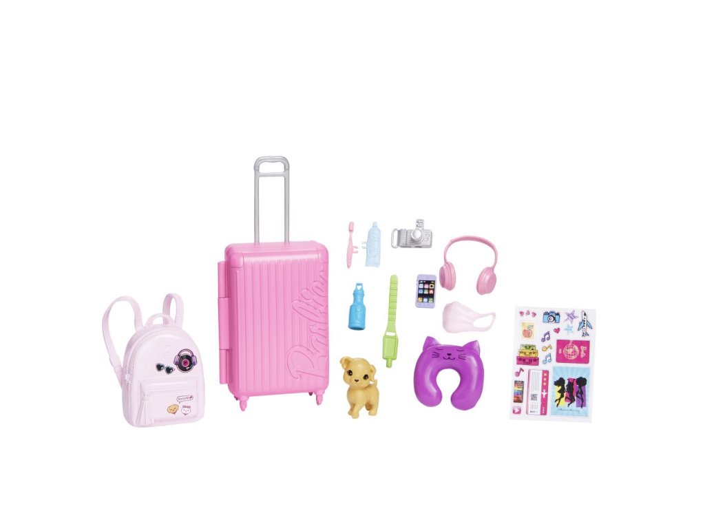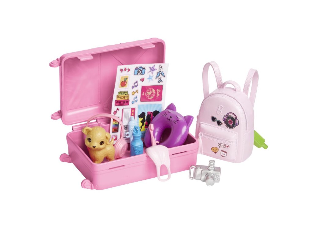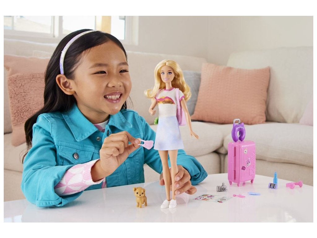 Panenka Barbie® Malibu na cestách inspirovaná seriálem Barbie - Na to jsou potřeba dva, potěší spoustou cestovních doplňků, mezi které patří velký kufr na kolečkách, batoh, fotoaparát, opěrka na krk, sluneční brýle, společník na cesty a další! Panenka neumí samostatně stát.