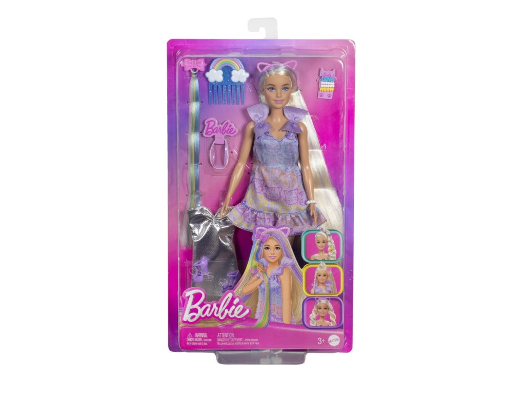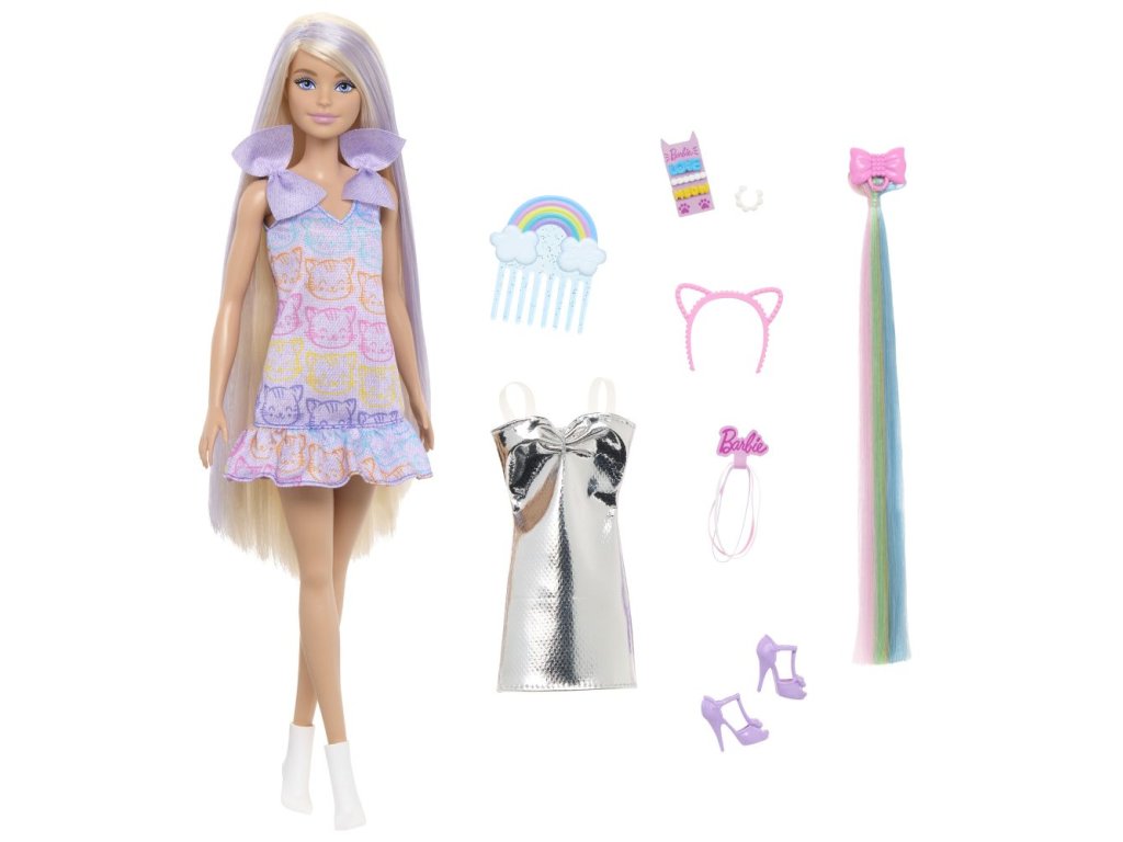 Panenka Barbie miluje parádění a potěší všechny malé milovnice vlasových proměn! Panenka s extra dlouhými vlasy s barevnými pramínky čeká na nový účes – klidně každý den jiný. Součástí balení je 10 doplňků na česání a styling, včetně duhového příčesku, mašlí, čelenky s kočičími oušky a náhradního oblečku. Malé stylistky si zamilují kombinování outfitů i tvoření copánků, drdolů nebo pestrobarevných účesů. Skvělý dárek pro děti od 3 let. Panenka nemůže stát samostatně. Barvy a vzhled výrobku se mohou lišit.