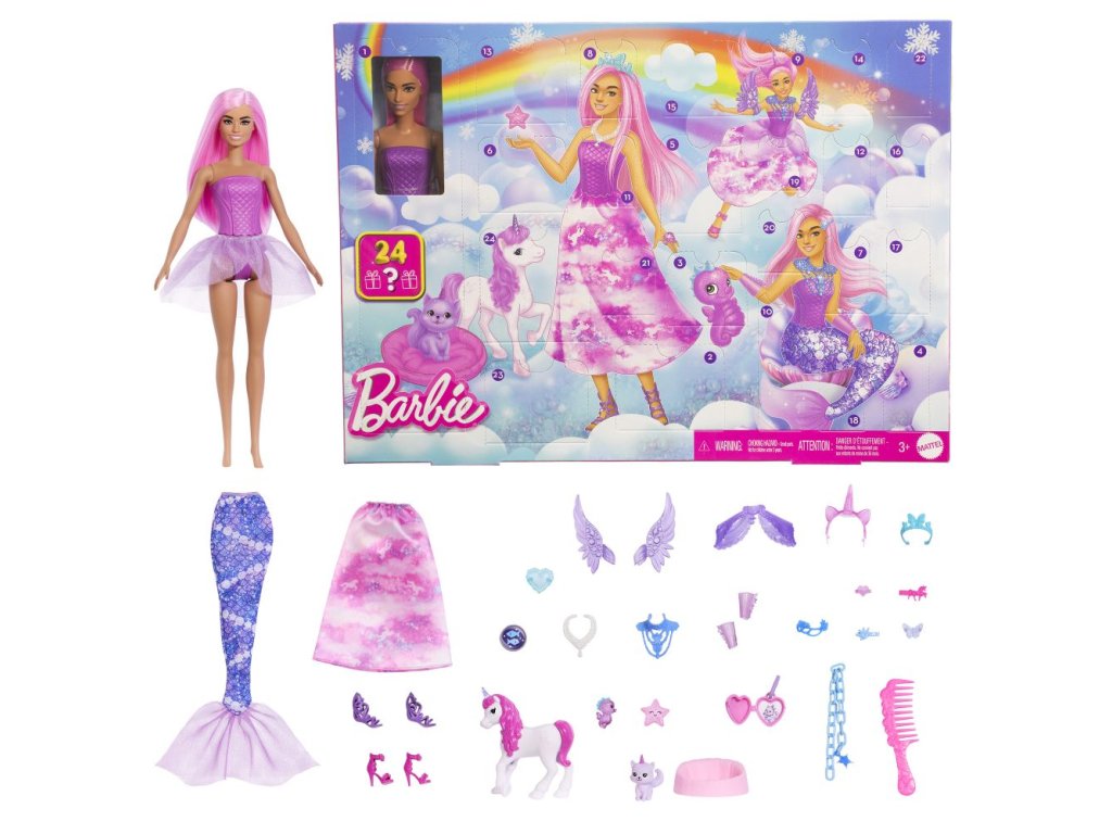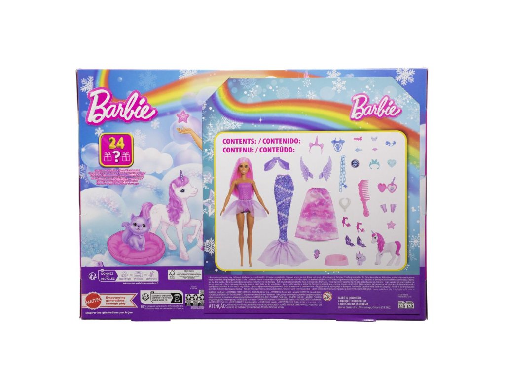 Odpočítávejte dny do Vánoc s tímto Barbie adventním kalendářem plným dárků s kouzelnou tematikou! Po dobu 24 dní si každý den otevřete jedno překvapení (nebo je klidně otevřete všechny najednou!) a zažijte kouzelný zážitek při rozbalování. První den najdete v kalendáři panenku Barbie s krásnými růžovými vlasy a ty další potom oblečení a doplňky, které ji promění v mořskou pannu, královnu nebo vílu. Mezi překvapení patří ocas mořské panny, vílí křídla, malý jednorožec a další pohádkoví zvířecí kamarádi, ozdobné čelenky a další. S tímto setem se děti mohou těšit na kouzelné svátky! Panenka nemůže stát samostatně. Barvy a vzhled výrobku se mohou lišit.