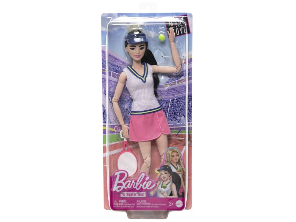 Panenka Barbie® Sportovkyně - tenistka je připravena na pořádnou smeč! Panenka má na sobě tenisovou sukni, top s výstřihem do V, tenisovou raketu a tenisový míček. Díky 22 kloubům v těle má panenka neuvěřitelný rozsah pohybu pro realistickou hru. Panenka neumí samostatně stát. Barvy a vzhled výrobku se mohou lišit.