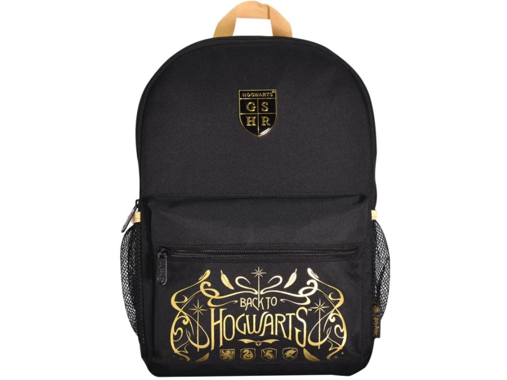 Velký černý nylonový batoh se zlatým potiskem Bradavic a detailem smaltovaného odznaku, přední kapsa na zip a boční síťované kapsy na láhve. Batoh má délkově nastavitelné popruhy a ucho pro snadné nošení v ruce.