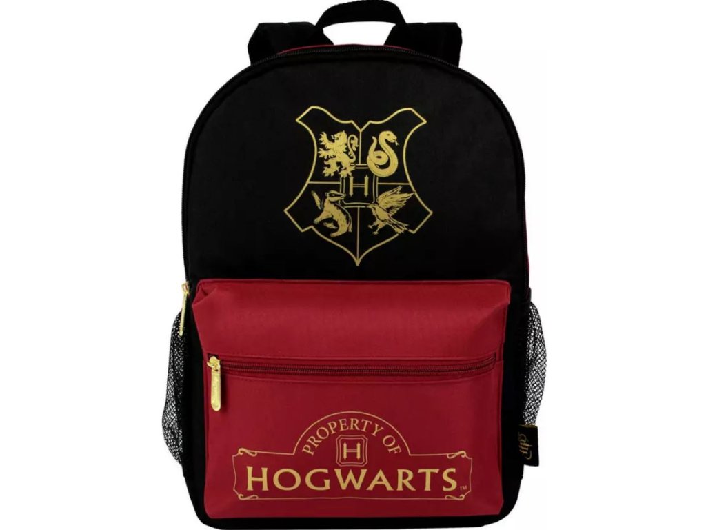Atraktivní černý batoh se zlatou grafikou Property Of Hogwarts (Majetek Bradavic) z populázní knižní a filmové ságy Harry Potter. Batoh disponuje hlavní velkou kapsou, červenou malou kapsou na zip, dvě sítované kapsy pro láhve na pití, délkově nastavitelnými popruhy a uchem pro snadné nošení v ruce.