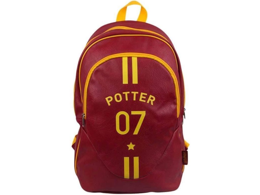 Atraktivní červený batoh s motivem dresu Harryho Pottera z kouzelnického sportu Famfrpál. Ve předu má nápis POTTER 07. Batoh má žluté lemování a kapsy mají zapínání na zip. Délkově nastavitelné popruhy.