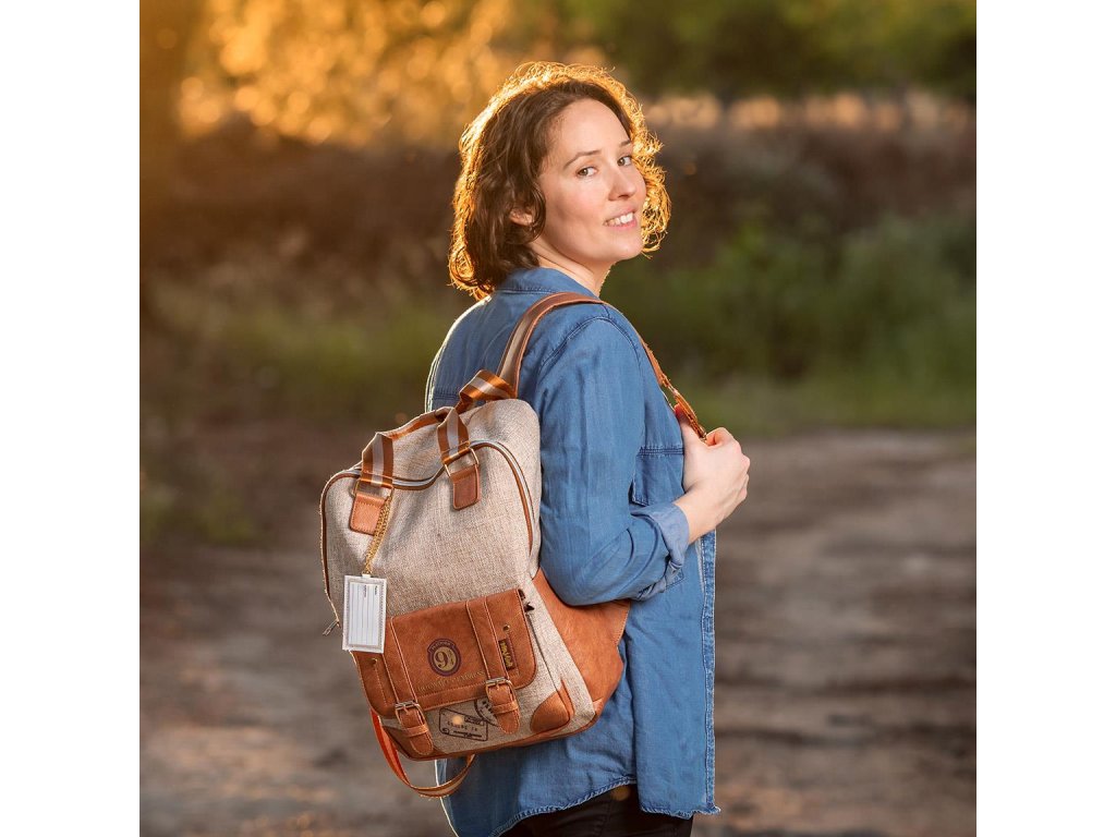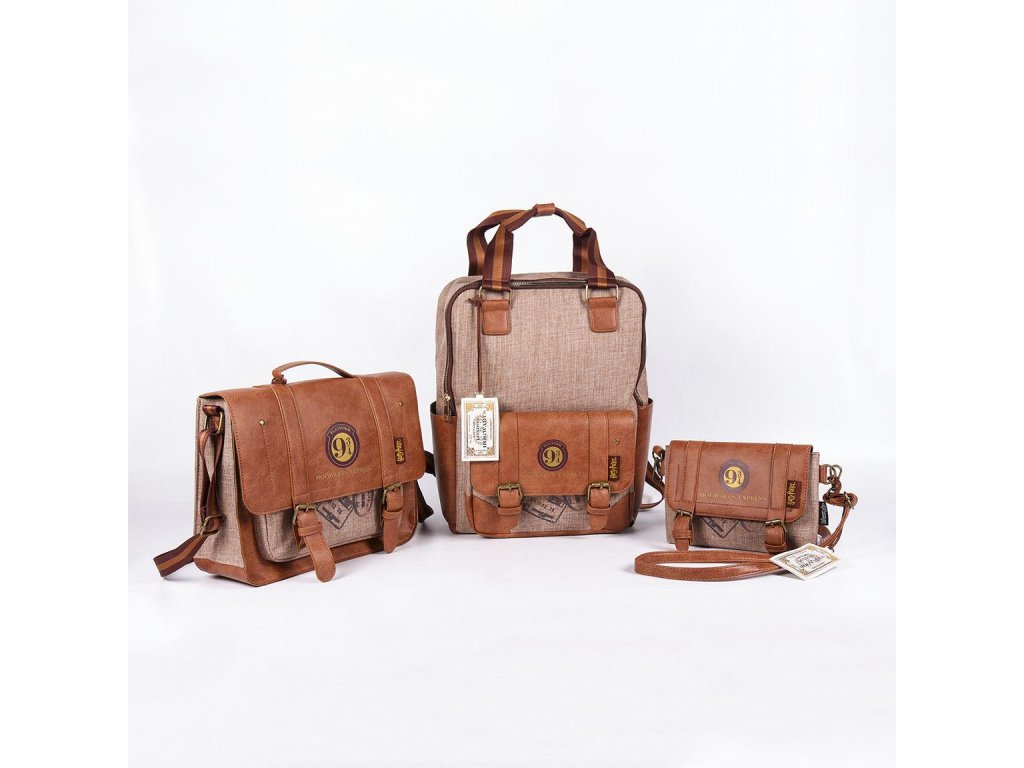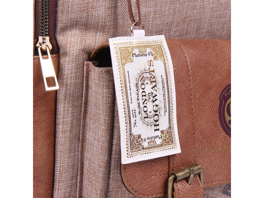Jednoprostorový batoh v hnědé barvě s přední kapsou. Batoh se znakem kouzelného nástupiště 9 a 3/4, z filmové ságy Harry Potter. Má dva popruhy pro snadné nošení v ruce a je délkově nastavitelný.