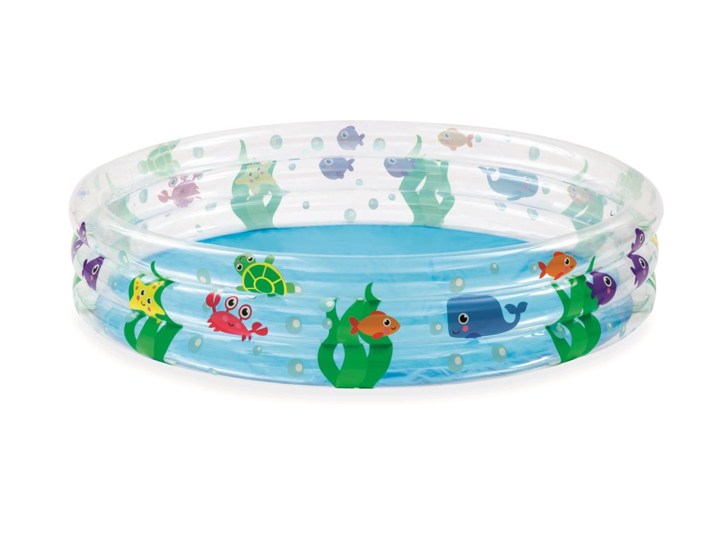 Nadzemní dětský zahradní bazén (51004) od italské firmy Bestway s potiskem mořského světa. Bazén se skládá ze tří samostatně nafukovacích prstenců, které jsou zabezpečeny proti nechtěnému úniku vzduchu. Součástí balení dětského bazénu je i opravná sada, která slouží k zalepení menších dírek.