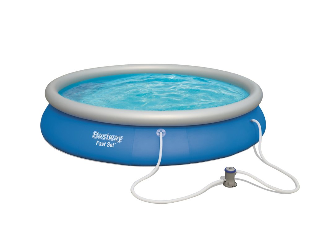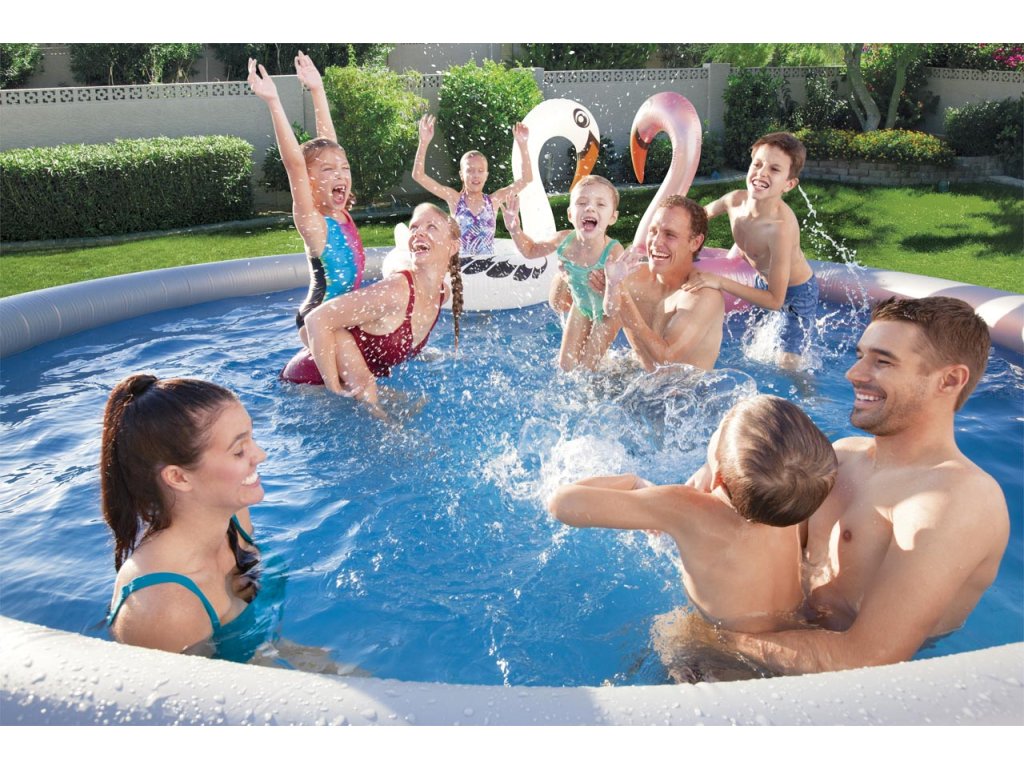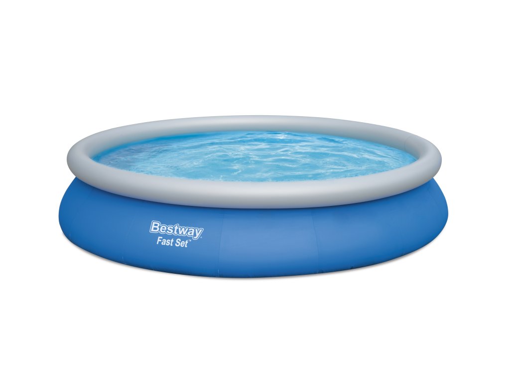 Bestway 57313 Fast Set Pool Set o objemu 9 677 l má odolný plášť podporovaný horní kruhovou částí, která pomáhá udržovat tvar.