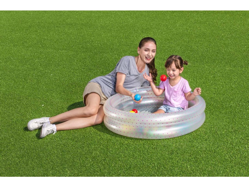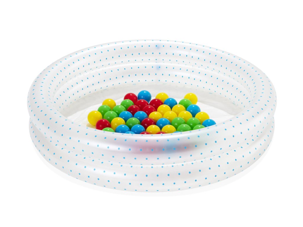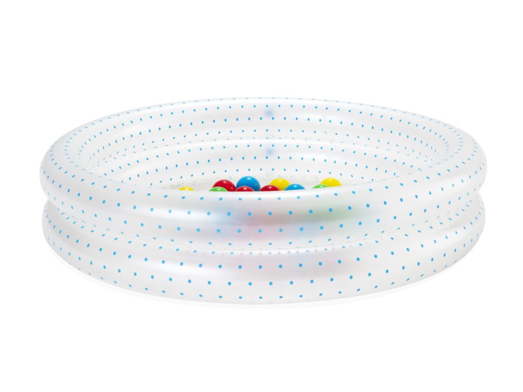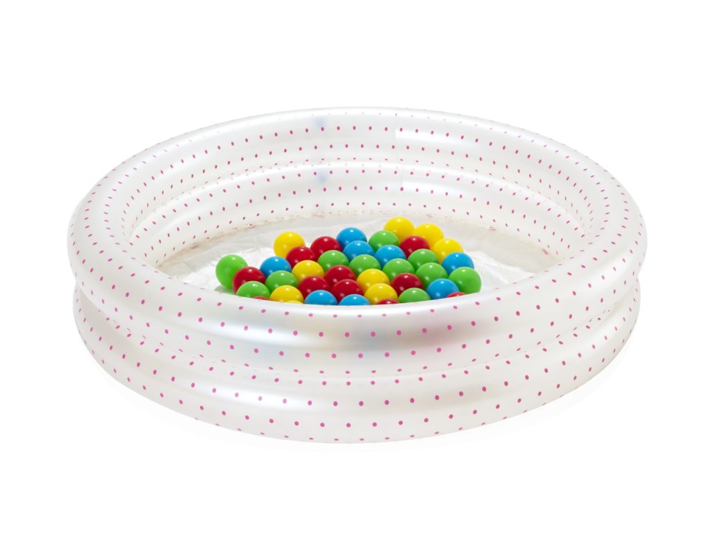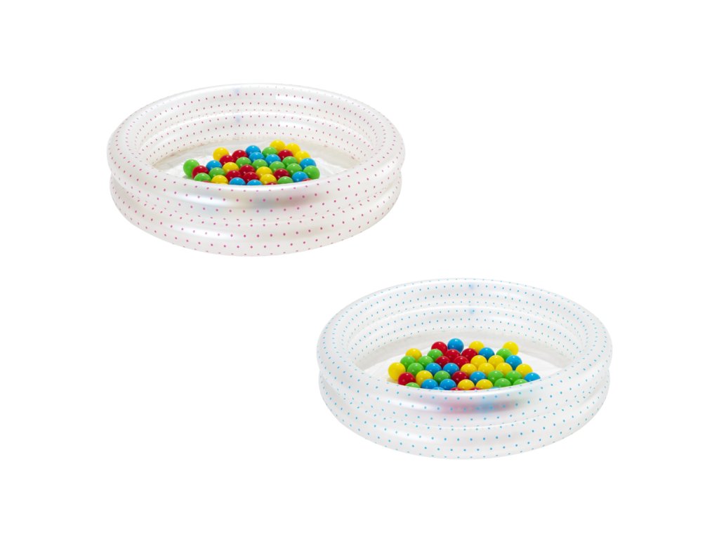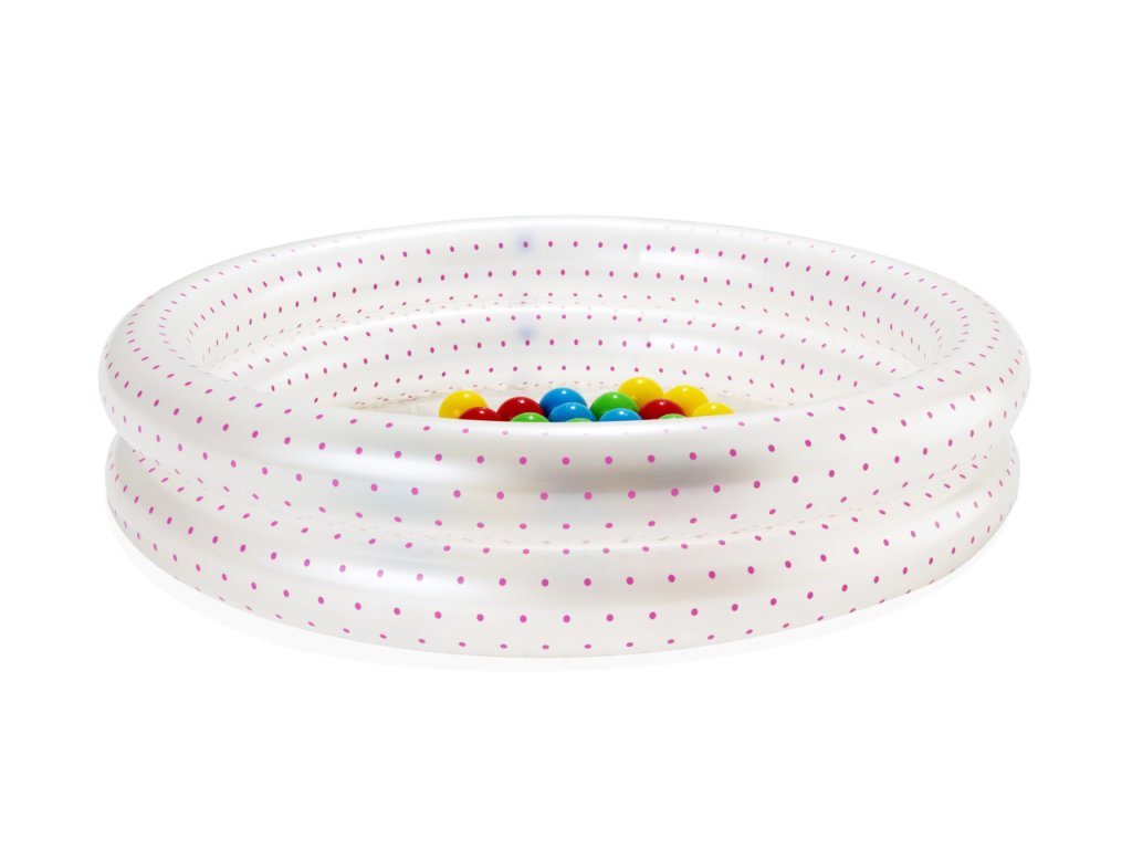 Dětský bazén s míčky. Dva nafukovací kruhy zajišťují dětem měkkou podporu. Hru s 50 vícebarevnými hracími míčky si děti zamilují. Když je hezké počasí, naplňte bazének vodou a užijte si vodní hrátky. Bazének se snadno nafoukne, vyfoukne a složí. 2 barevné provedení (světle růžové a světle modré puntíky). Obsahuje: 1 nafukovací bazének, 50 barevných míčků, 1 opravnou záplatu. Rozměr bazénku: 91 x 20 cm. Věk: 2+. Používejte pouze pod dohledem dospělé osoby.