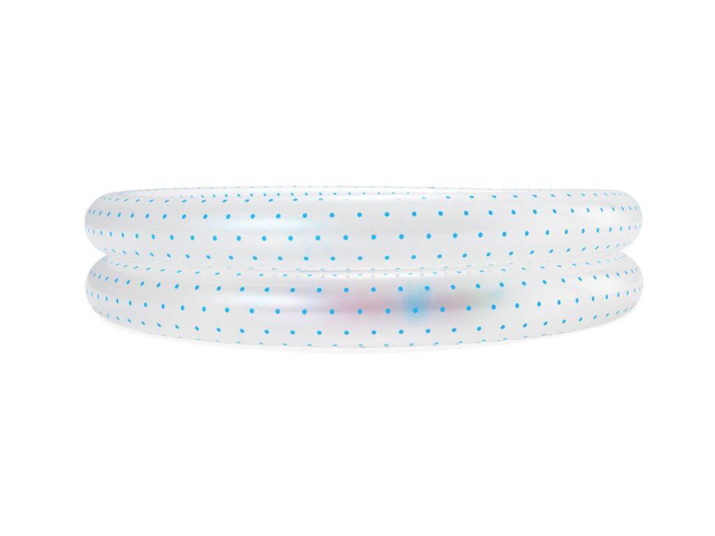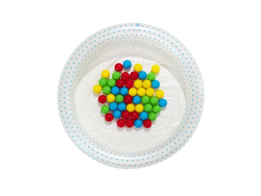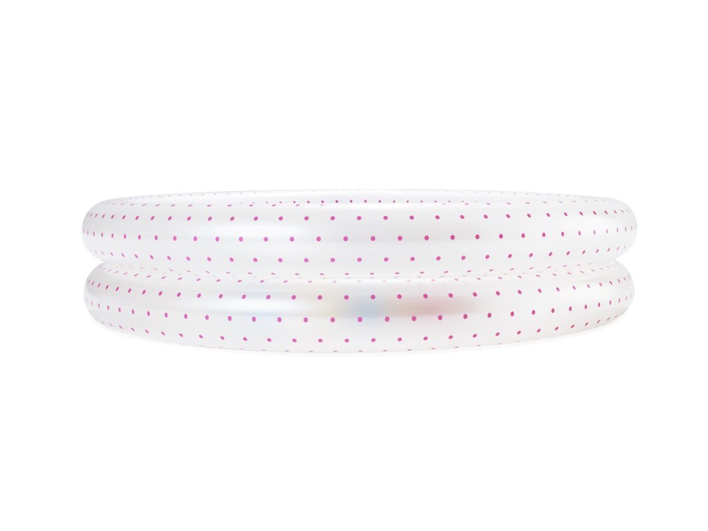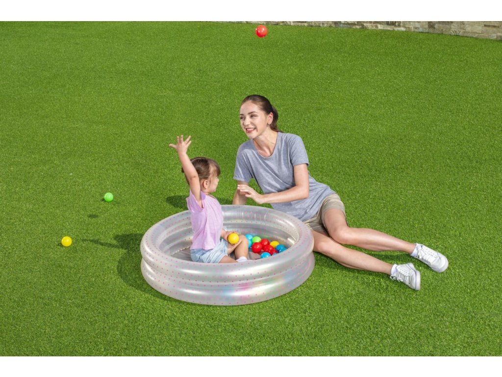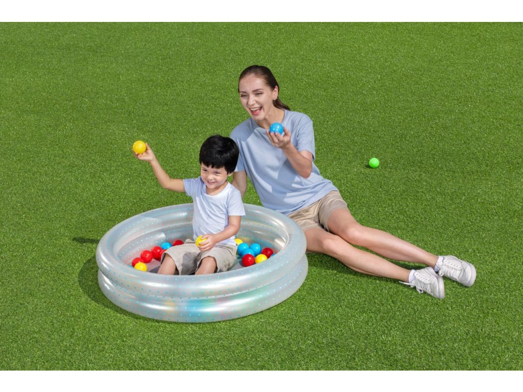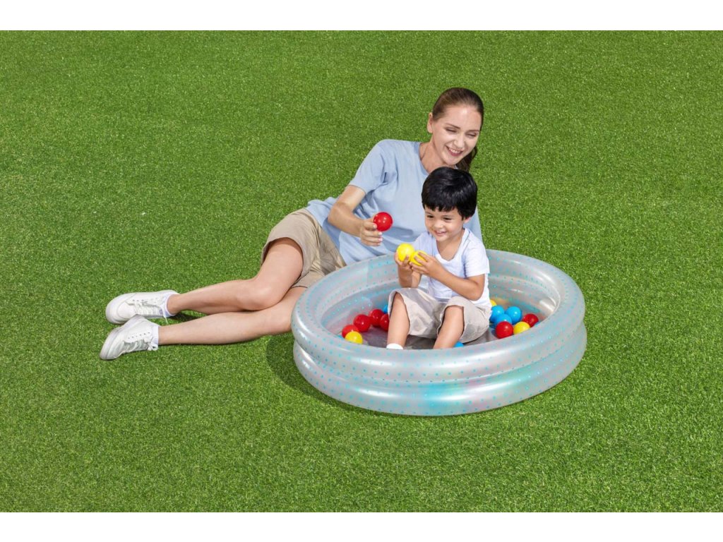 Dětský bazén s míčky. Dva nafukovací kruhy zajišťují dětem měkkou podporu. Hru s 50 vícebarevnými hracími míčky si děti zamilují. Když je hezké počasí, naplňte bazének vodou a užijte si vodní hrátky. Bazének se snadno nafoukne, vyfoukne a složí. 2 barevné provedení (světle růžové a světle modré puntíky). Obsahuje: 1 nafukovací bazének, 50 barevných míčků, 1 opravnou záplatu. Rozměr bazénku: 91 x 20 cm. Věk: 2+. Používejte pouze pod dohledem dospělé osoby.