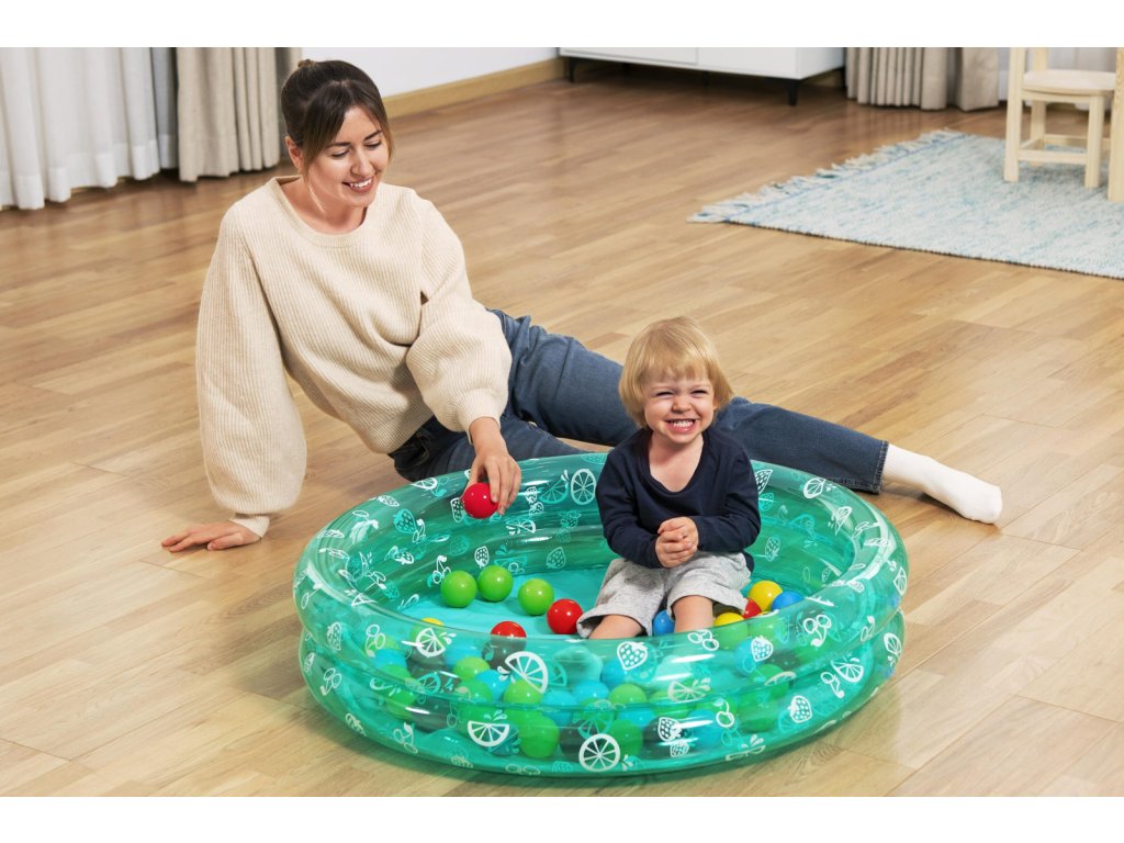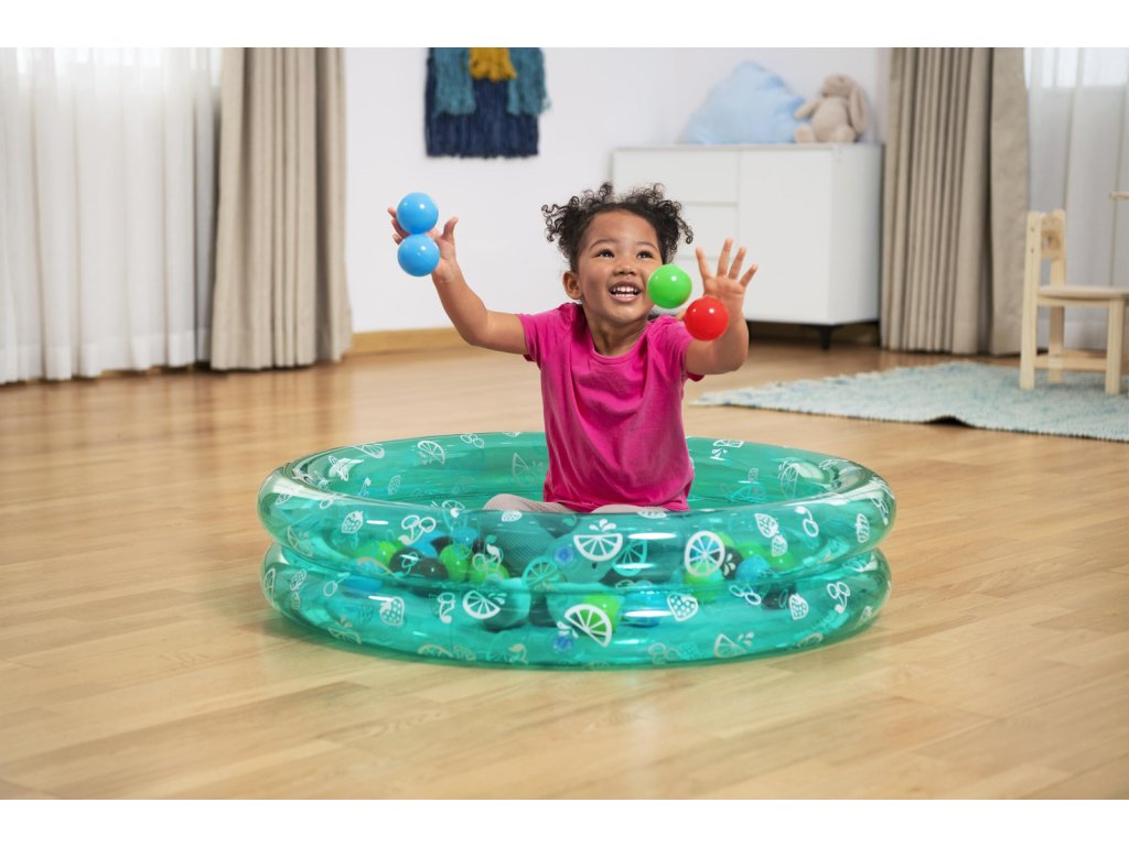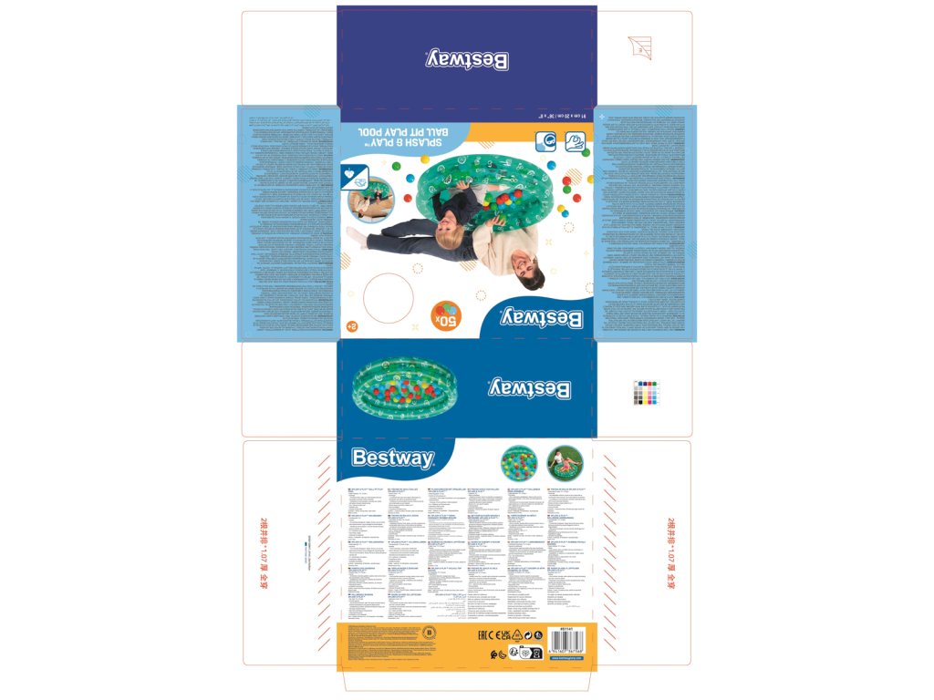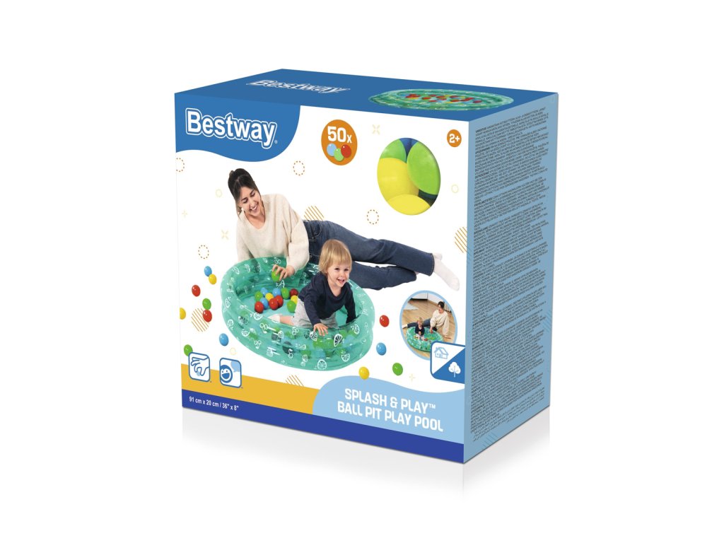 Bestway® Nafukovací bazén Splash & Play™ s 50 hracími míčky. Tato nafukovací hračka 2 v 1 přináší zábavu s míčky a bazén přímo do vašeho obývacího pokoje nebo na dvorek! Nafukovací stěny poskytují stabilní oporu, zatímco vaše ratolesti prozkoumávají bazén. Když je dobré počasí, můžete Splash & Play™ naplnit vodou a použít jej jako brouzdaliště. Bazén se snadno nafukuje a vyfukuje, takže jej lze rychle postavit a uložit. Napomáhá k rozvoji jemné motoriky. Pomáhá dítěti rozvíjet koordinaci rukou a oka, stejně jako základní úroveň zručnosti. Také podporuje sebedůvěru dítěte pomoci interaktivní hry. Vyrobeno z kvalitního a odolného PVC. Bazén má 2 vzduchové komory. Včetně opravné záplaty. Max kapacita: 73 l Nafouknutá velikost bazénu: O 91x20 cm. Nenafouknutá velikost bazénu: 83 x 83 cm. Rozměry balení: 30 x 33 x 13 cm. Používejte pouze pod dohledem dospělé osoby. Věk: 2+