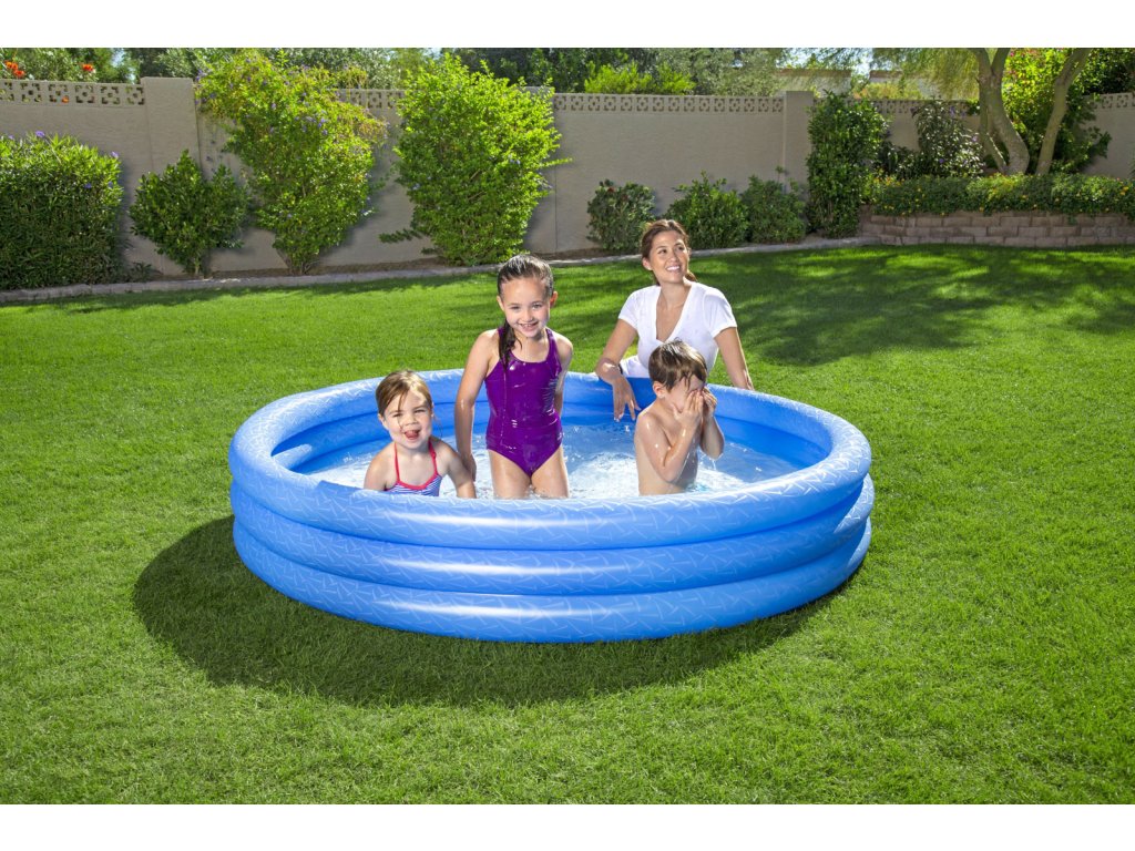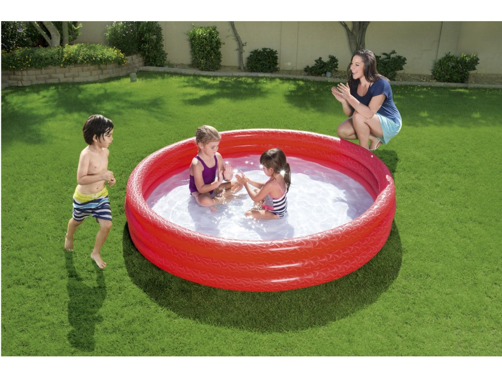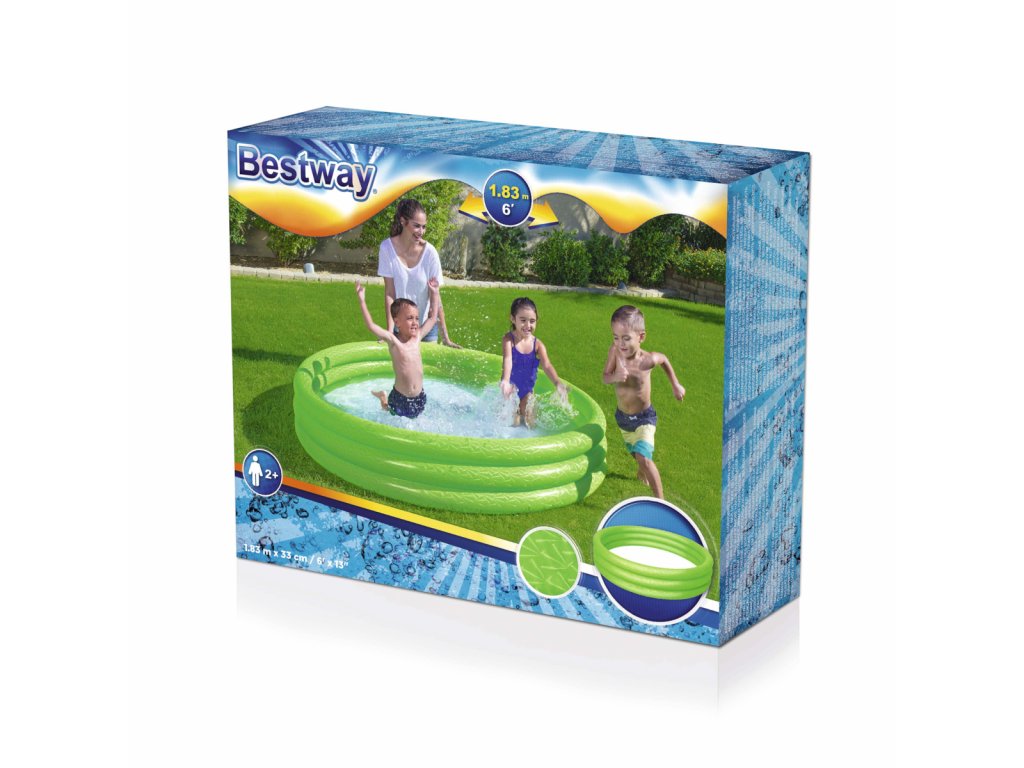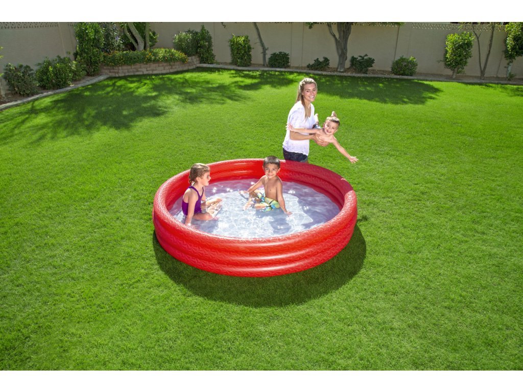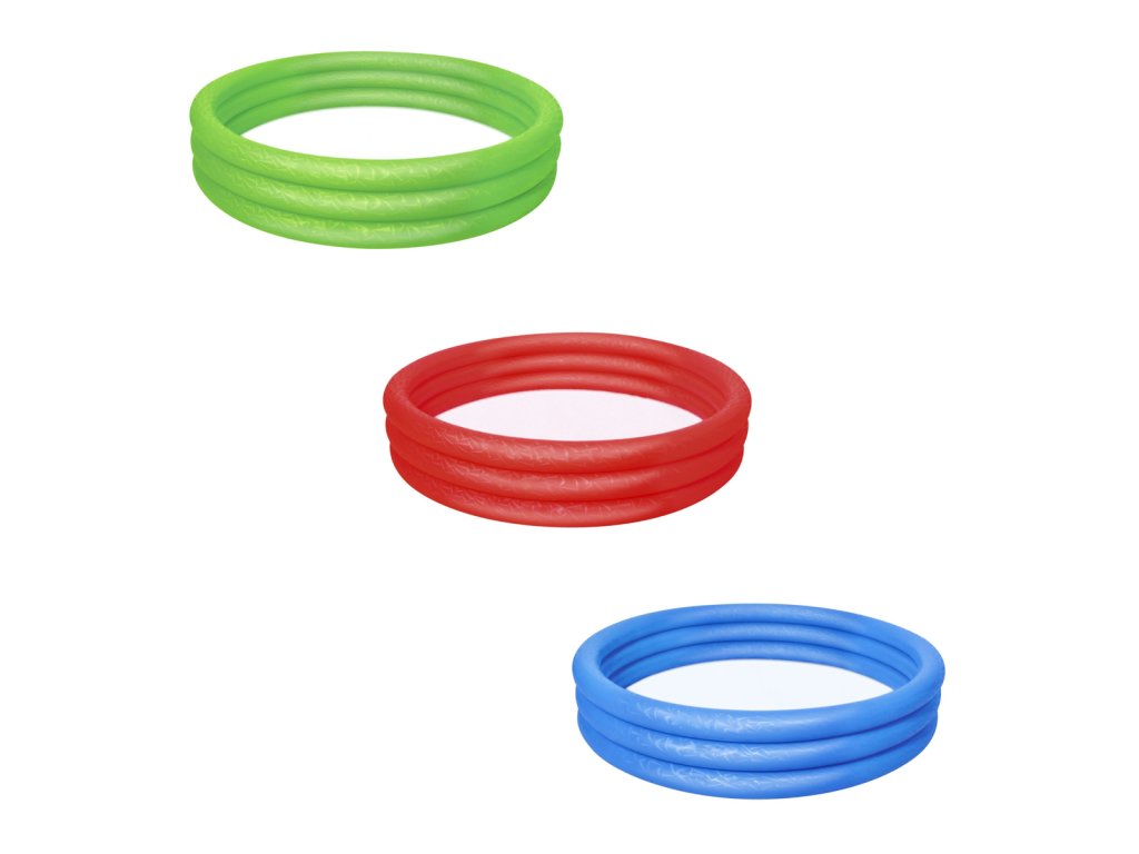 Dětský nafukovací bazének Bestway v červené, modré či zelené variantě je ideální pro osvěžení malých dětí. Skládá se ze 3 stejných kruhů, které jsou vhodné také jako opěra dětí. Vyrobeno z bezpečného a odolného vinylu. Bezpečnostní ventily. Obsahuje: 1 nafukovací bazének, 1 opravná sada. Max. kapacita: 480 l. Rozměr: 183 x 33 cm. Věk: 2+. Užívání vždy pod dohledem dospělé osoby.