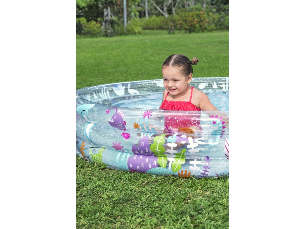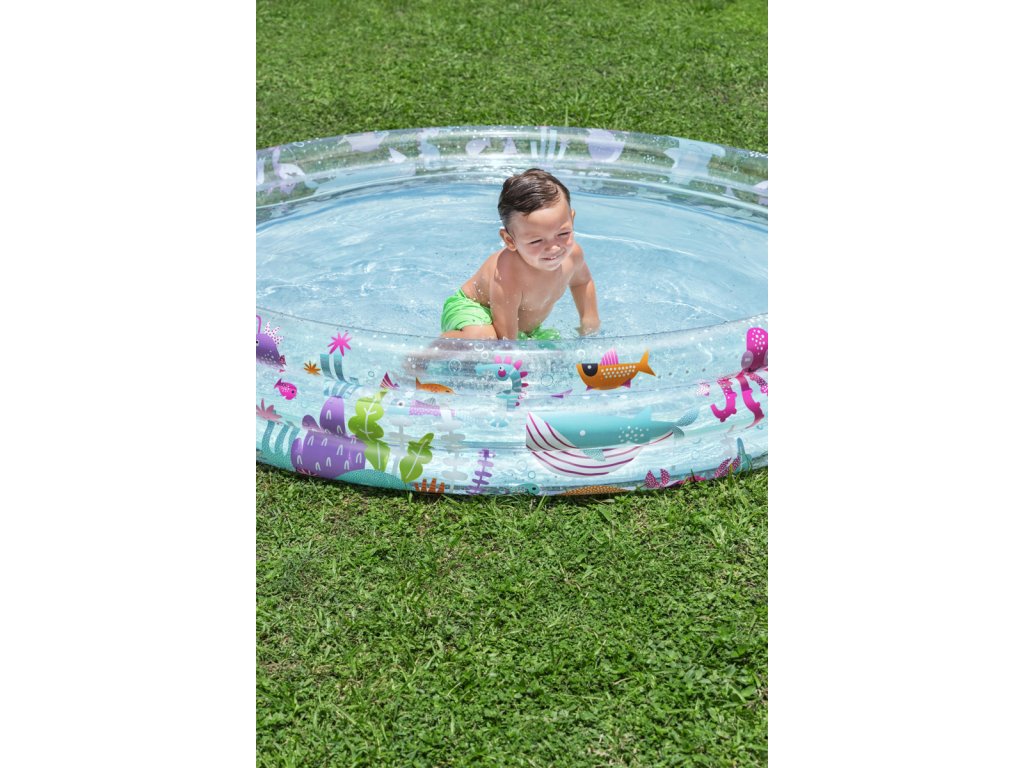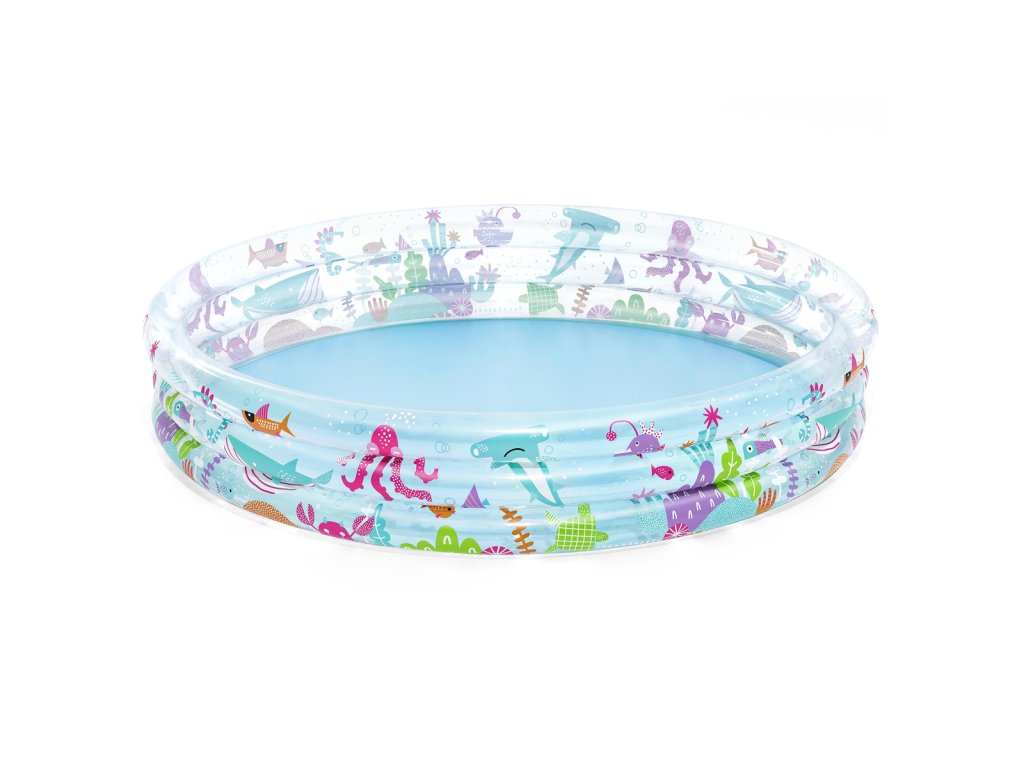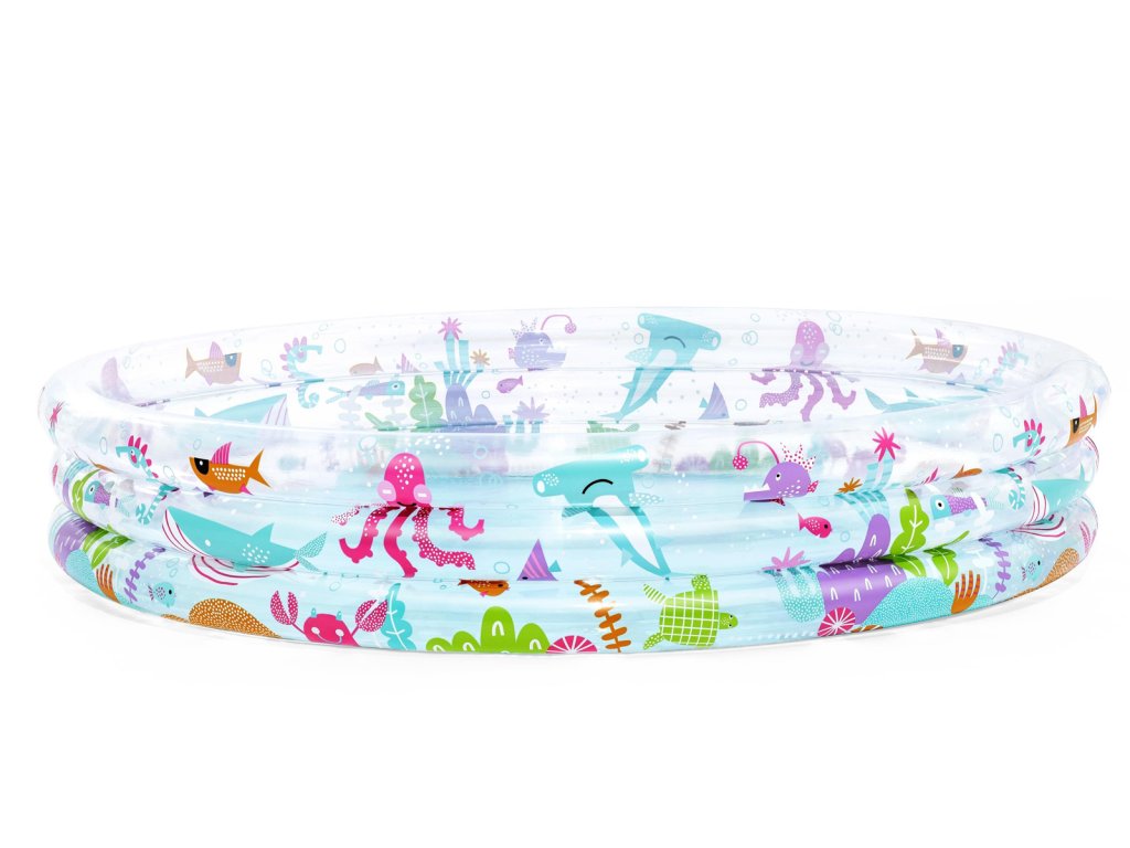 Nafukovací bazén s motivem rybiček pro malé potápěče. Bazén má 3 kruhové, průhledné prstence s potiskem podmořského světa. Max. kapacita vody: 480 L. Rozměr: 183x33 cm. Věk: 2+ (pod dohledem dospělé osoby).