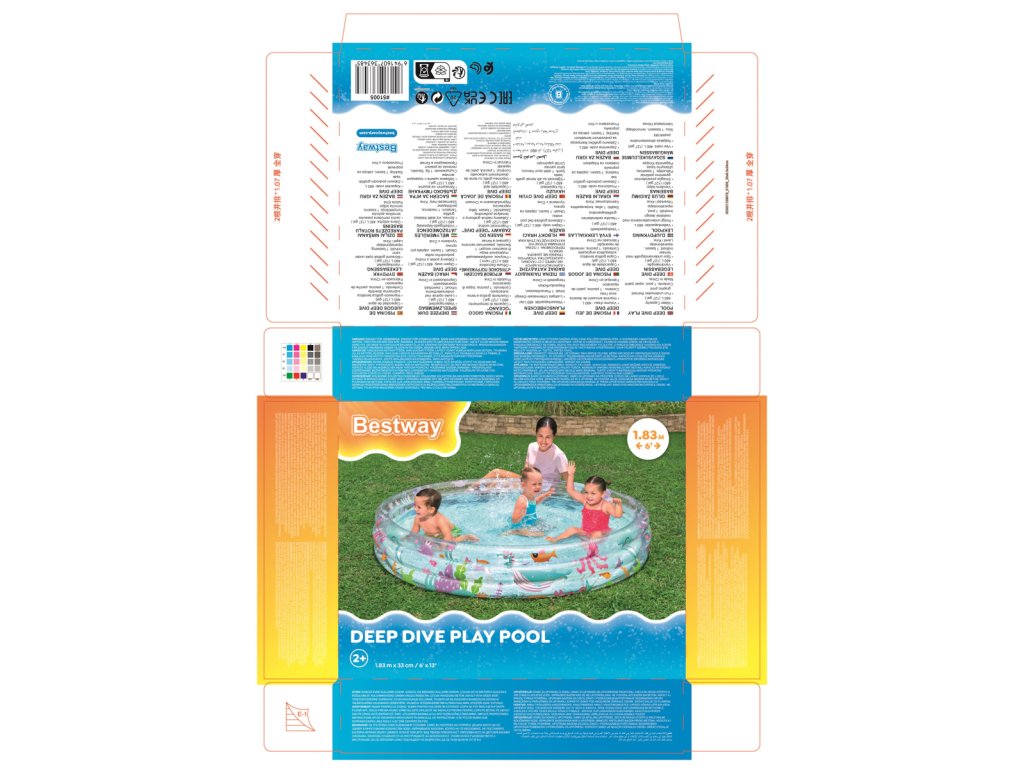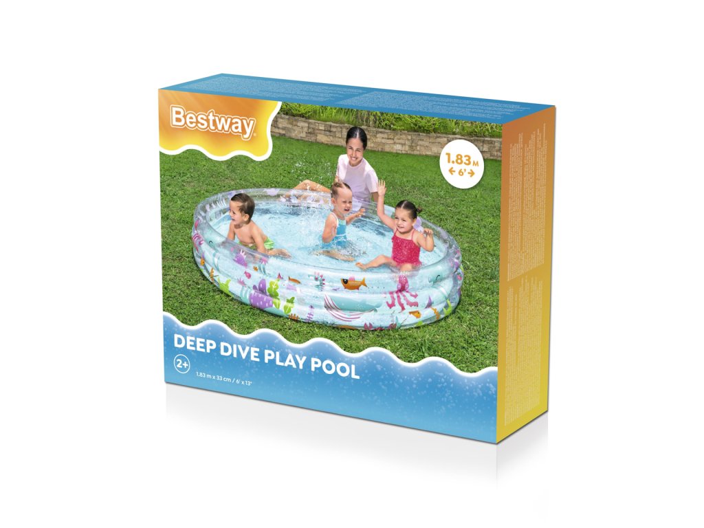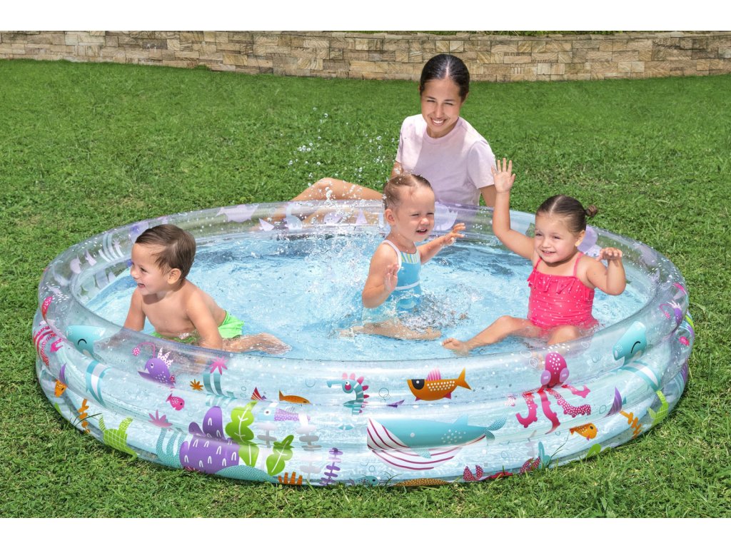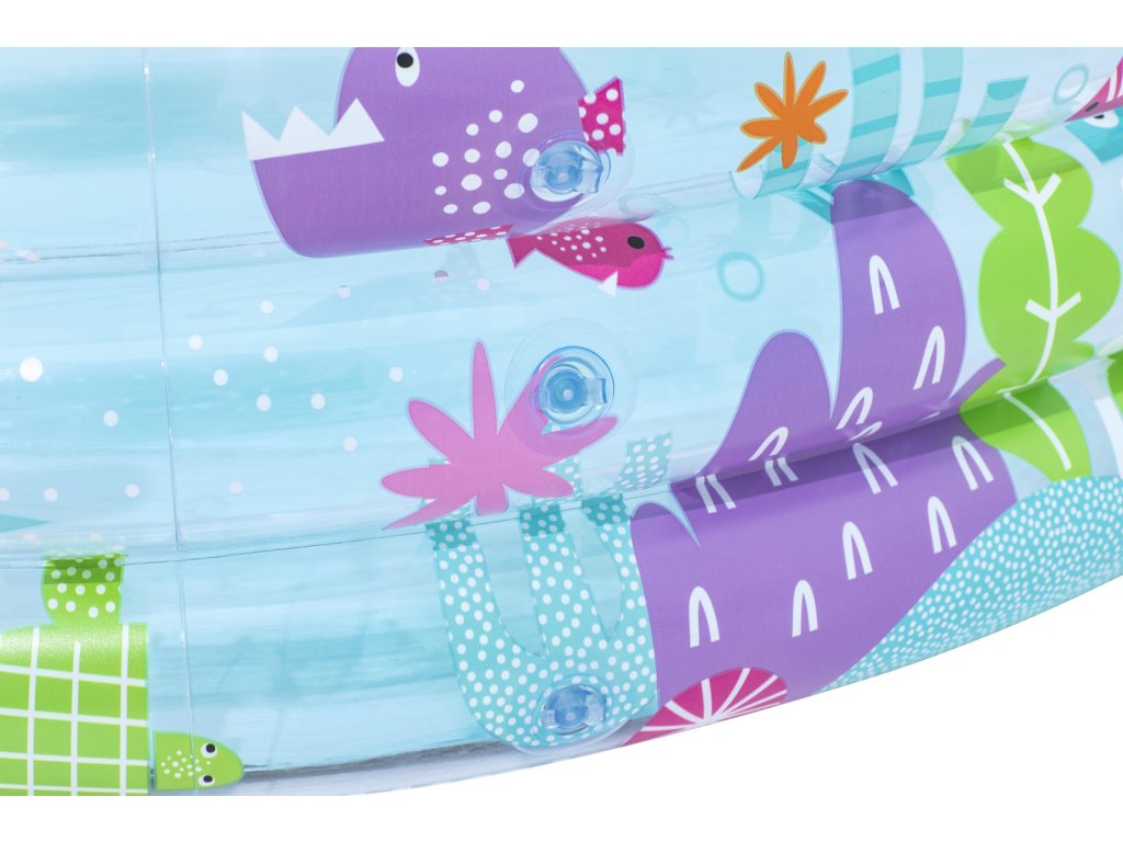 Nafukovací bazén s motivem rybiček pro malé potápěče. Bazén má 3 kruhové, průhledné prstence s potiskem podmořského světa. Max. kapacita vody: 480 L. Rozměr: 183x33 cm. Věk: 2+ (pod dohledem dospělé osoby).