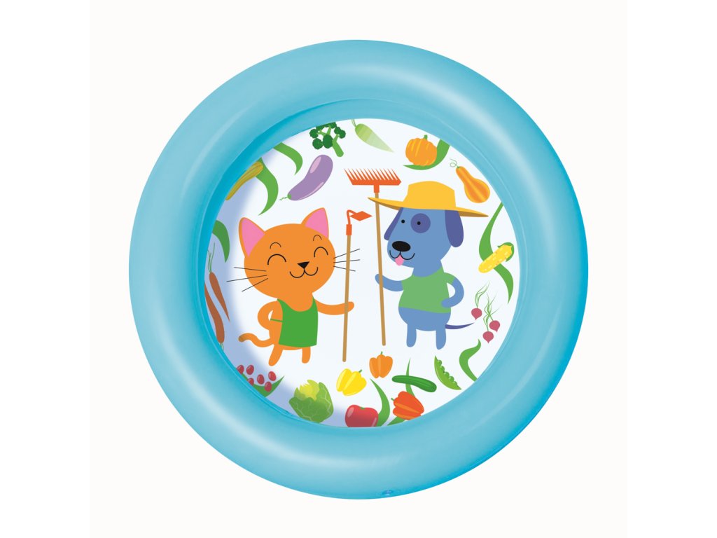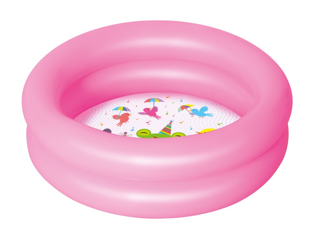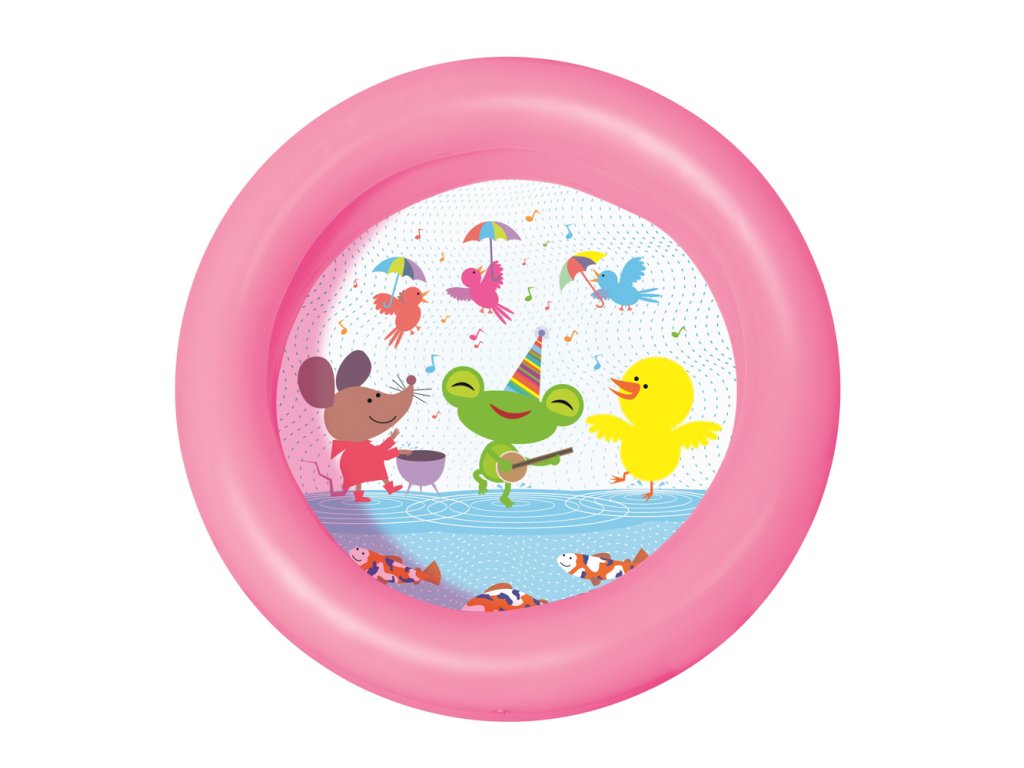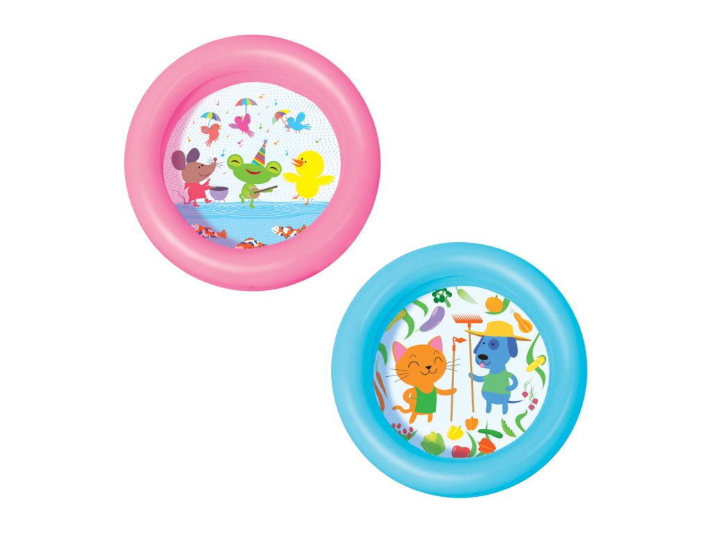Nafukovací bazének s veselými obrázky na podlaze. Bazén má 2 barevné prstence v pastelových barvách. V nabídce ve dvou barevných provedeních ( růžová/modrá). Max. kapacita vody: 21 L. Rozměr: 61x15 cm. Věk: 2+ (pod dohledem dospělé osoby).