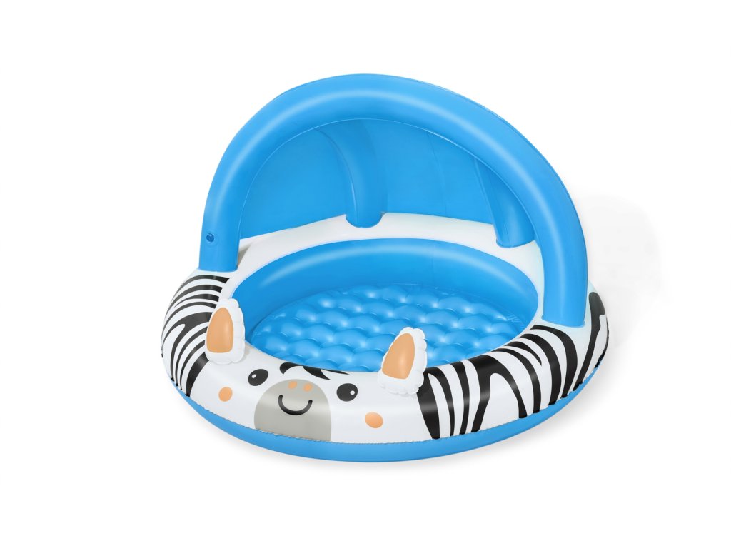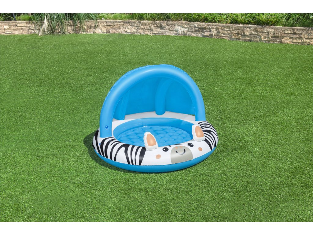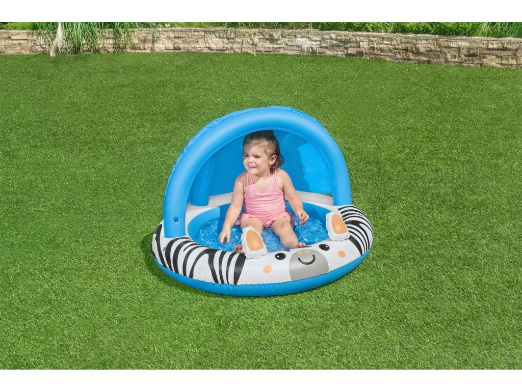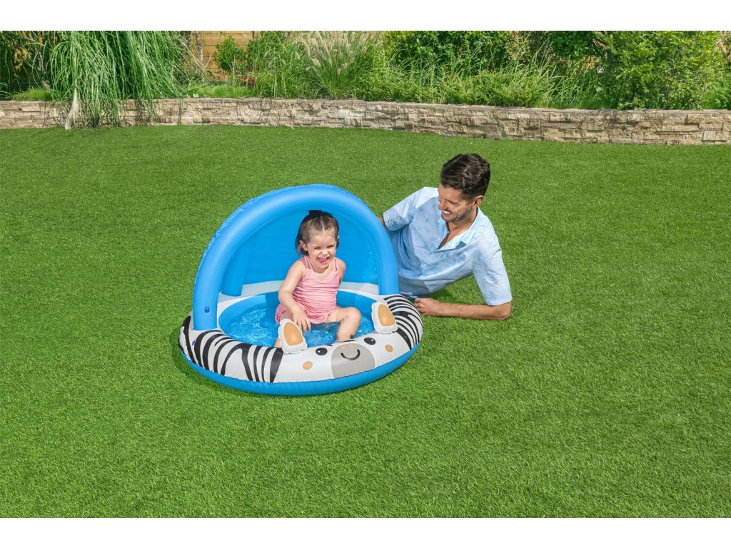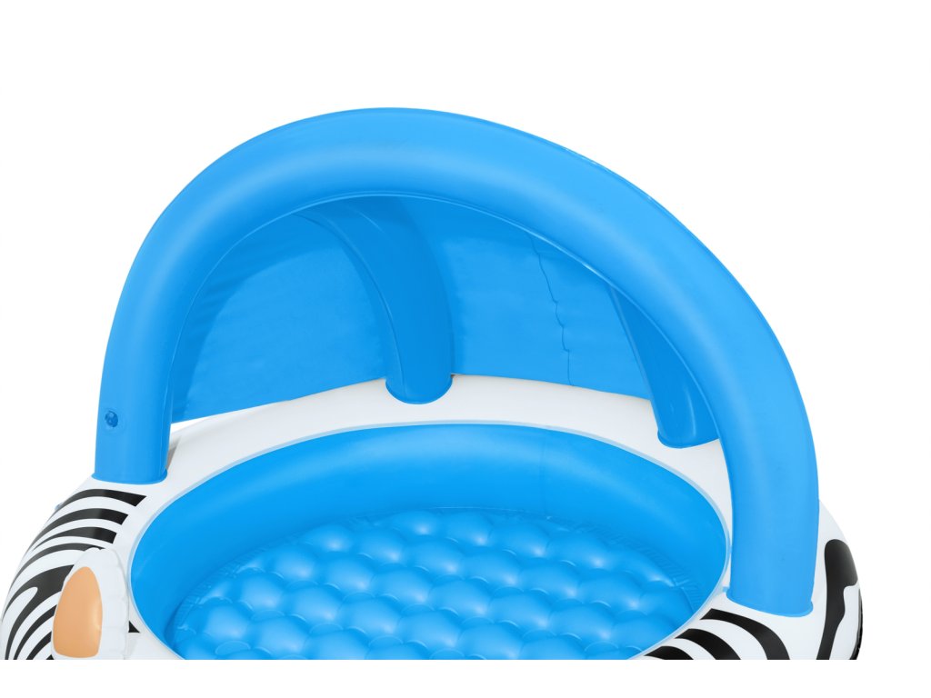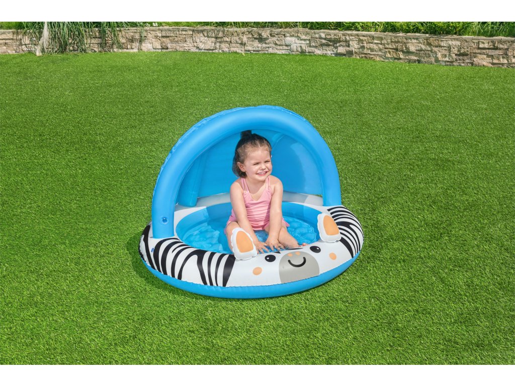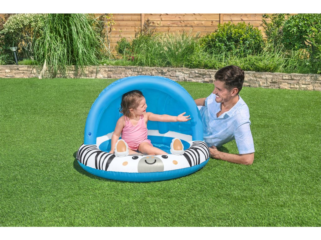 Dětský bazén se stříškou v designu zebry. Nafukovací stříška účinně chrání dítě proti přímému slunci. Měkký nafukovací podlaha. Díky svým rozměrům lze bazének použít na zahradě, pískovišti, terase či balkóně. Pojistné ventily proti úniku vzduchu. Rozměr: 97x66 cm. Věk: 2+. Max. kapacita vody: 26 l.