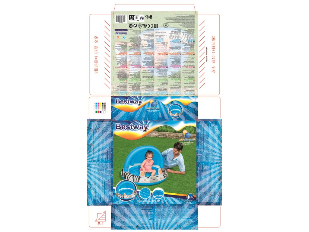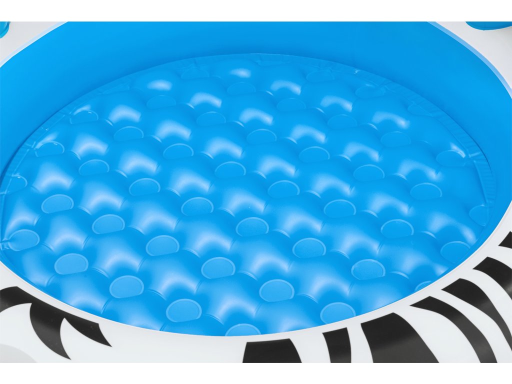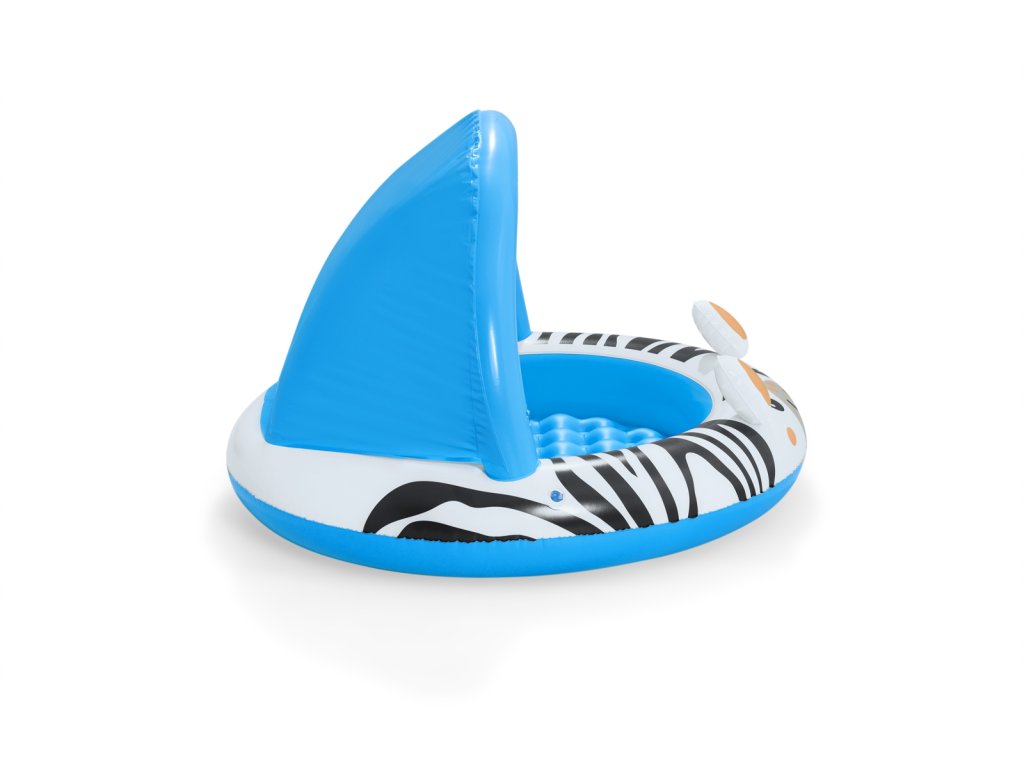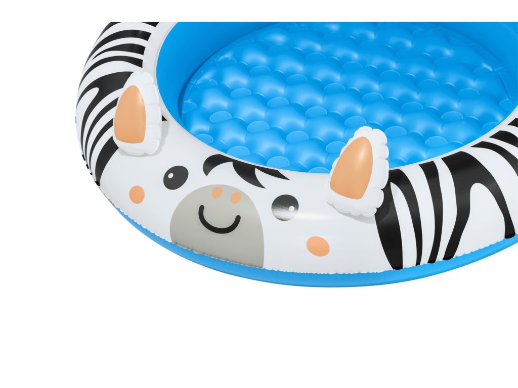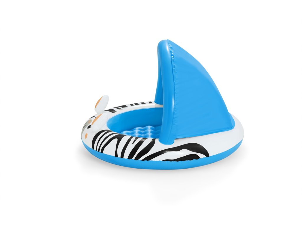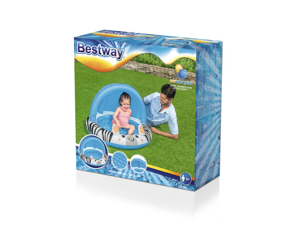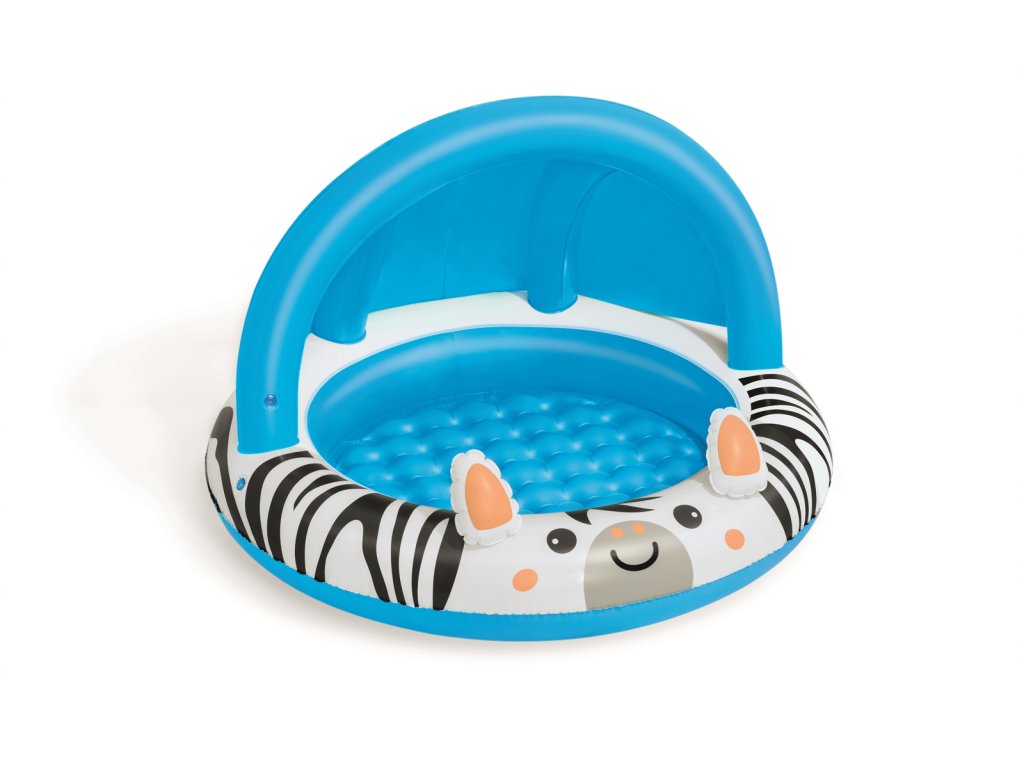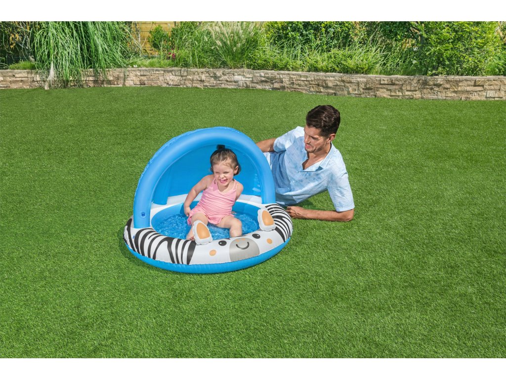 Dětský bazén se stříškou v designu zebry. Nafukovací stříška účinně chrání dítě proti přímému slunci. Měkký nafukovací podlaha. Díky svým rozměrům lze bazének použít na zahradě, pískovišti, terase či balkóně. Pojistné ventily proti úniku vzduchu. Rozměr: 97x66 cm. Věk: 2+. Max. kapacita vody: 26 l.