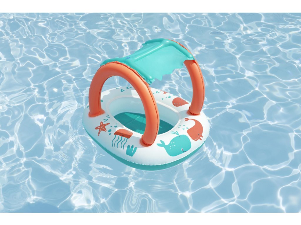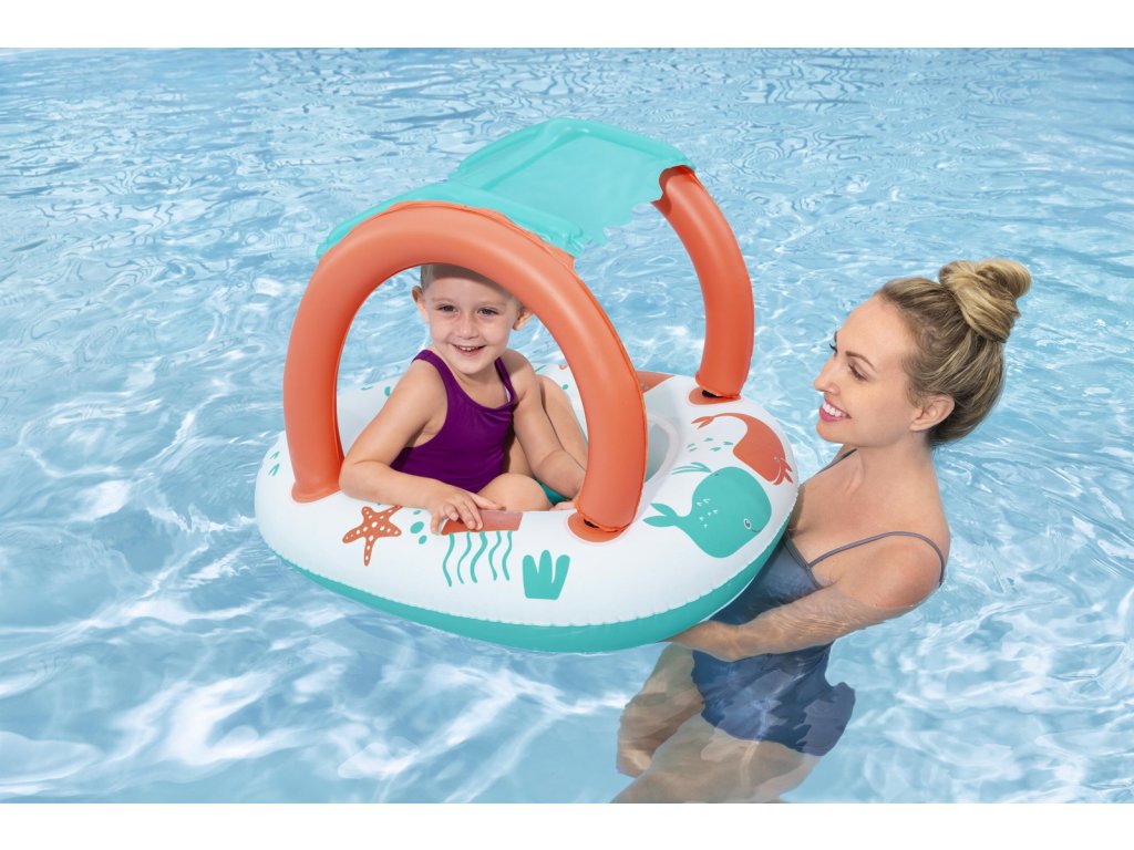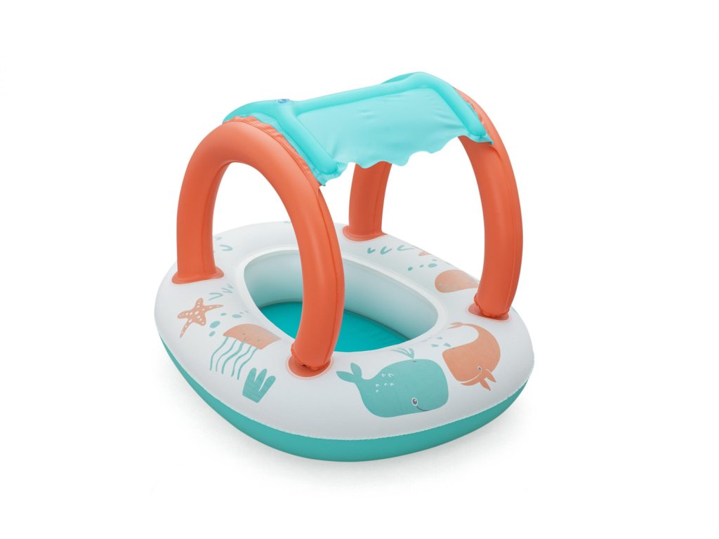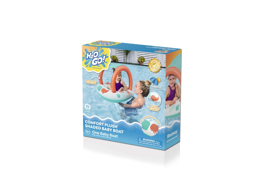 Dětský nafukovací člun se stříškou Bestway Comfort Plush je ideální pro malé děti o hmotnosti 11-15 kg. Tato loď má sluneční clonu blokující UV záření, která chrání jemnou dětskou pokožku, a je snadno odnímatelná díky uchycení na suchý zip. Děti se do nich mohou snadno dostat a vystoupit. Měkký, hladký sametový materiál Comfort Plush poskytuje dětem pohodlí. Barva materiálu se ve vodě stává jasnější a intenzivnější. Dvě vzduchové komory a bezpečnostní ventily dodávají této dětské lodi stabilitu a bezpečnost. Dětská loď Bestway Comfort Plush kombinuje pohodlí, bezpečnost a zábavu pro malé plavce. Pomáhá dětem zvykat si na vodu v útlém věku. Nafouknutá velikost člunu: 56,5 x 61,5 x 78 cm. Nenafouknutá velikost člunu: 67 x 84 cm. Rozměry balení: 19,8 x 19,8 x 5 cm. Určeno pro 1 osobu. Maximální nosnost: 30 kg. Používejte pouze pod dohledem dospělé osoby. Věk: 3+
