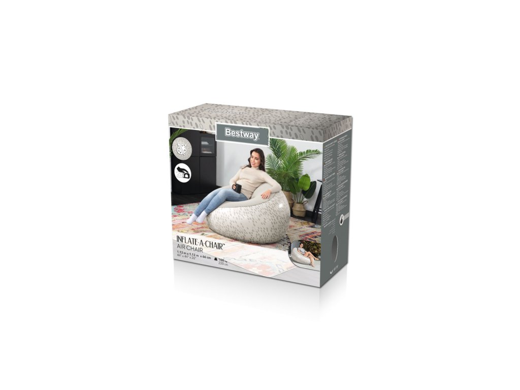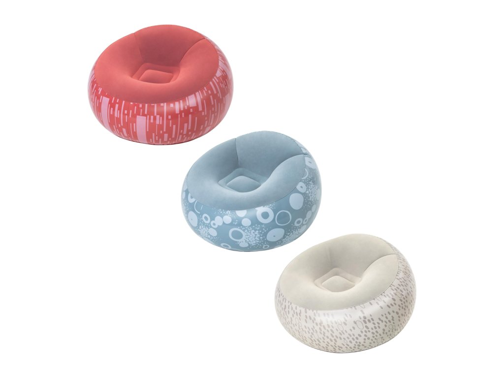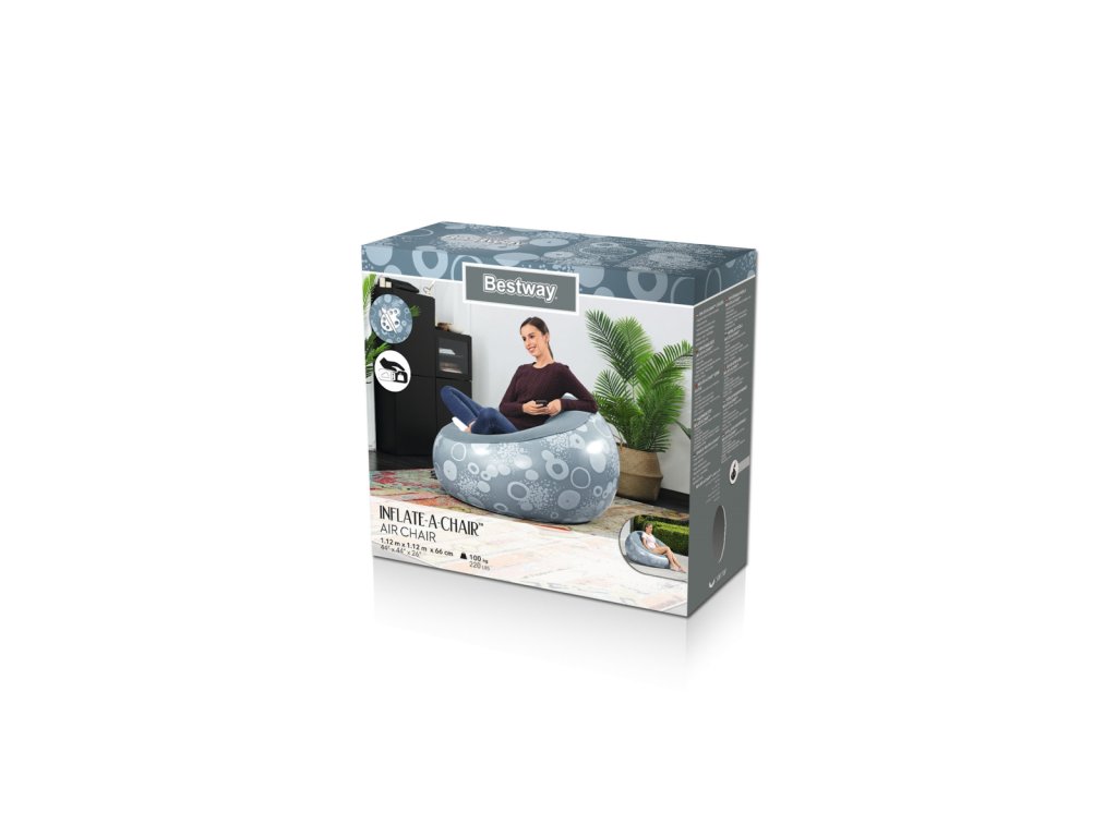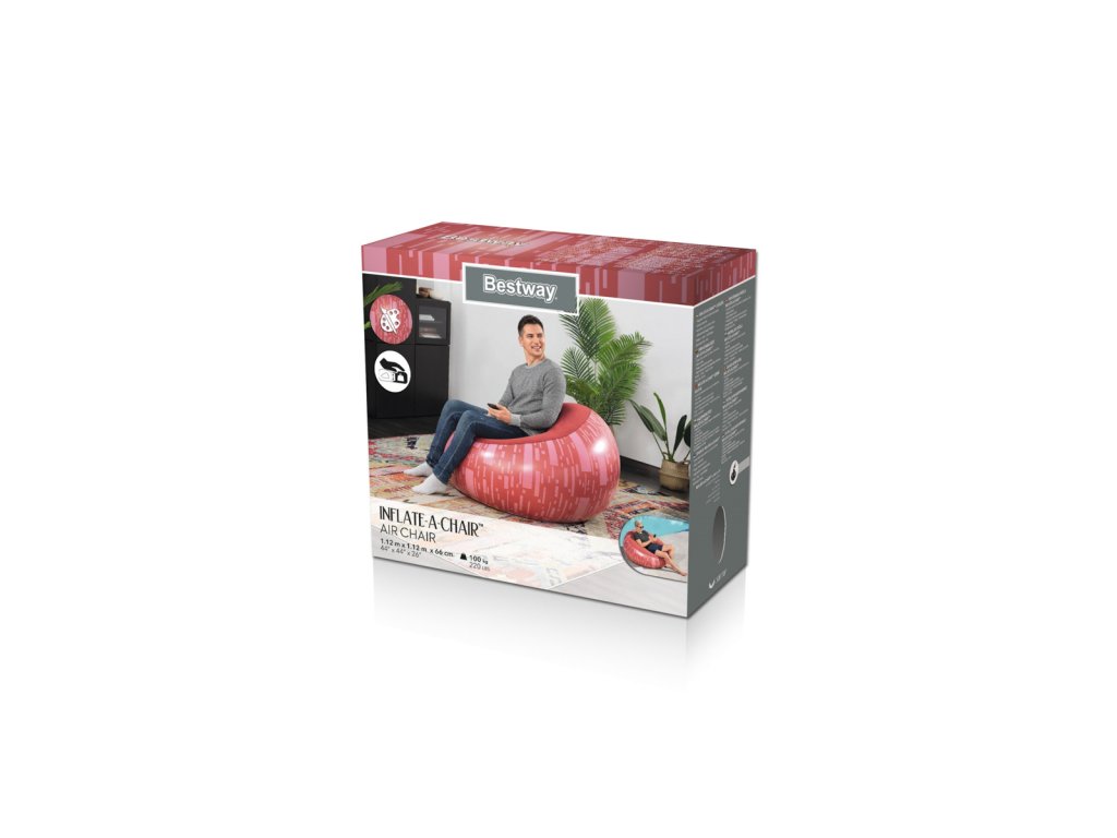 Nafukovací křeslo Bestway® Inflate-A-Chair™ díky svým jedinečným vlastnostem jistě splní očekávání i těch nejnáročnějších uživatelů. Křeslo má robustní konstrukci s dvěma vzduchovými komorami a je vyrobeno z odolného PVC. Dvoucestný ventil s aretací pro rychlé a snadné nafouknutí a vyfouknutí. Skvělý pro vnitřní i venkovní použití. Opravná záplata je součástí balení. Křeslo je určeno pro 1 osobu. Maximální nosnost 100 kg. Assort je náhodný mix modelů. Výběr nelze ovlivnit. 3 barevné designy se sametovým povrchem k sezení. Nafouknutý rozměr křesla: 66 x 112 x 112 cm. Rozměry balení: 23 x 25 x 11 cm.