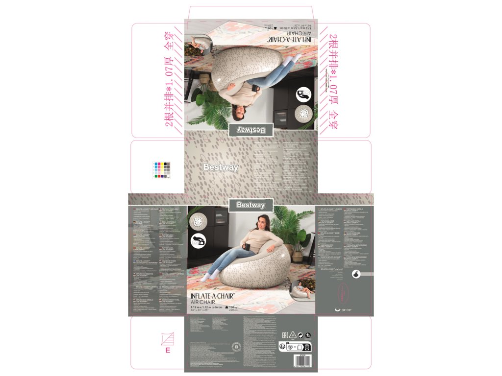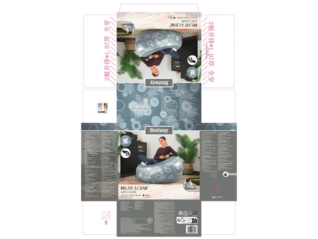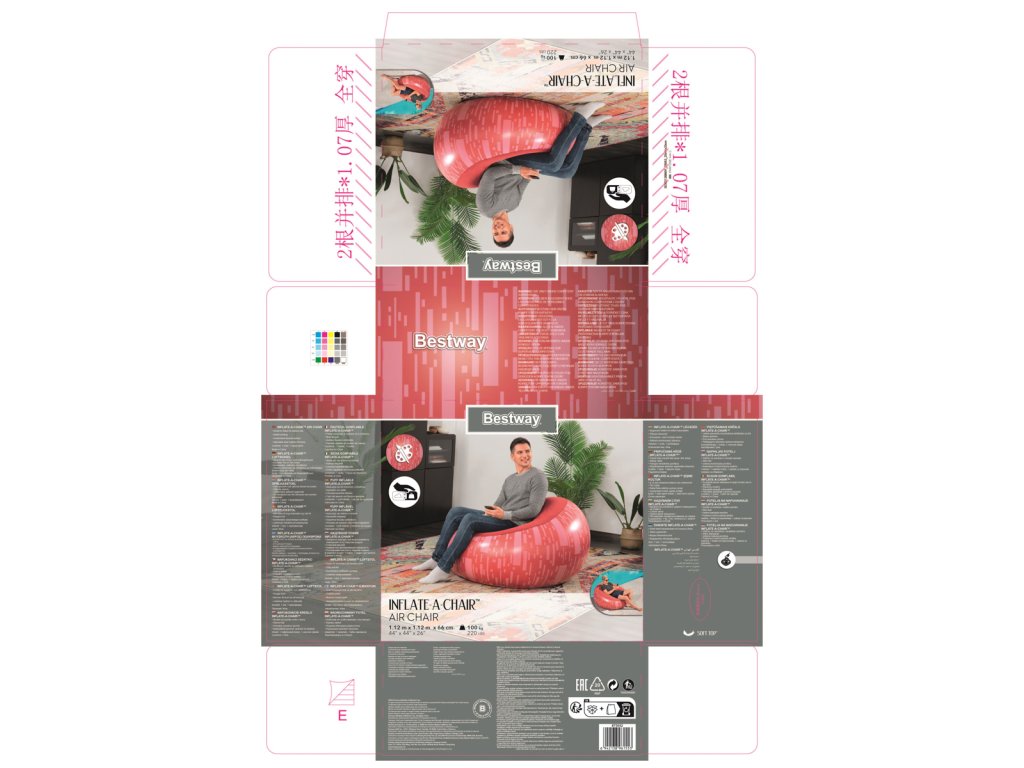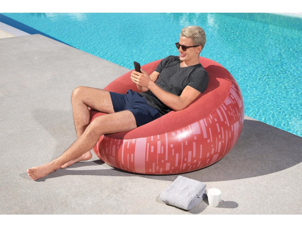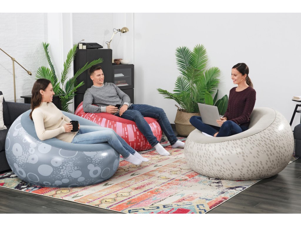 Nafukovací křeslo Bestway® Inflate-A-Chair™ díky svým jedinečným vlastnostem jistě splní očekávání i těch nejnáročnějších uživatelů. Křeslo má robustní konstrukci s dvěma vzduchovými komorami a je vyrobeno z odolného PVC. Dvoucestný ventil s aretací pro rychlé a snadné nafouknutí a vyfouknutí. Skvělý pro vnitřní i venkovní použití. Opravná záplata je součástí balení. Křeslo je určeno pro 1 osobu. Maximální nosnost 100 kg. Assort je náhodný mix modelů. Výběr nelze ovlivnit. 3 barevné designy se sametovým povrchem k sezení. Nafouknutý rozměr křesla: 66 x 112 x 112 cm. Rozměry balení: 23 x 25 x 11 cm.