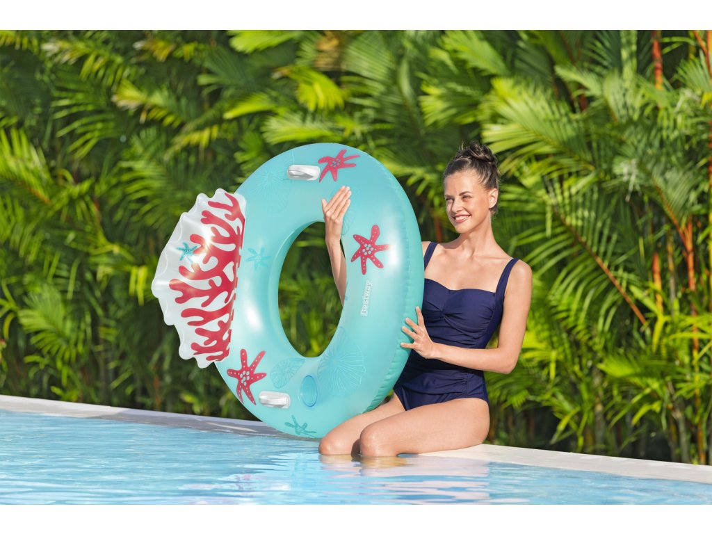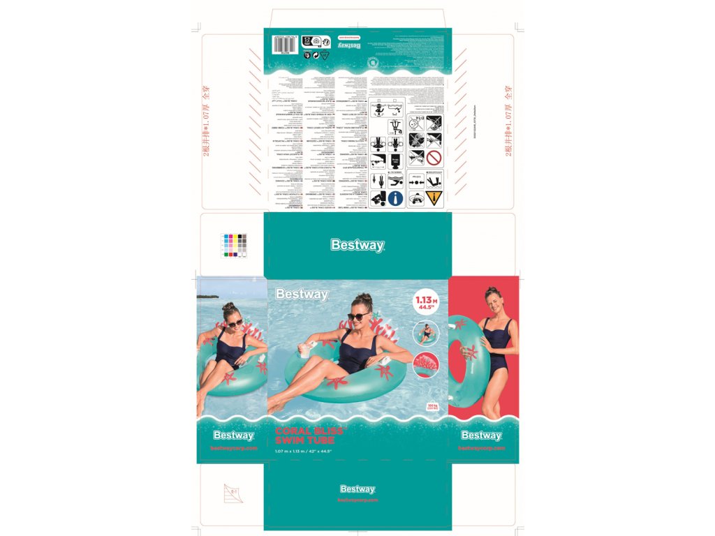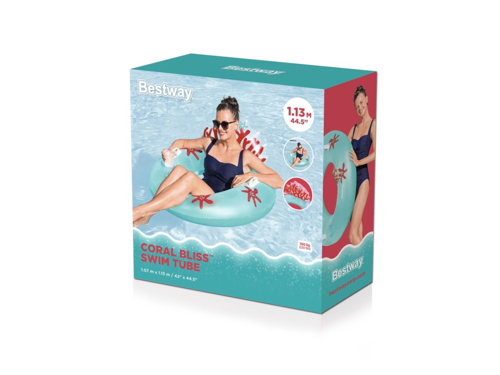Bestway® Nafukovací kruh Coral Bliss™ umožní malým i větším plavcům užít si zábavu ve vodě. Vyrobený je z velmi kvalitního a odolného PVC materiálu a disponuje průměrem 113 cm. Kruh Bestway je vybaven opěradlem, madly a prostorem na láhev nebo plechovku s vaším oblíbeným pitím. Kruh má dvě vzduchové komory a jeho krásný design a pěkné oku lahodící barvy upoutají pozornost každého milovníka relaxace v moři či bazénu. Včetně opravné záplaty. Nenafouknutá velikost kruhu: O 113. Rozměry balení: 24 x 24 x 9 cm. Určeno pro 1 osobu. Maximální nosnost: 100 kg. Věk: 14+