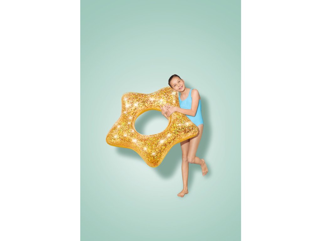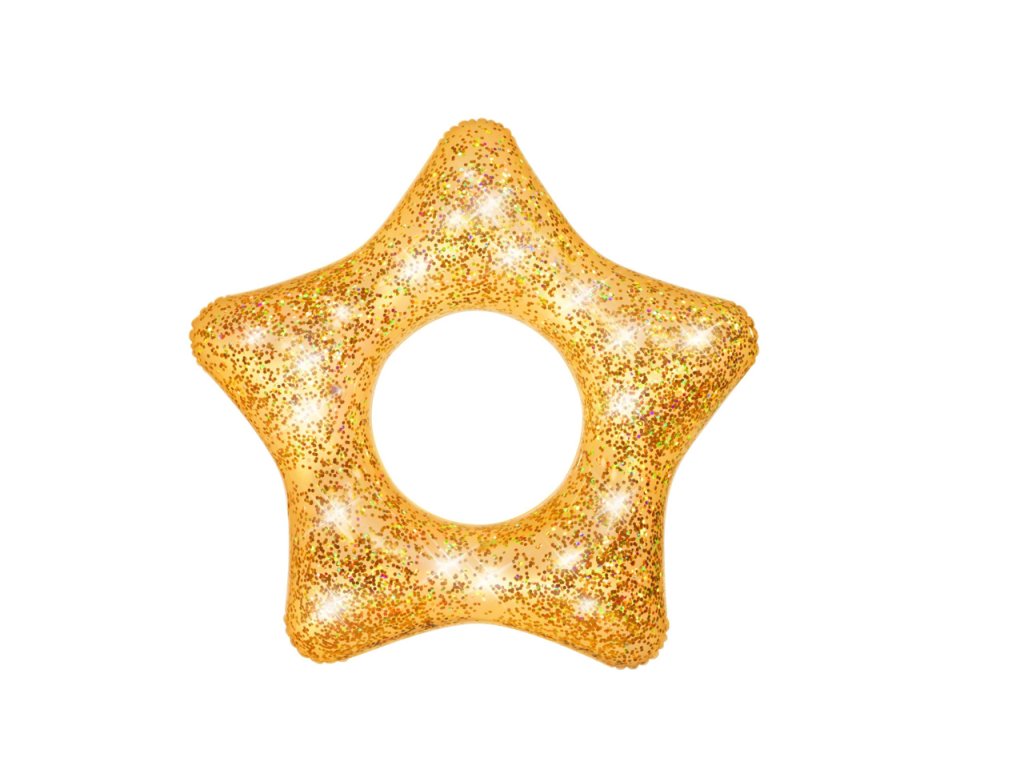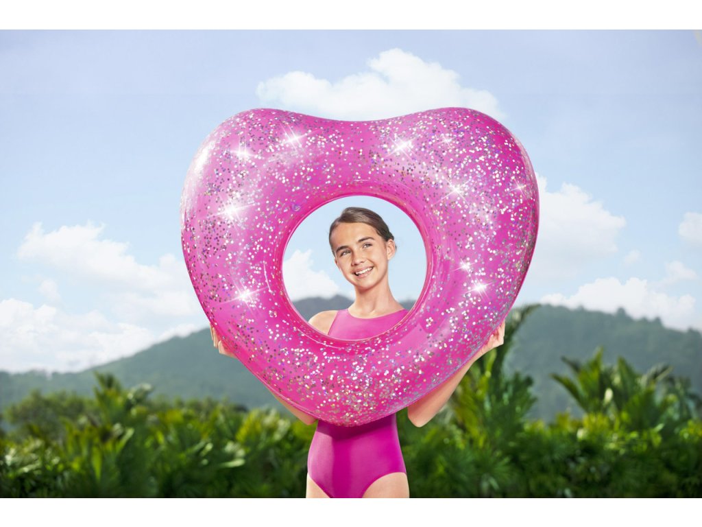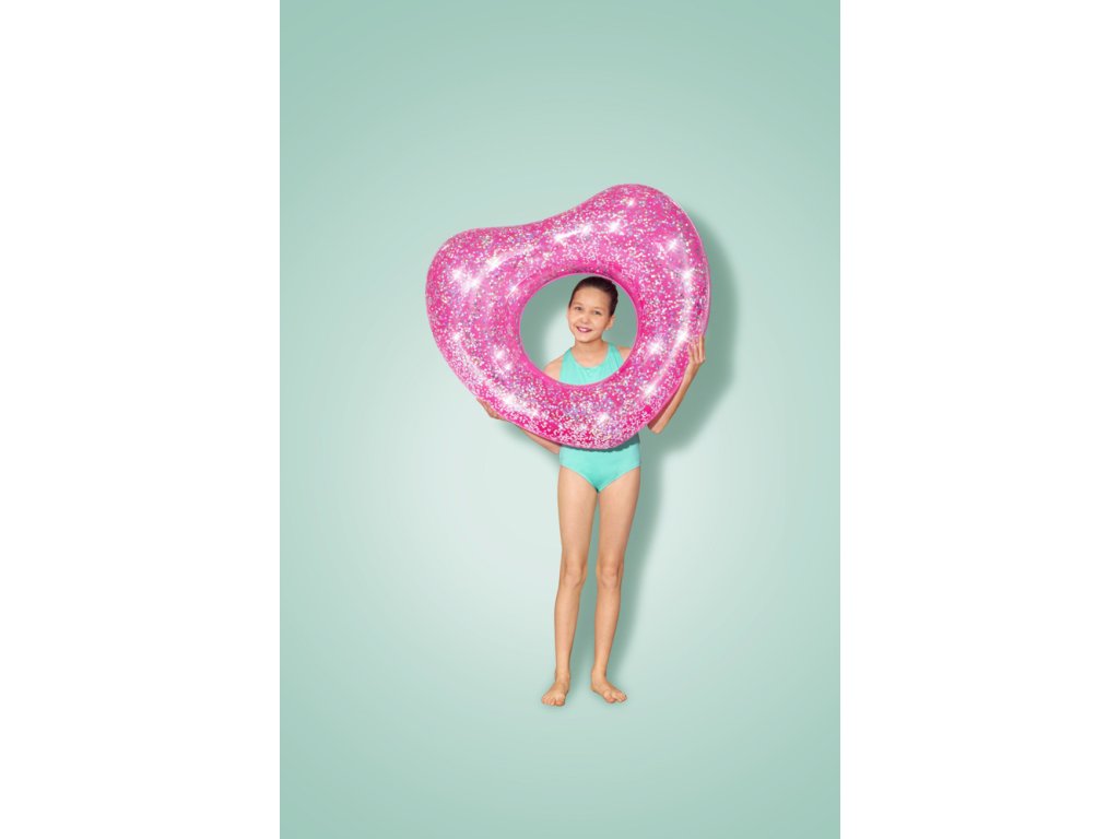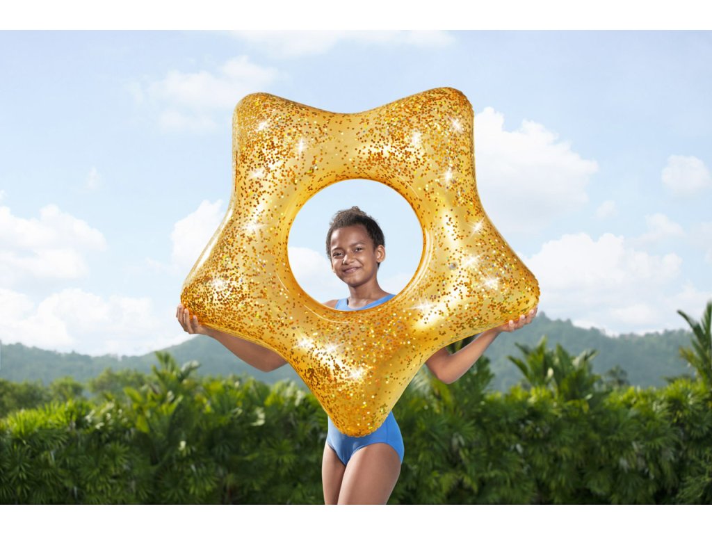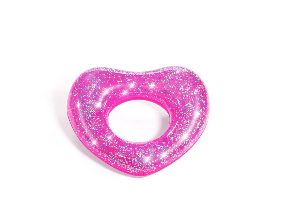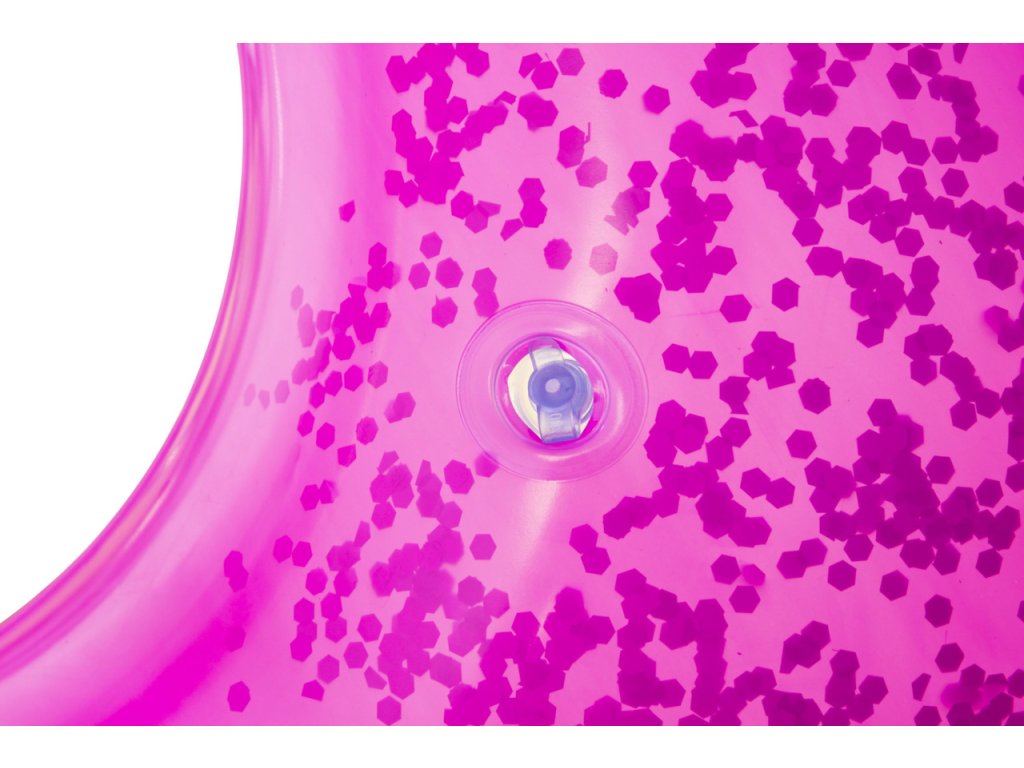 Nafukovací plážový kruh plný třpytek. Barevné třpytky v kruhu se na slunci třpytí a vytvářejí atraktivní efekty. Kruh je v provedení růžového srdce nebo zlaté hvězdy. Vyrobeno z kvalitního a odolného vinylu. Průměr: 91 cm. Rozměr balení: 33 x 19 x 1,5 cm. Věk: 10+. Používejte pouze pod dohledem dospělé osoby.