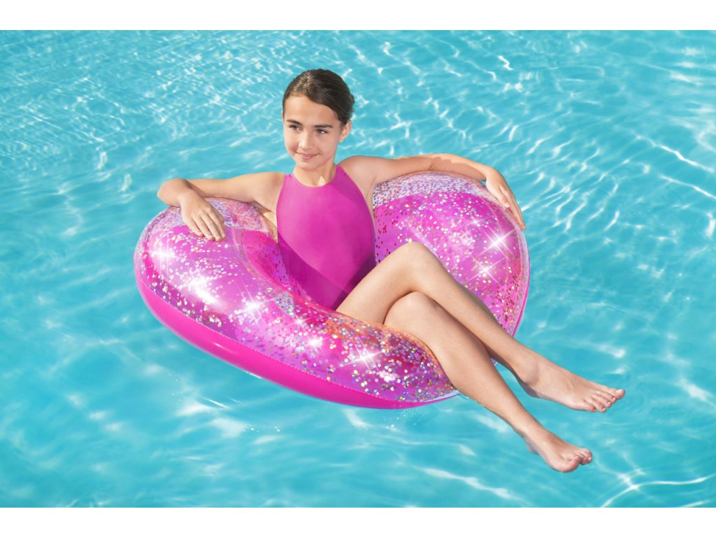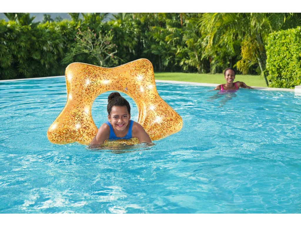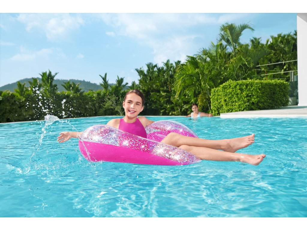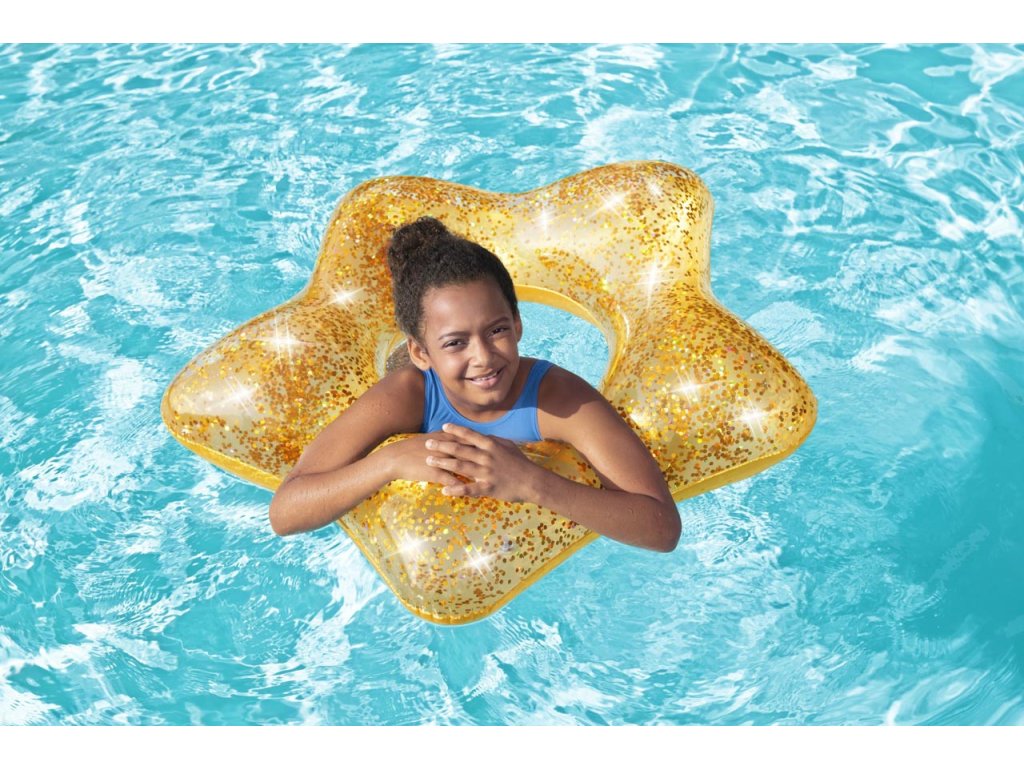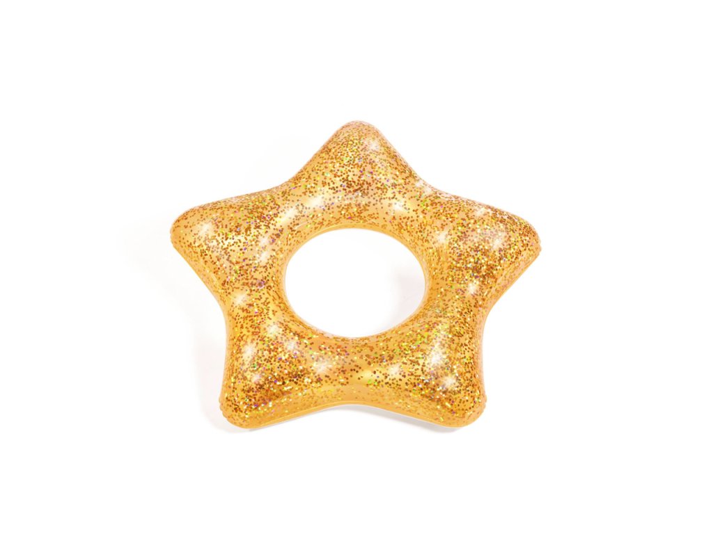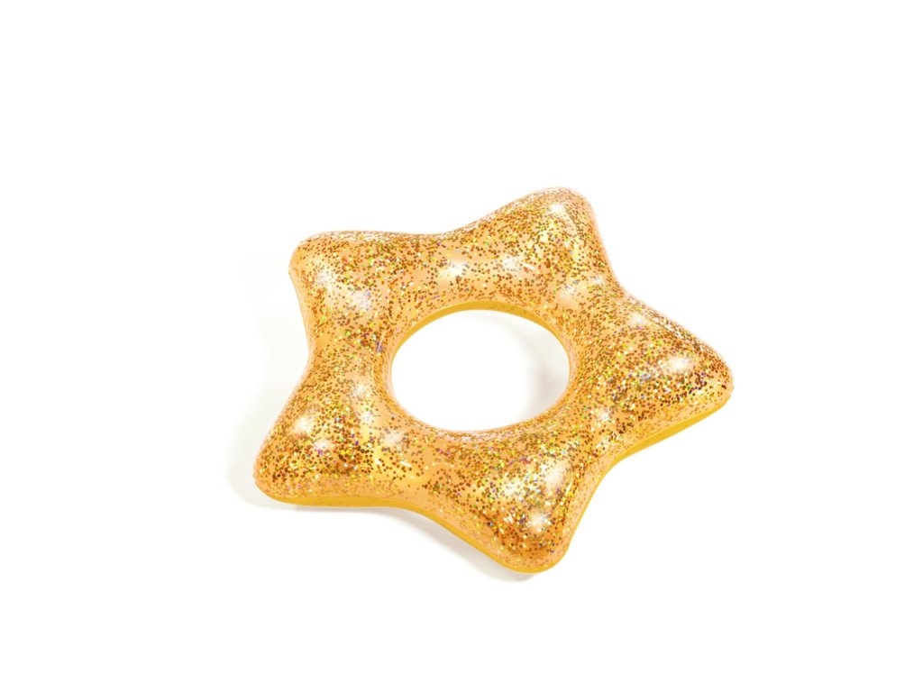 Nafukovací plážový kruh plný třpytek. Barevné třpytky v kruhu se na slunci třpytí a vytvářejí atraktivní efekty. Kruh je v provedení růžového srdce nebo zlaté hvězdy. Vyrobeno z kvalitního a odolného vinylu. Průměr: 91 cm. Rozměr balení: 33 x 19 x 1,5 cm. Věk: 10+. Používejte pouze pod dohledem dospělé osoby.