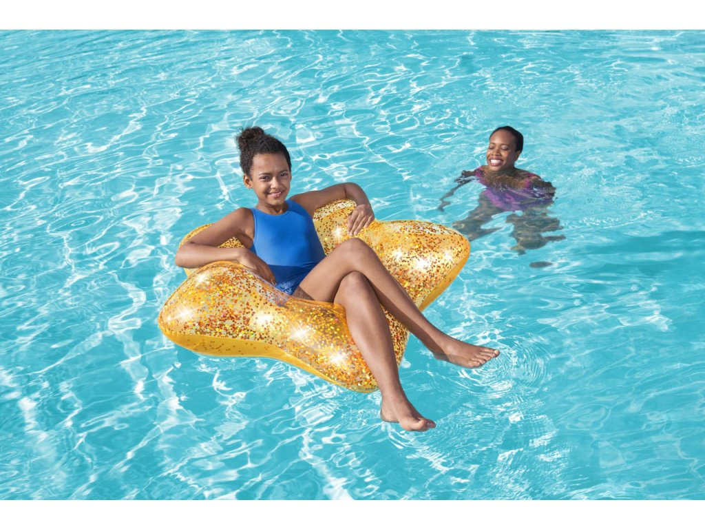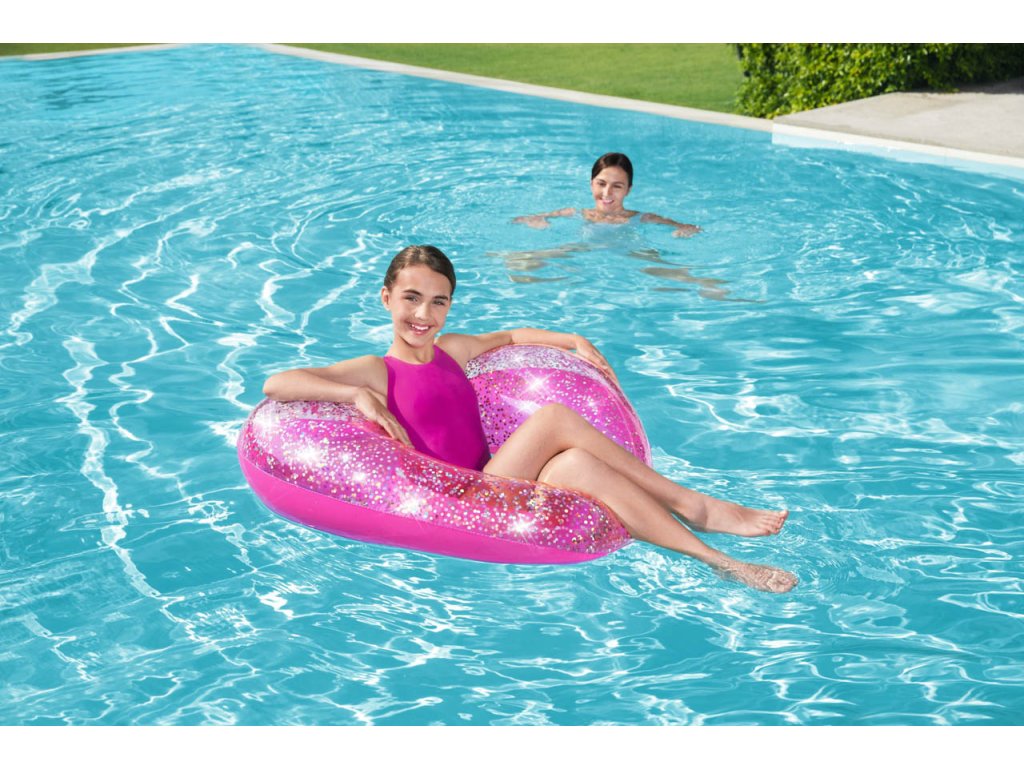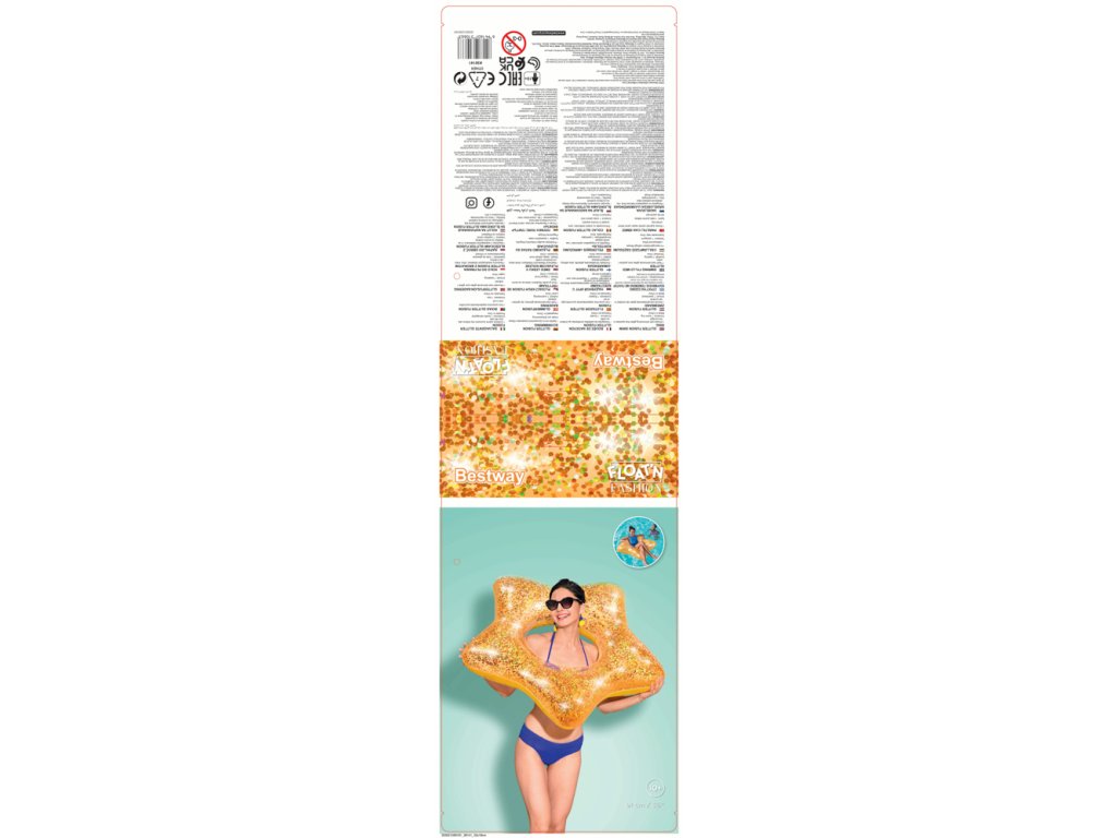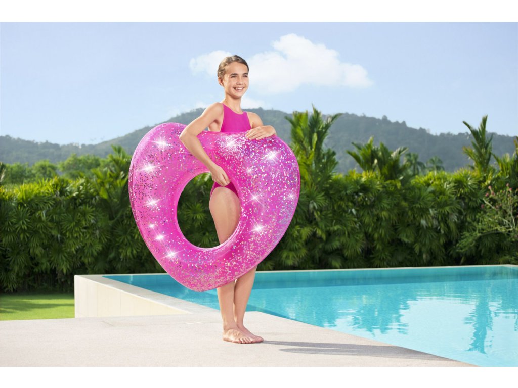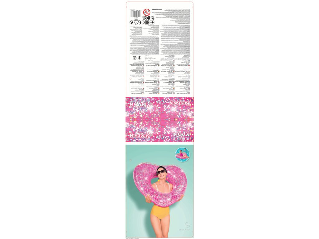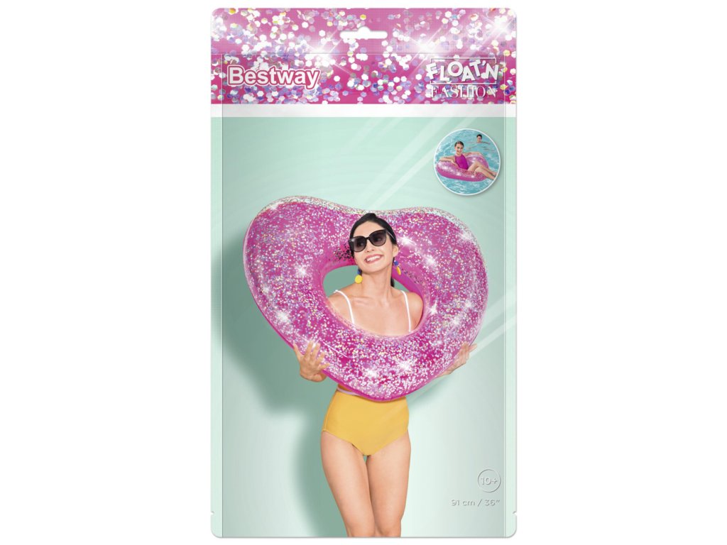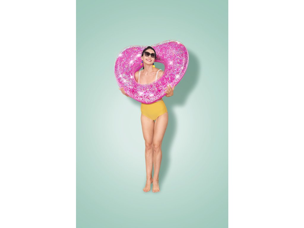 Nafukovací plážový kruh plný třpytek. Barevné třpytky v kruhu se na slunci třpytí a vytvářejí atraktivní efekty. Kruh je v provedení růžového srdce nebo zlaté hvězdy. Vyrobeno z kvalitního a odolného vinylu. Průměr: 91 cm. Rozměr balení: 33 x 19 x 1,5 cm. Věk: 10+. Používejte pouze pod dohledem dospělé osoby.