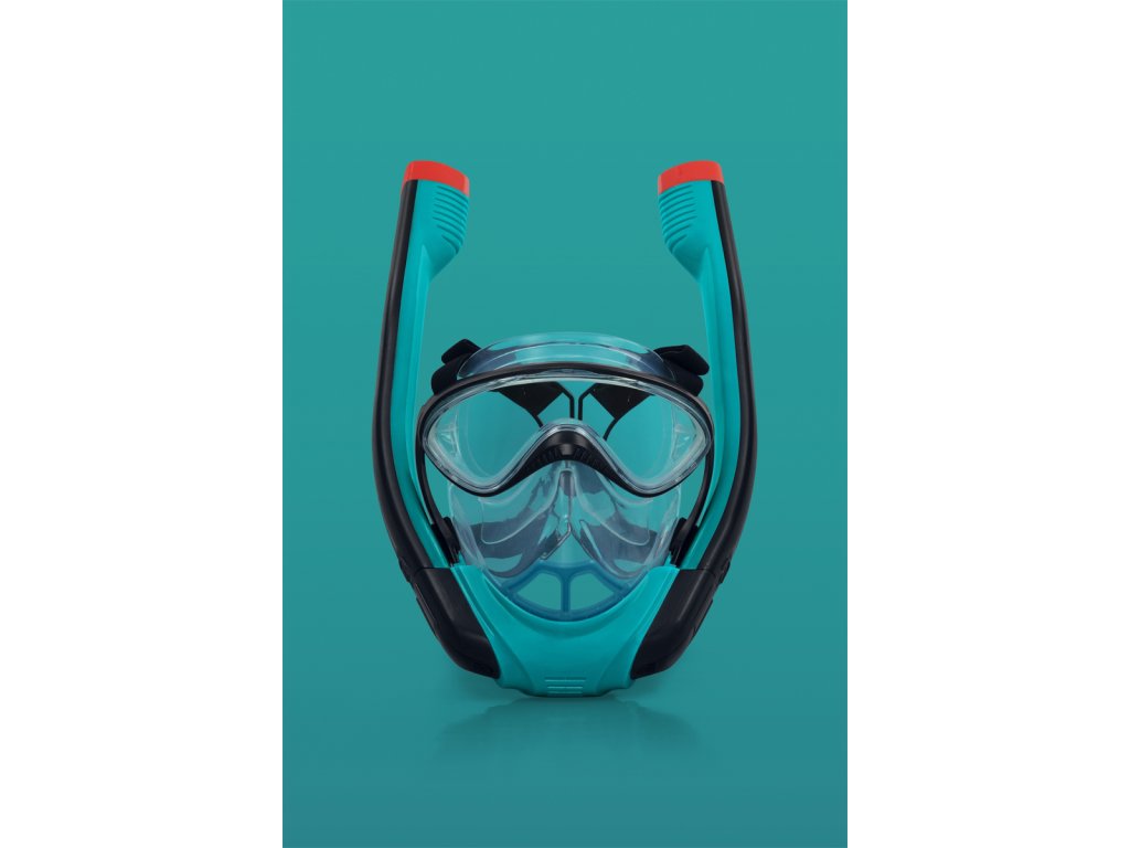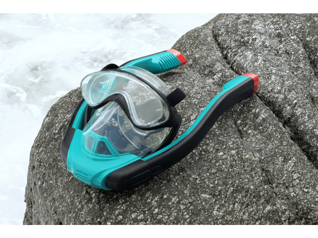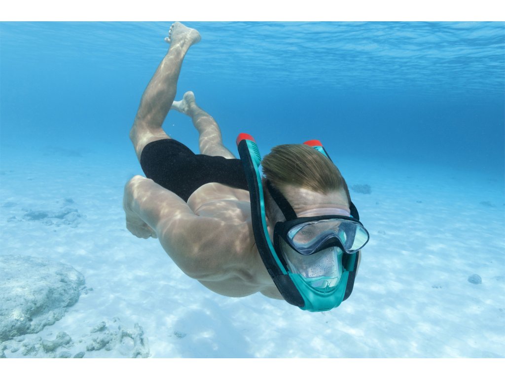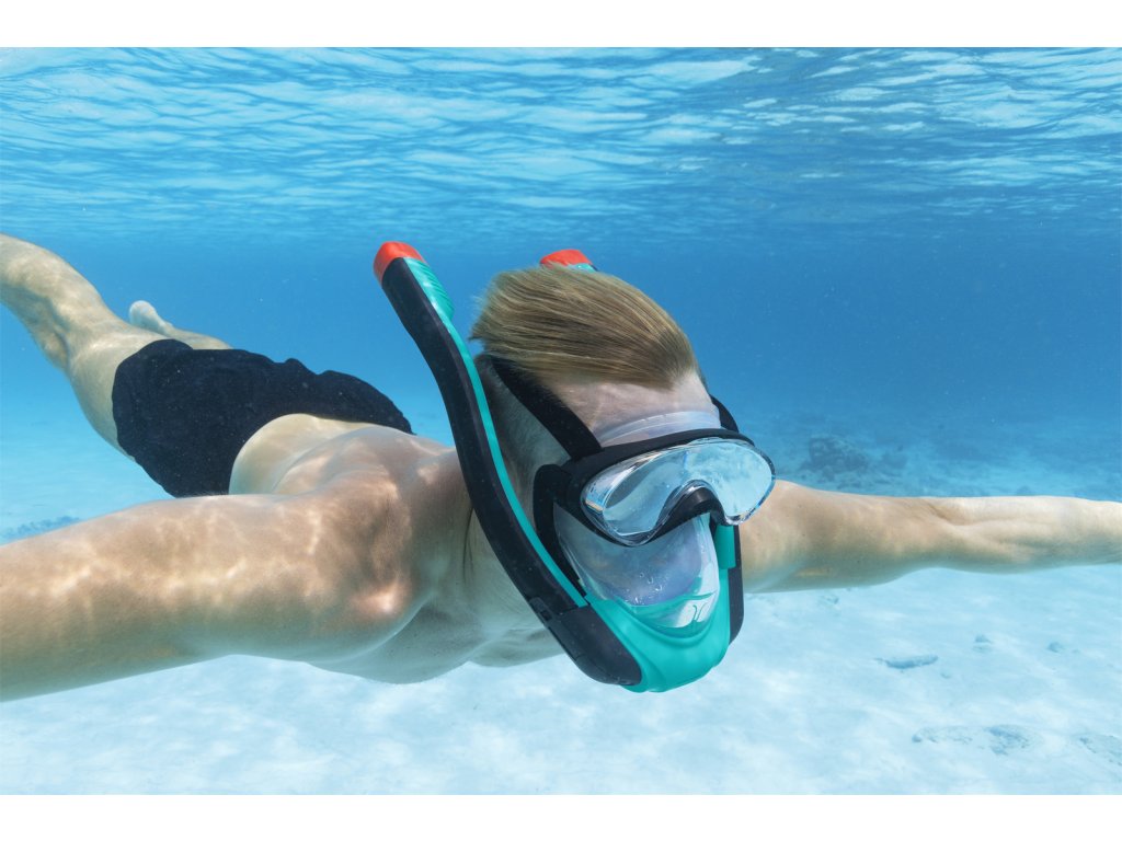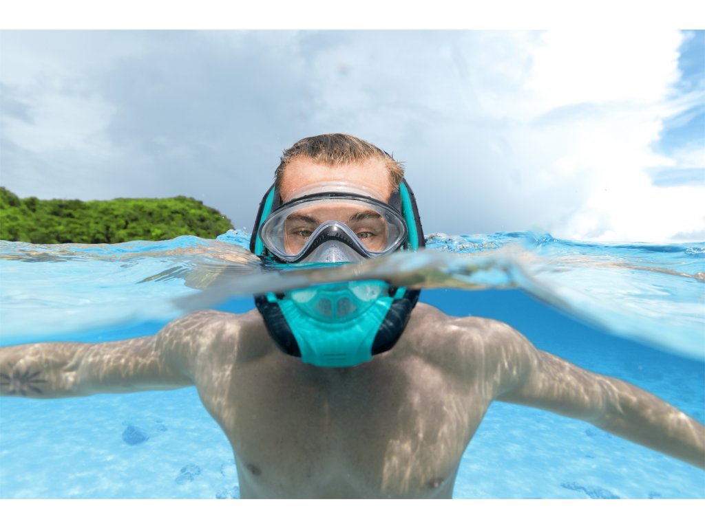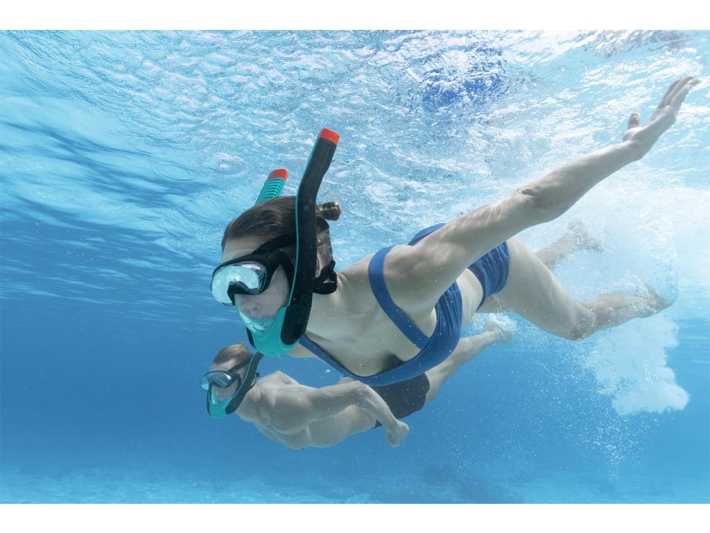 Kompletní šnorchlovací maska pro dospělé se dvěma šnorchly. Stačí nasadit a dýchat stejně jako na souši. Oddělené trubice pro nádech a výdech pro čerstvý vzduch při každém nádechu. Snadno nastavitelné popruhy, tónovaná skla a vysoce kvalitní silikon, který poskytuje pohodlné a bezpečné uchycení a schopnost vyrovnávat tlak. Koncovky Full Dry zabraňují vniknutí vody do šnorchlu. Rozměry: 21,5 x 37 x 9,5 cm. Věk: 14+