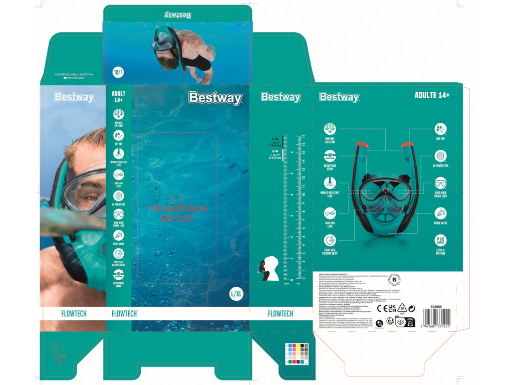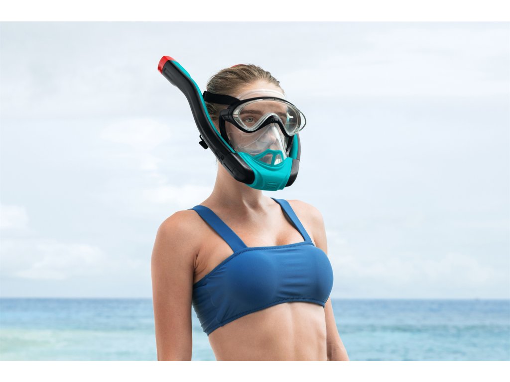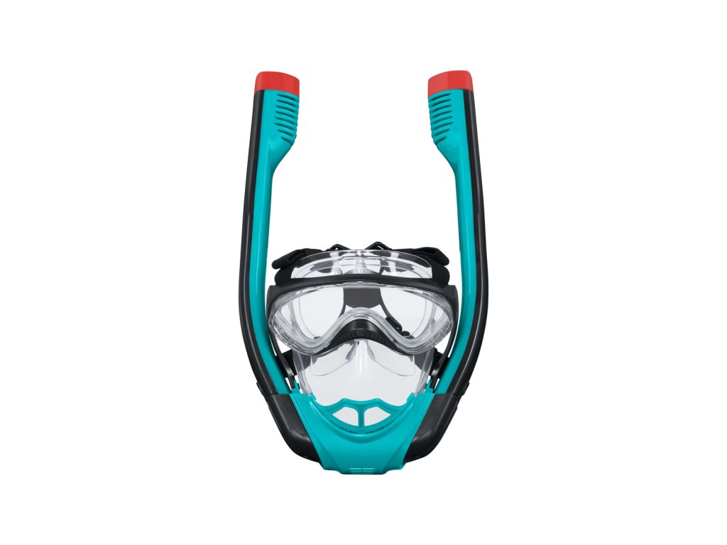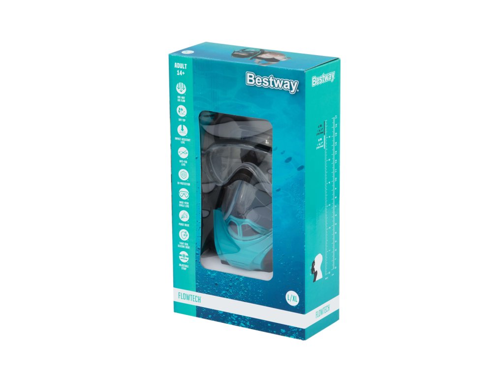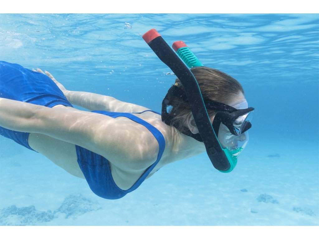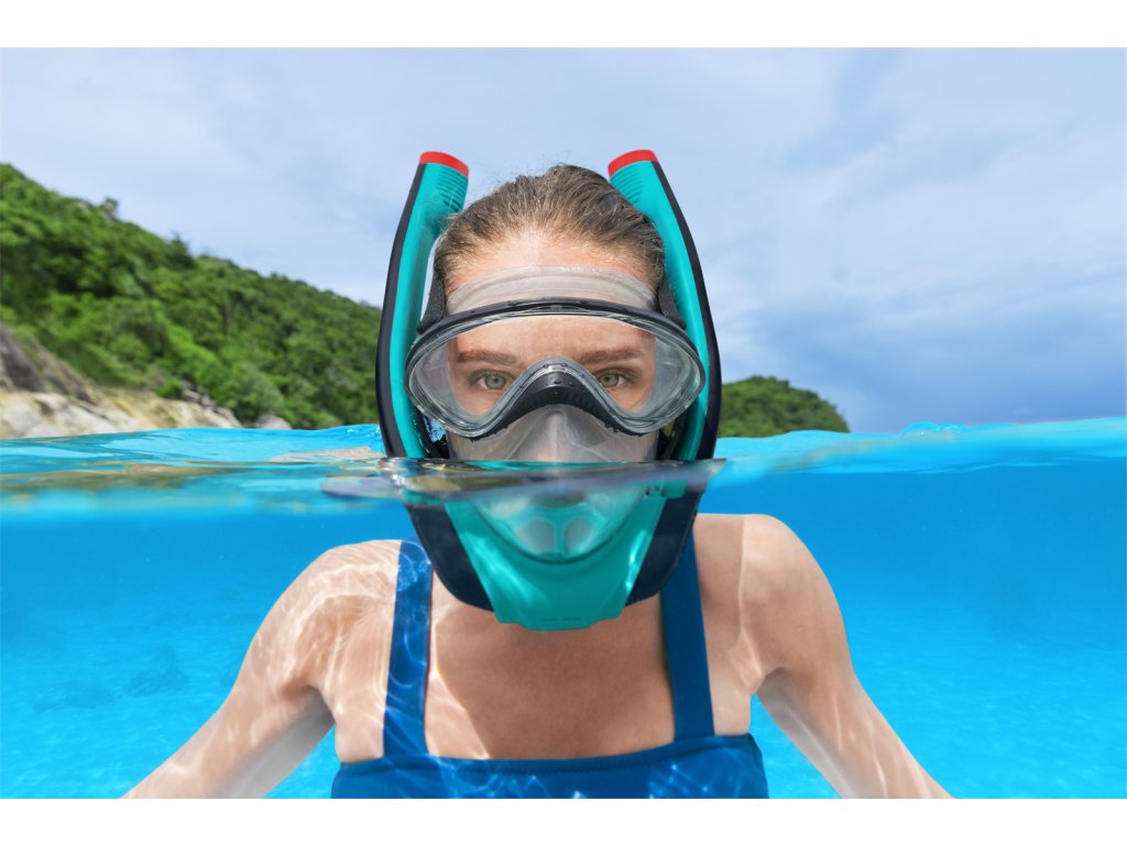 Kompletní šnorchlovací maska pro dospělé se dvěma šnorchly. Stačí nasadit a dýchat stejně jako na souši. Oddělené trubice pro nádech a výdech pro čerstvý vzduch při každém nádechu. Snadno nastavitelné popruhy, tónovaná skla a vysoce kvalitní silikon, který poskytuje pohodlné a bezpečné uchycení a schopnost vyrovnávat tlak. Koncovky Full Dry zabraňují vniknutí vody do šnorchlu. Rozměry: 21,5 x 37 x 9,5 cm. Věk: 14+