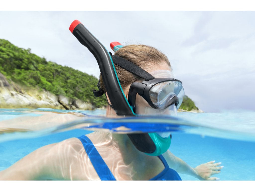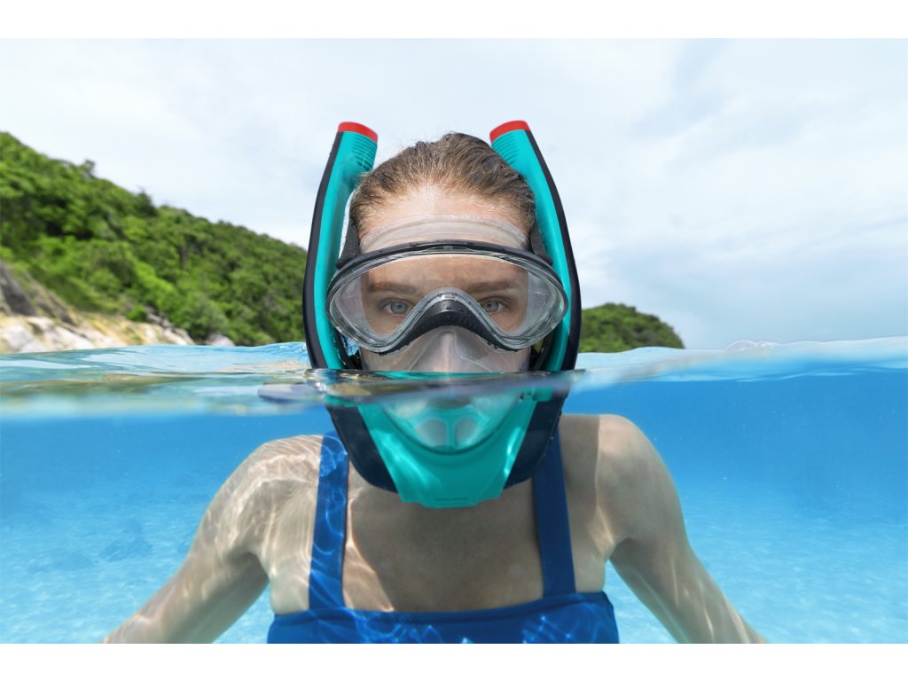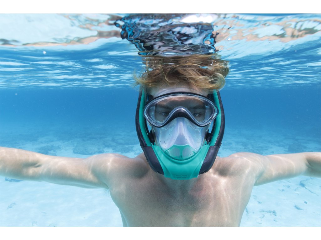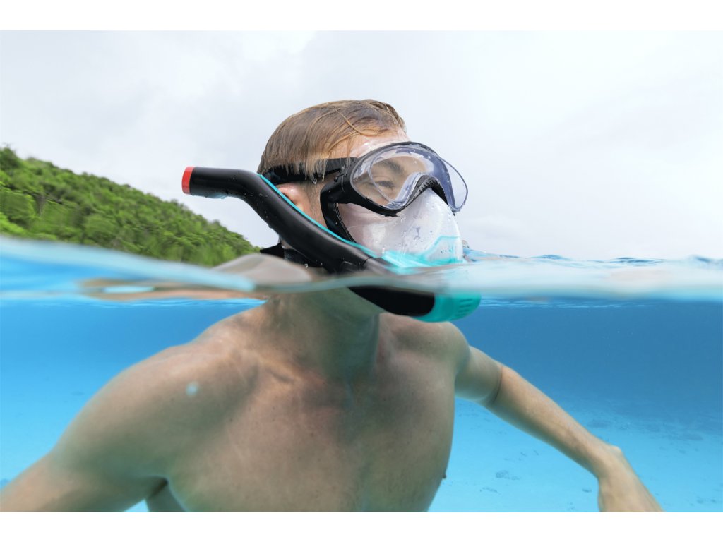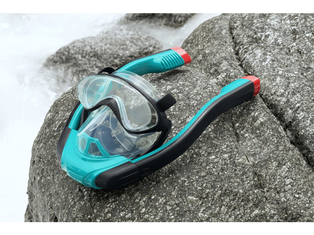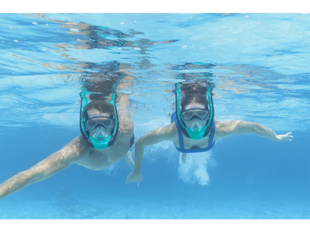 Kompletní šnorchlovací maska pro dospělé se dvěma šnorchly. Stačí nasadit a dýchat stejně jako na souši. Oddělené trubice pro nádech a výdech pro čerstvý vzduch při každém nádechu. Snadno nastavitelné popruhy, tónovaná skla a vysoce kvalitní silikon, který poskytuje pohodlné a bezpečné uchycení a schopnost vyrovnávat tlak. Koncovky Full Dry zabraňují vniknutí vody do šnorchlu. Rozměry: 21,5 x 37 x 9,5 cm. Věk: 14+