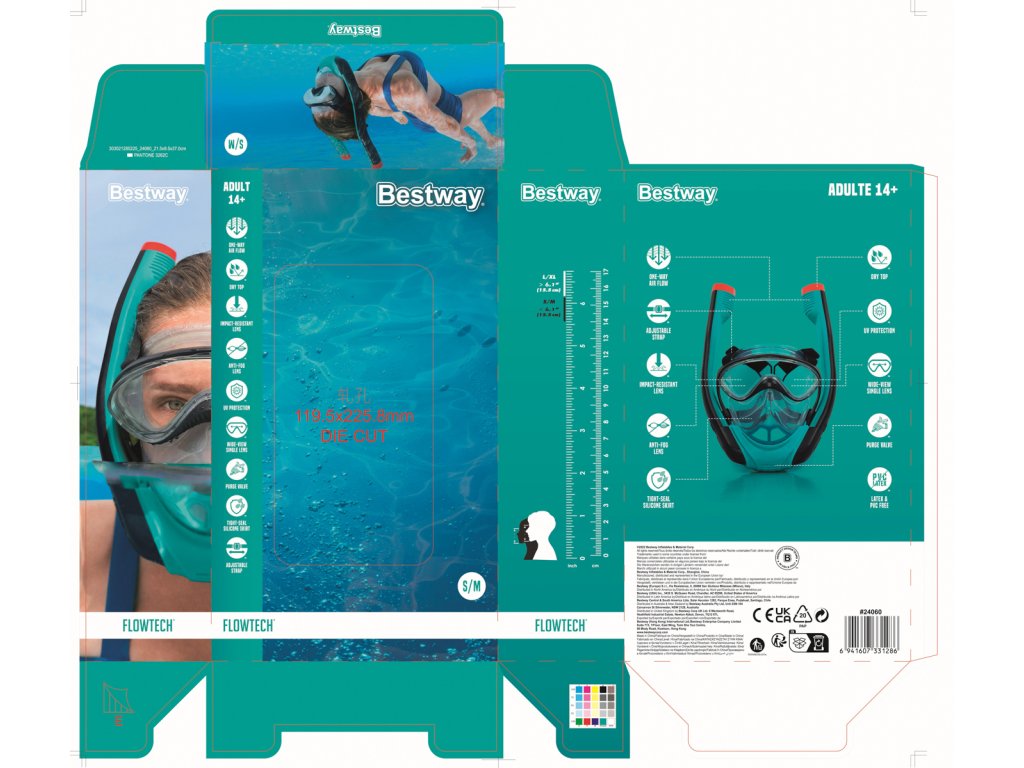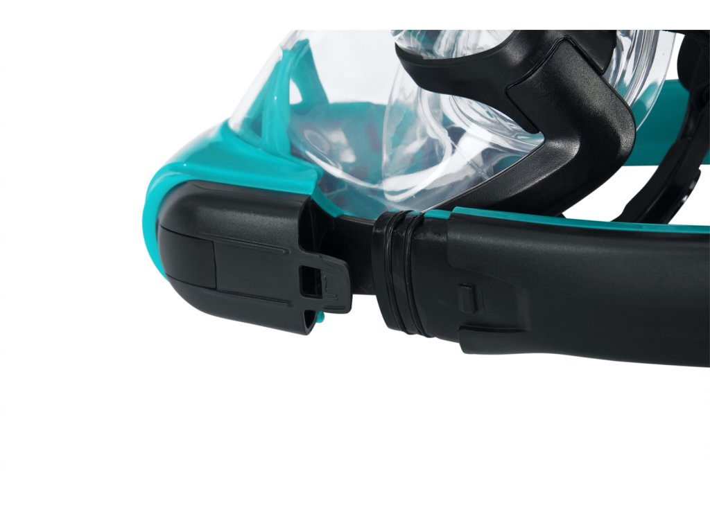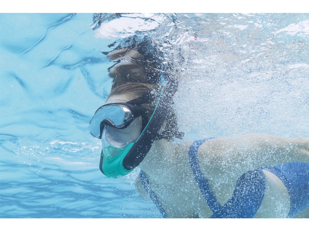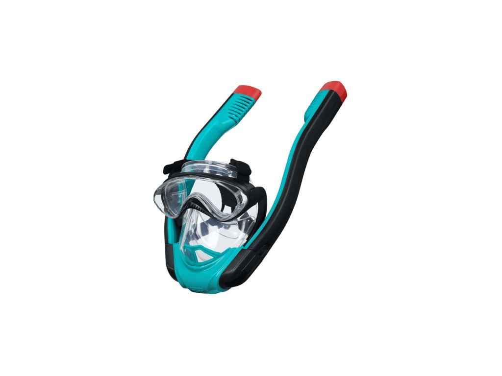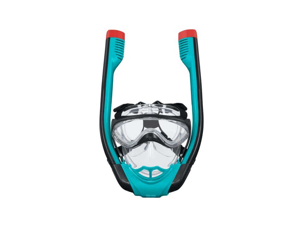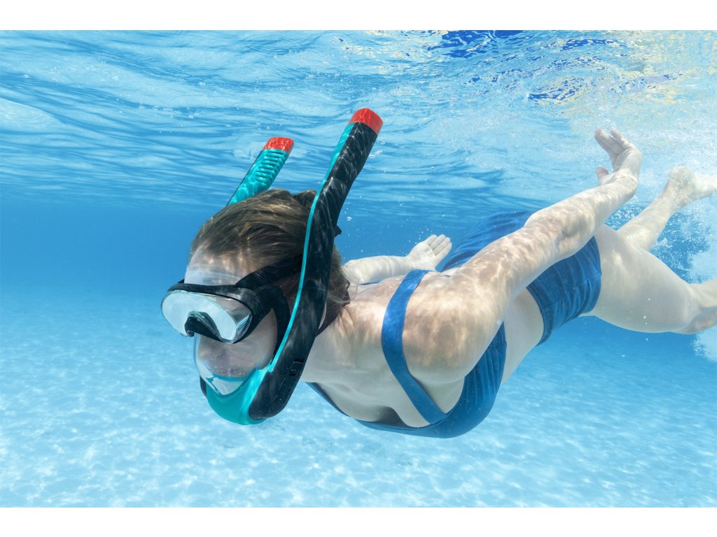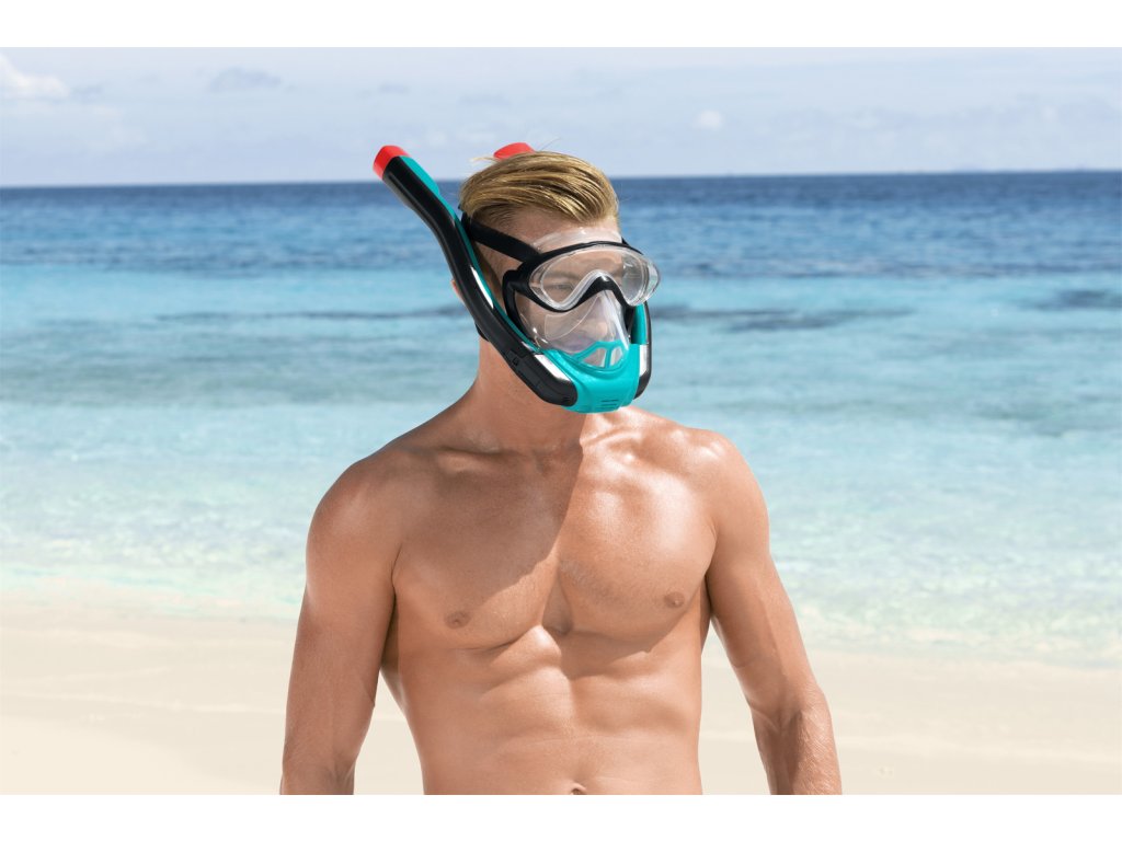 Kompletní šnorchlovací maska pro dospělé se dvěma šnorchly. Stačí nasadit a dýchat stejně jako na souši. Oddělené trubice pro nádech a výdech pro čerstvý vzduch při každém nádechu. Snadno nastavitelné popruhy, tónovaná skla a vysoce kvalitní silikon, který poskytuje pohodlné a bezpečné uchycení a schopnost vyrovnávat tlak. Koncovky Full Dry zabraňují vniknutí vody do šnorchlu. Rozměry: 21,5 x 37 x 9,5 cm. Věk: 14+