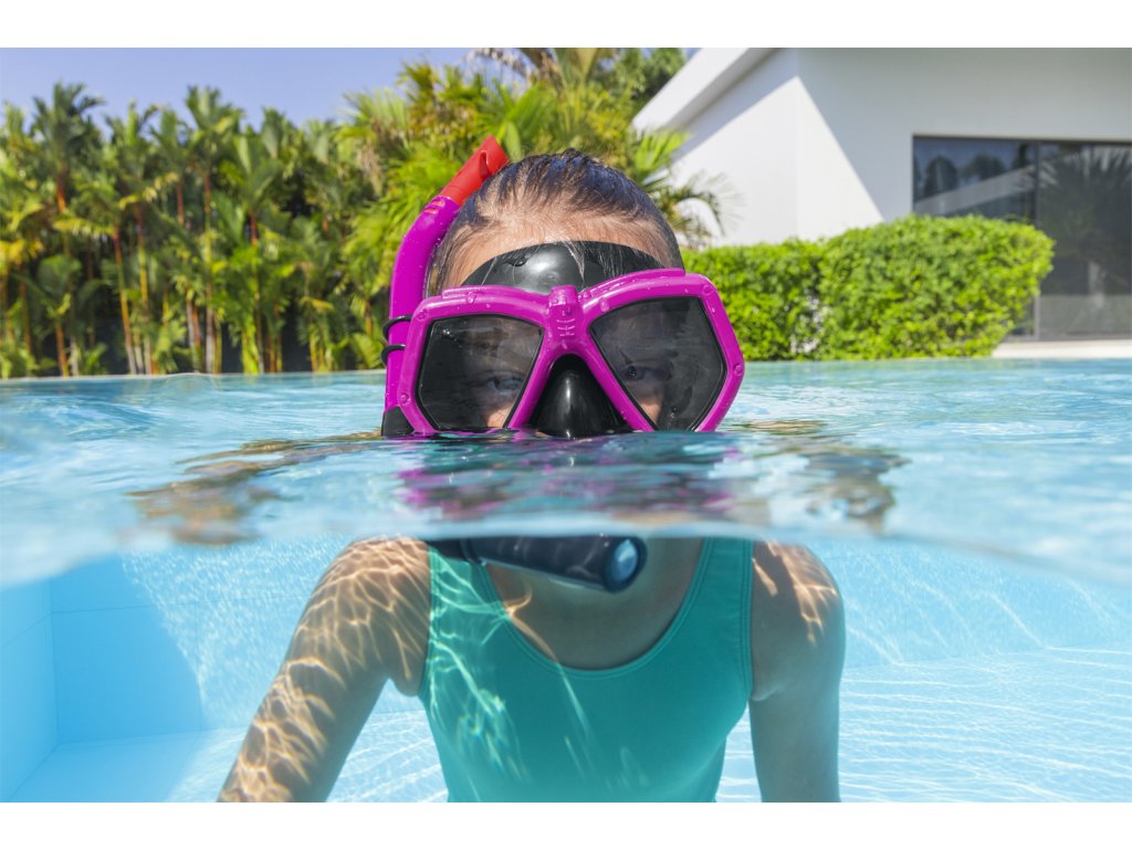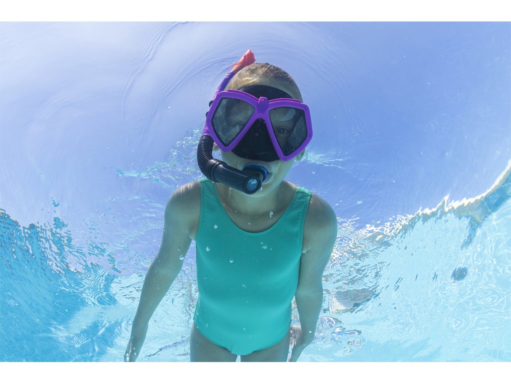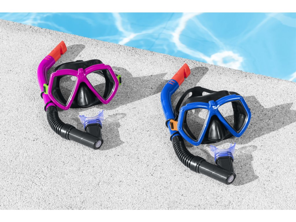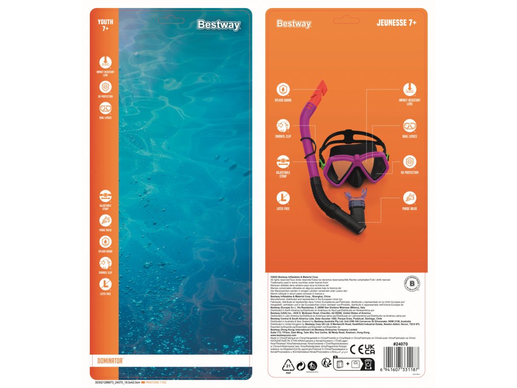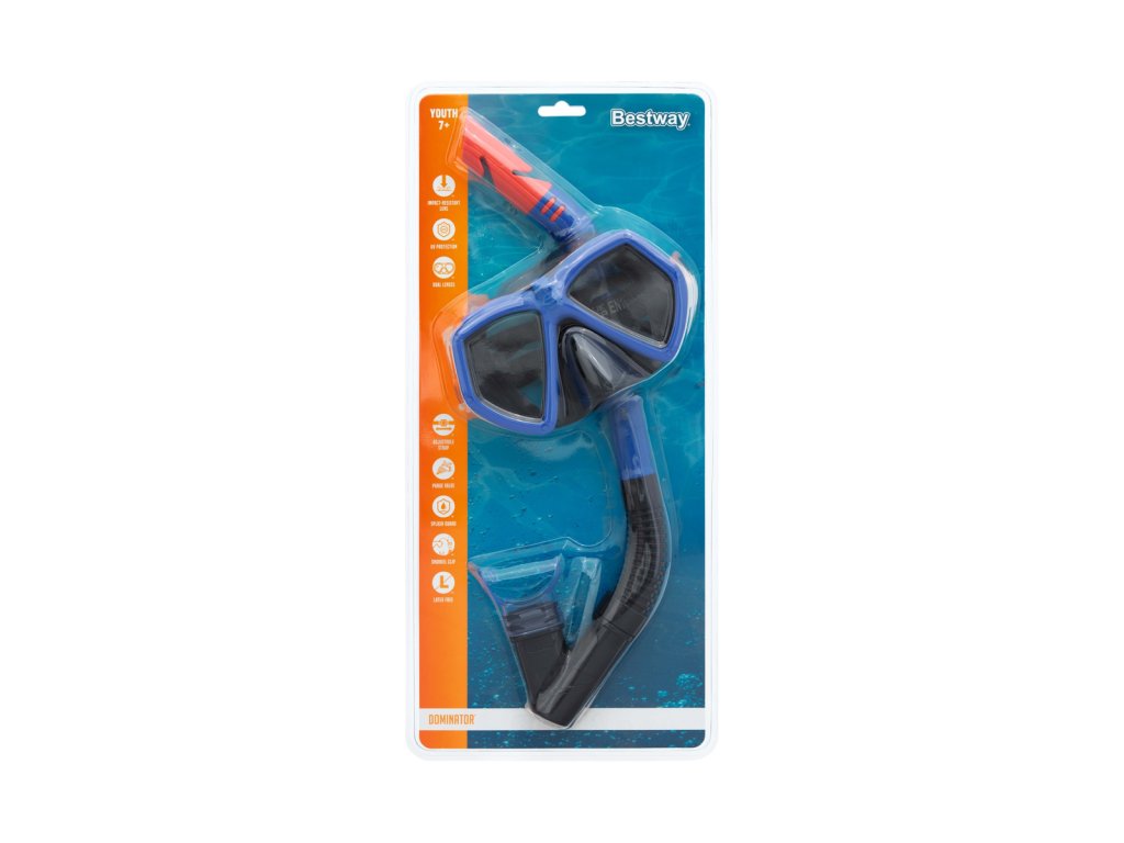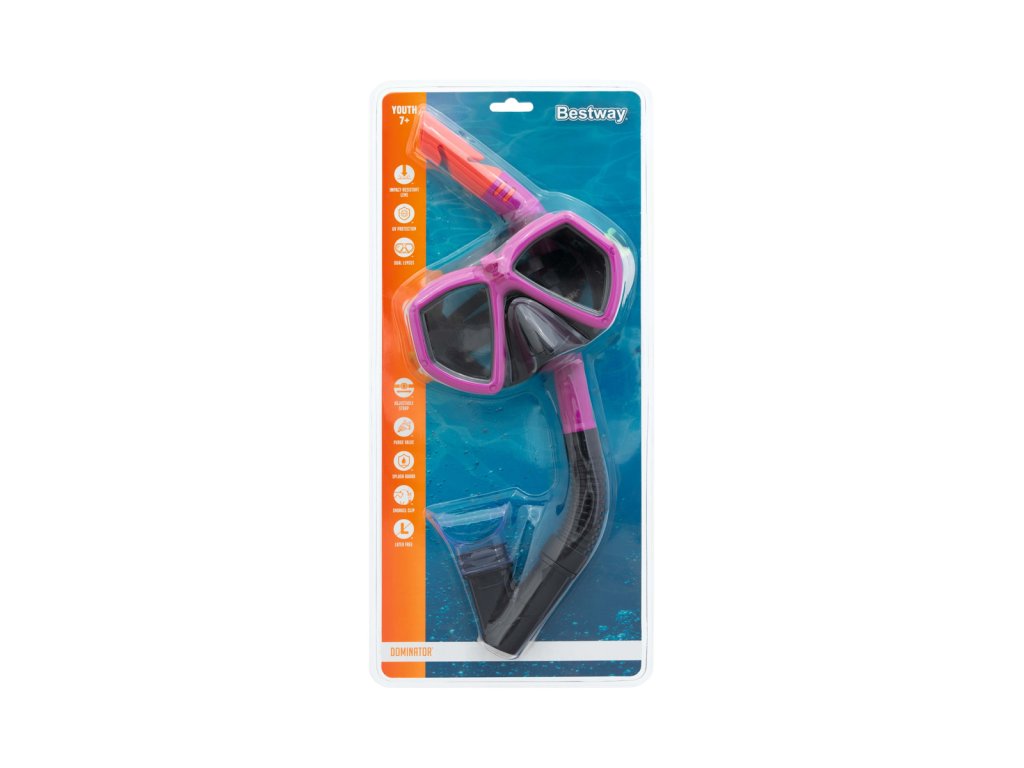 Bestway šnorchlovací set Dominator – brýle a šnorchl. Brýle mají polykarbonátové čočky ve tvaru leteckých brýlí s UV ochrannou vrstvou. Komfortní, dvojité těsnění lemu brání vnikání vody do brýlí. Plně nastavitelný dělený silikonový pásek. Šnorchl má měkký a pohodlně přiléhající náustek. Technologie Dry Top je speciální vylepšení šnorchlu, které zabraňuje průniku vody do úst. 100 % bez latexu. 2 barevné provedení (modrá, růžová). Věk: 7+