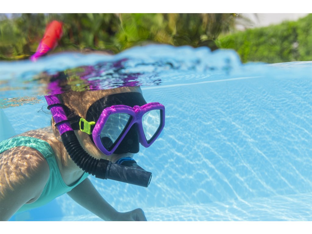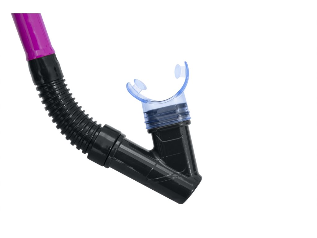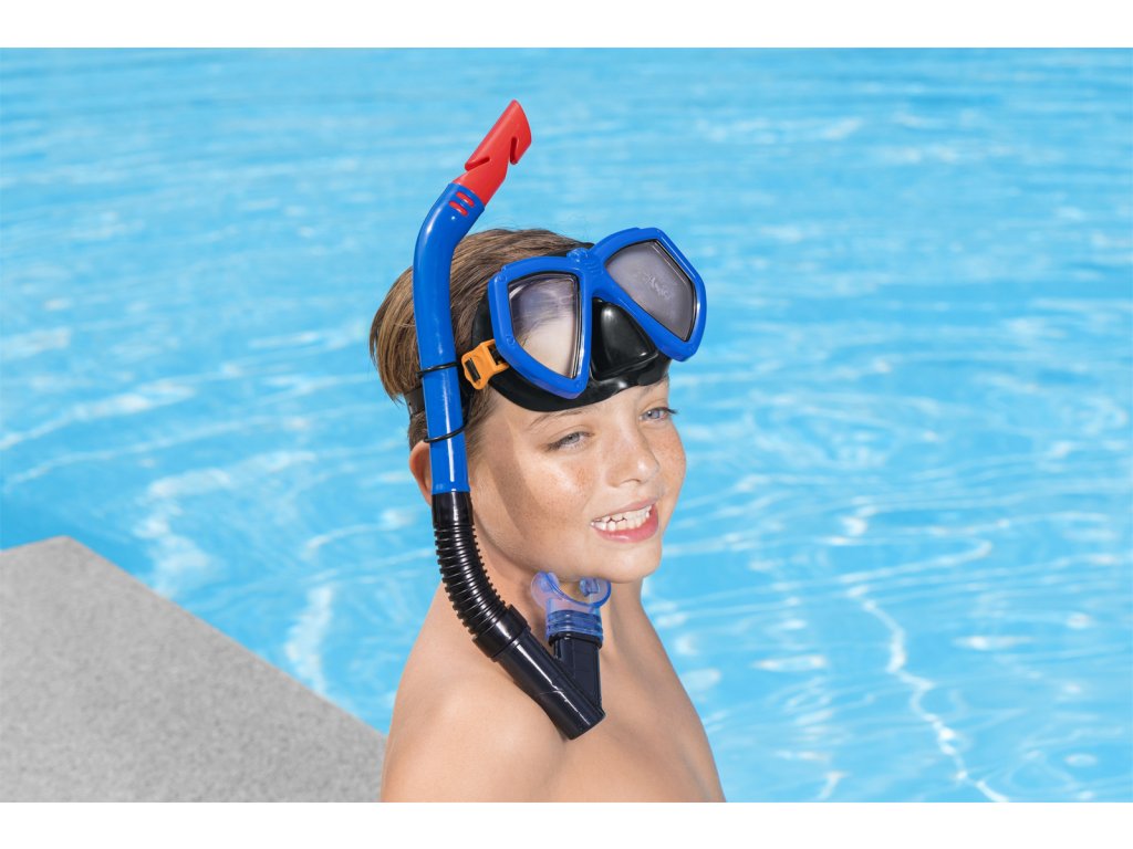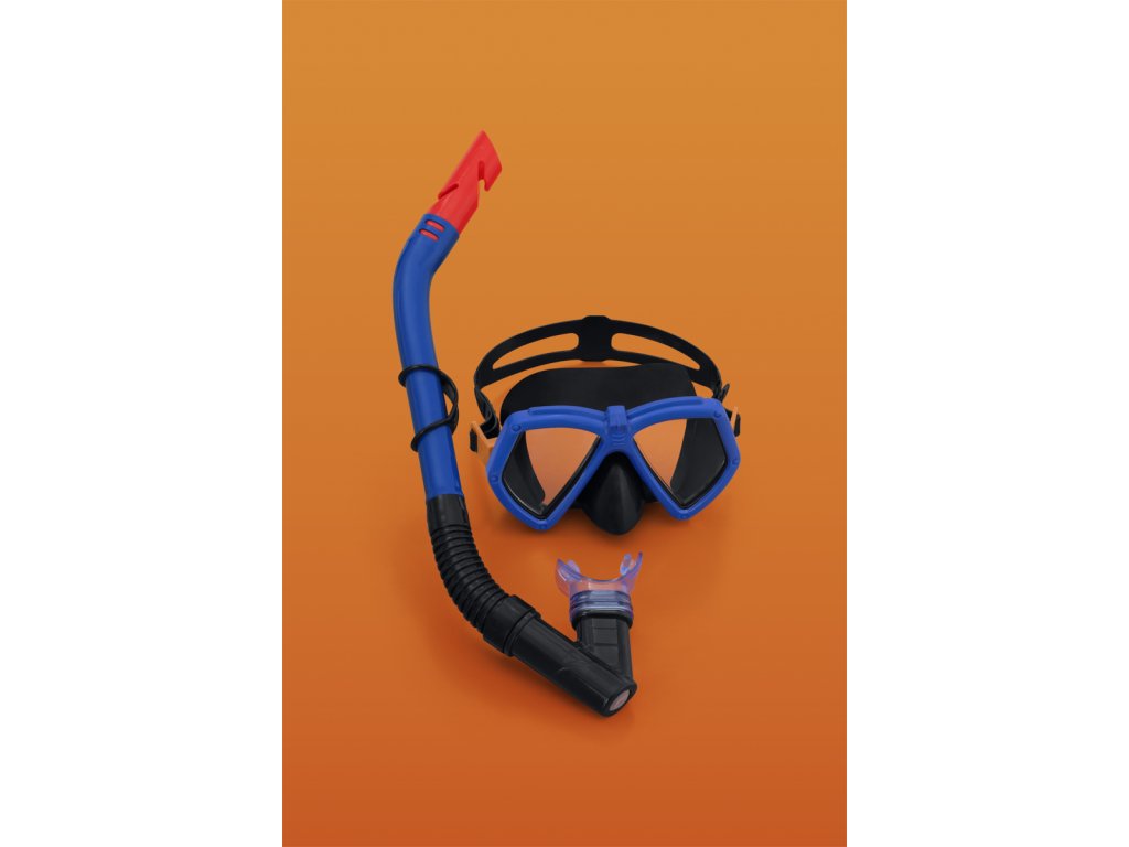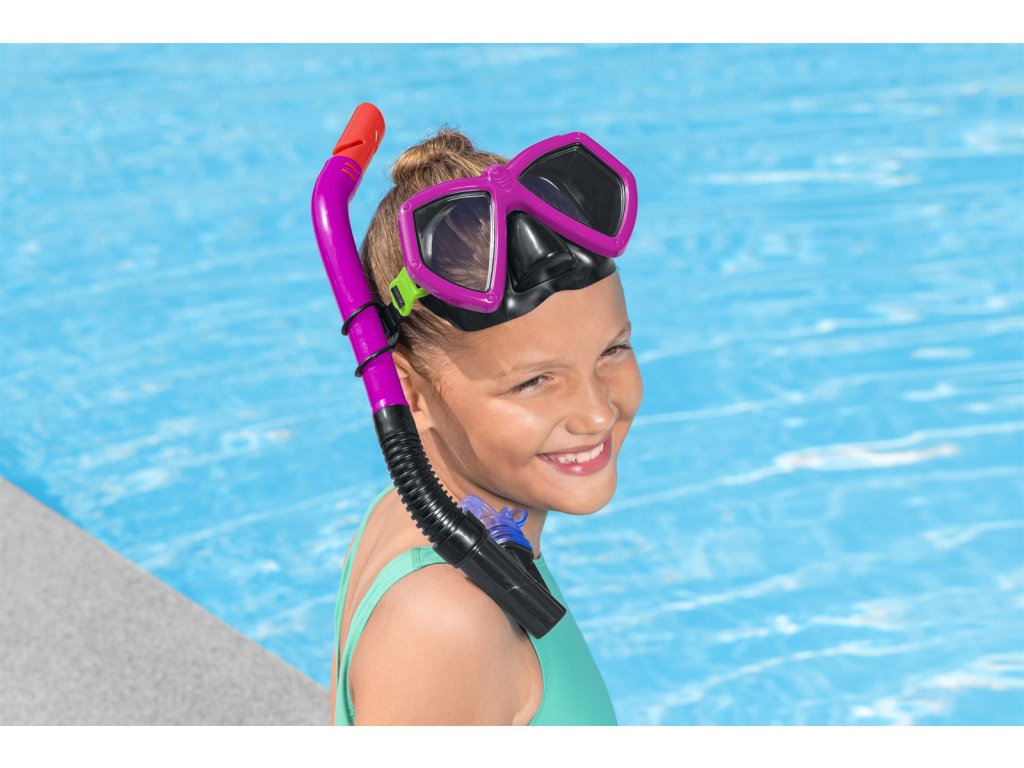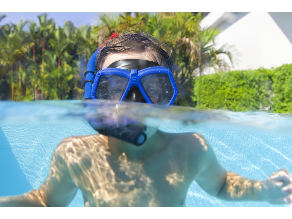 Bestway šnorchlovací set Dominator – brýle a šnorchl. Brýle mají polykarbonátové čočky ve tvaru leteckých brýlí s UV ochrannou vrstvou. Komfortní, dvojité těsnění lemu brání vnikání vody do brýlí. Plně nastavitelný dělený silikonový pásek. Šnorchl má měkký a pohodlně přiléhající náustek. Technologie Dry Top je speciální vylepšení šnorchlu, které zabraňuje průniku vody do úst. 100 % bez latexu. 2 barevné provedení (modrá, růžová). Věk: 7+