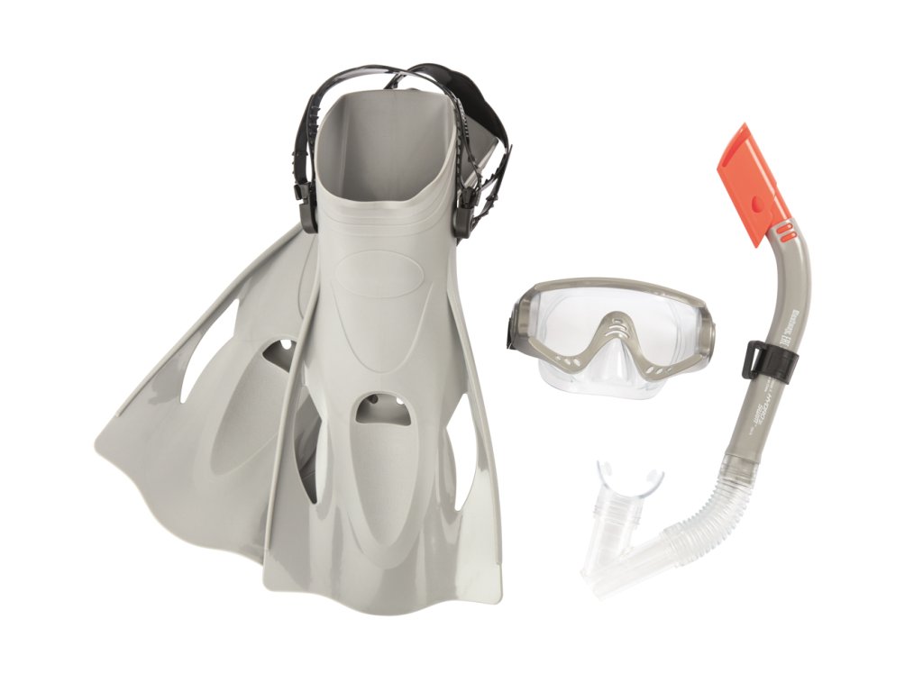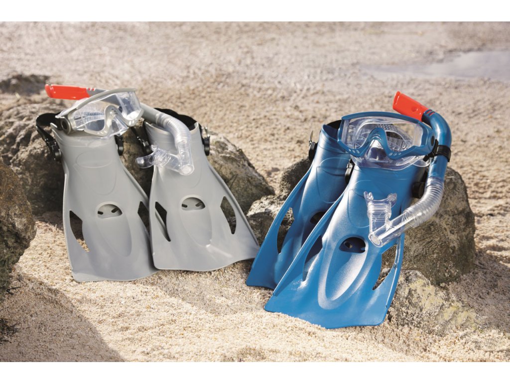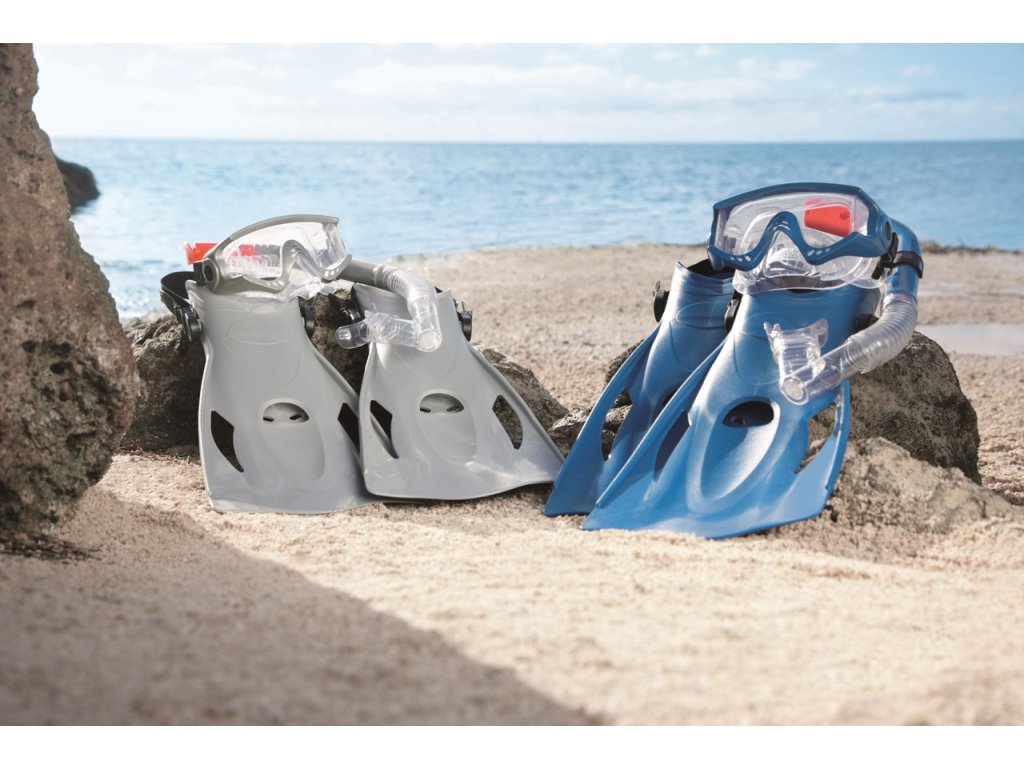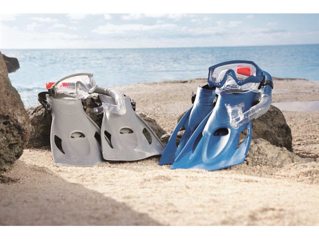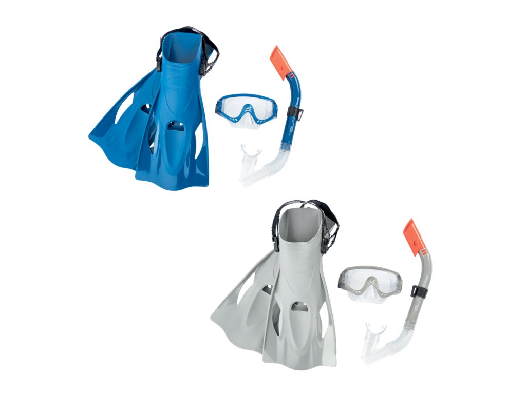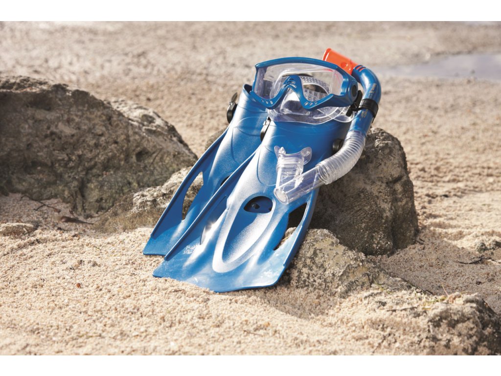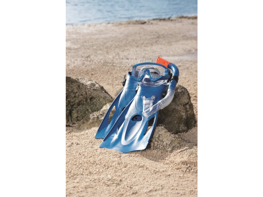 Šnorchlovací set-ploutve, brýle, šnorchl ve dvou barevných provedeních (šedá/modrá). Čočky brýlí jsou v bezpečně tvarované s UV ochranným filtrem. Měkký, přilnavý okraj je neprodyšný. Plně nastavitelný řemínek na velikost hlavy. Naústek na šnorchl na míru. Technologie Dry Top je speciální vylepšení šnorchlu, které zabraňuje průniku vody do úst. Měkké, komfortní ploutve lze pomocí patního pásku nastavit ve velikostech EUR 41-46. 100% bez latexu. 2 různé barvy. Taška se štítkem. Věk: 14+.