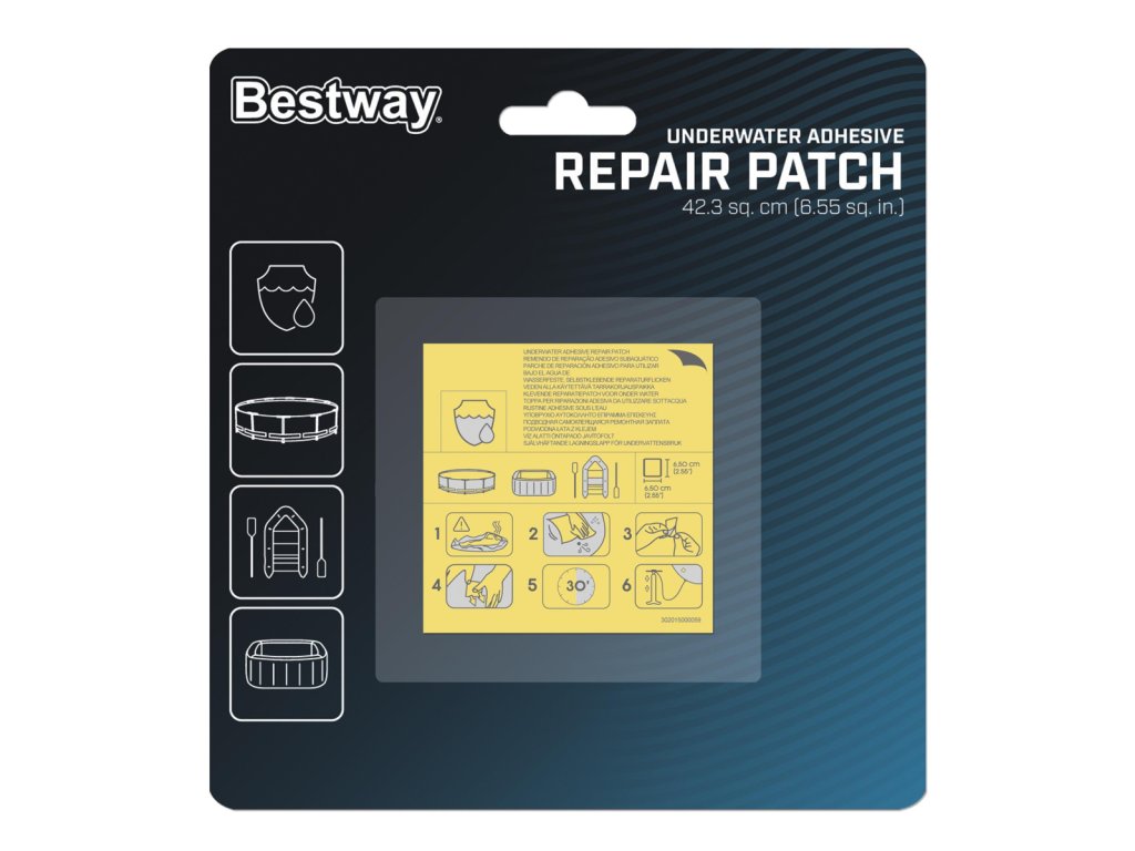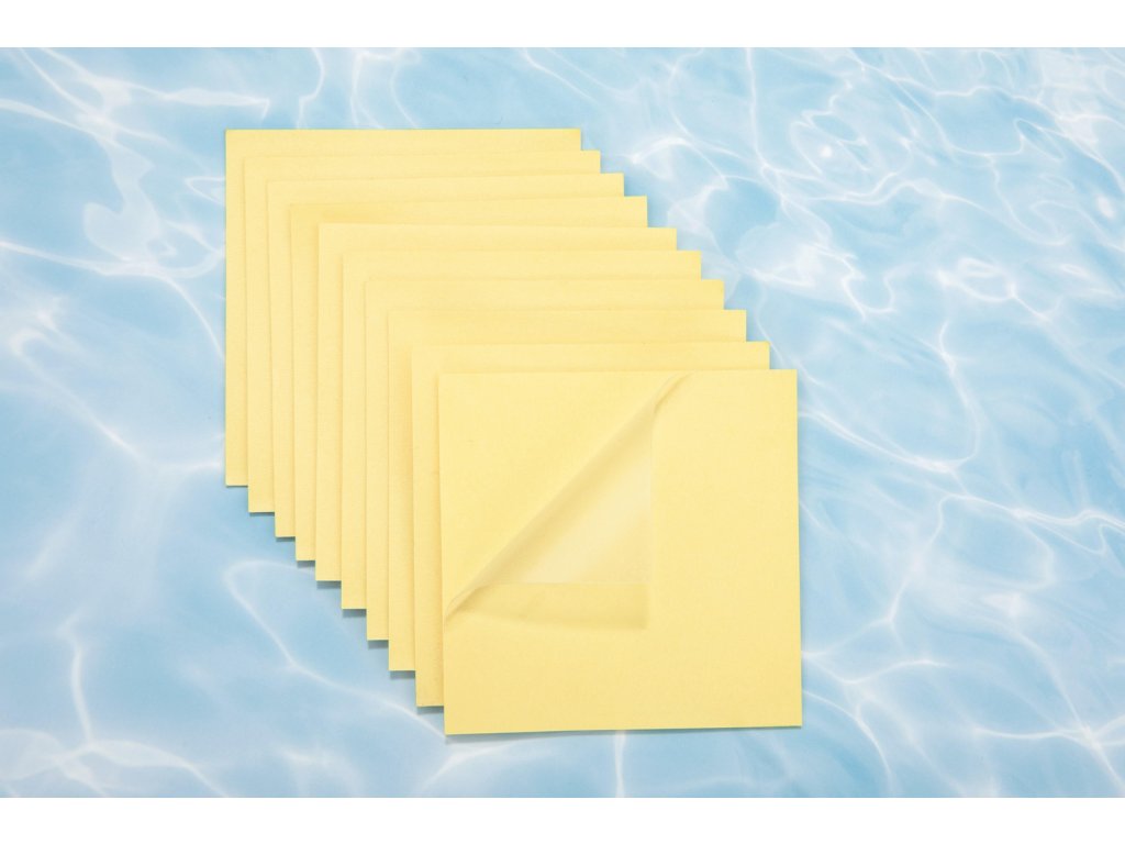 Sada opravných náplastí na nafukovací produkty Bestway. Sada obsahuje 10 ks samolepících opravných náplastí o rozměru 6,5 x 6,5 cm. Náplasti jsou voděodolné, nemusíte se obávat jejich použití, pokud bazén bude ještě naplněný vodou. Ideální pro opravení nafukovacích bazénů, matrací a jiných nafukovacích produktů.