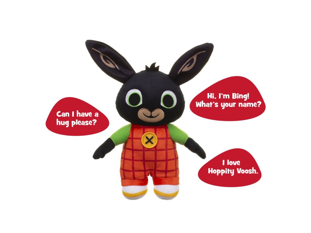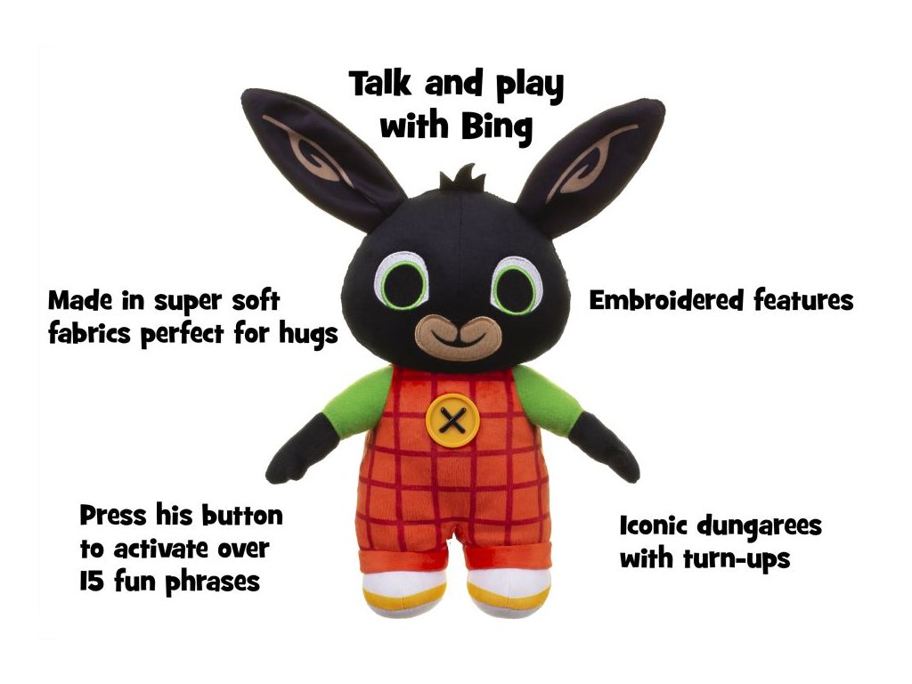 Plyšový mluvící BING populární pohádky králíček Bing. Je to skvělý společník, umí více než 15 frází. Když stiskneš knoflík/bříško uslyšíš jak Bing mluví. Je vyrobený z měkoučkého mazlivého vysoce kvalitního materiálu. Součástí balení jsou 3AA baterie, které se dají vyměnit.