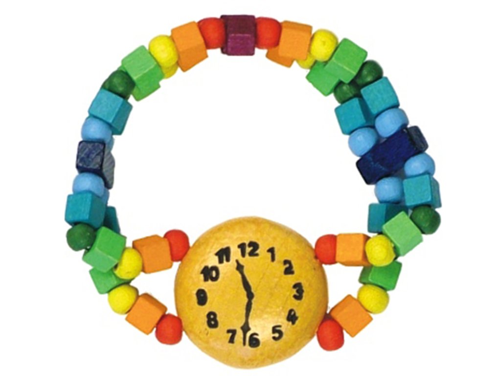 Pěkné barevné provedení korálků a kostiček s větším dřevěným butonem na kterém je vykreslený motiv hodinek.