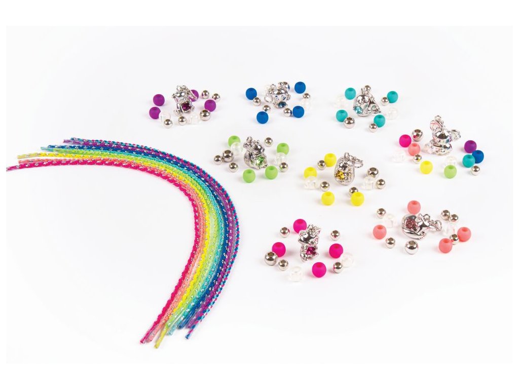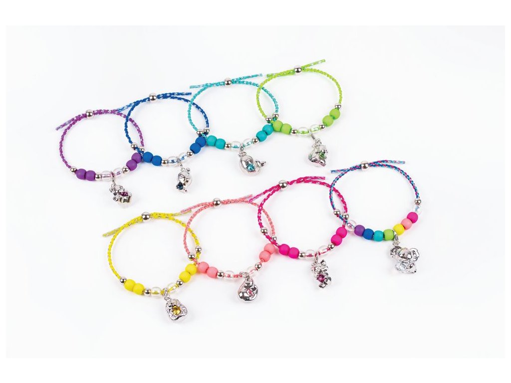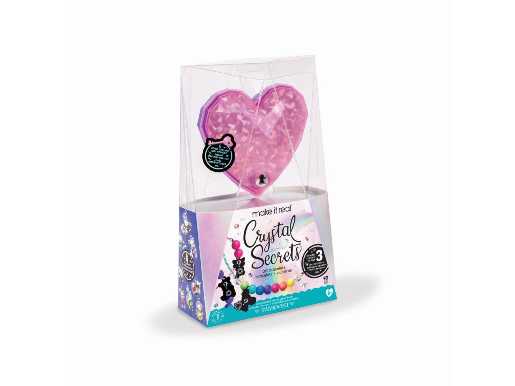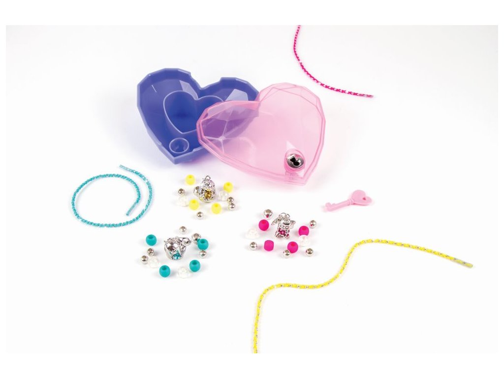 Balení obsahuje 3 náramky s přívěsky a krystalem SWAROVSKI, krabičku ve tvaru srdce, klíček, korálky, barevné šňůry a instrukce Vhodné od 8 let.