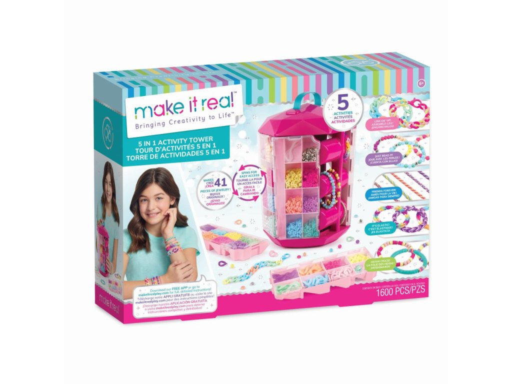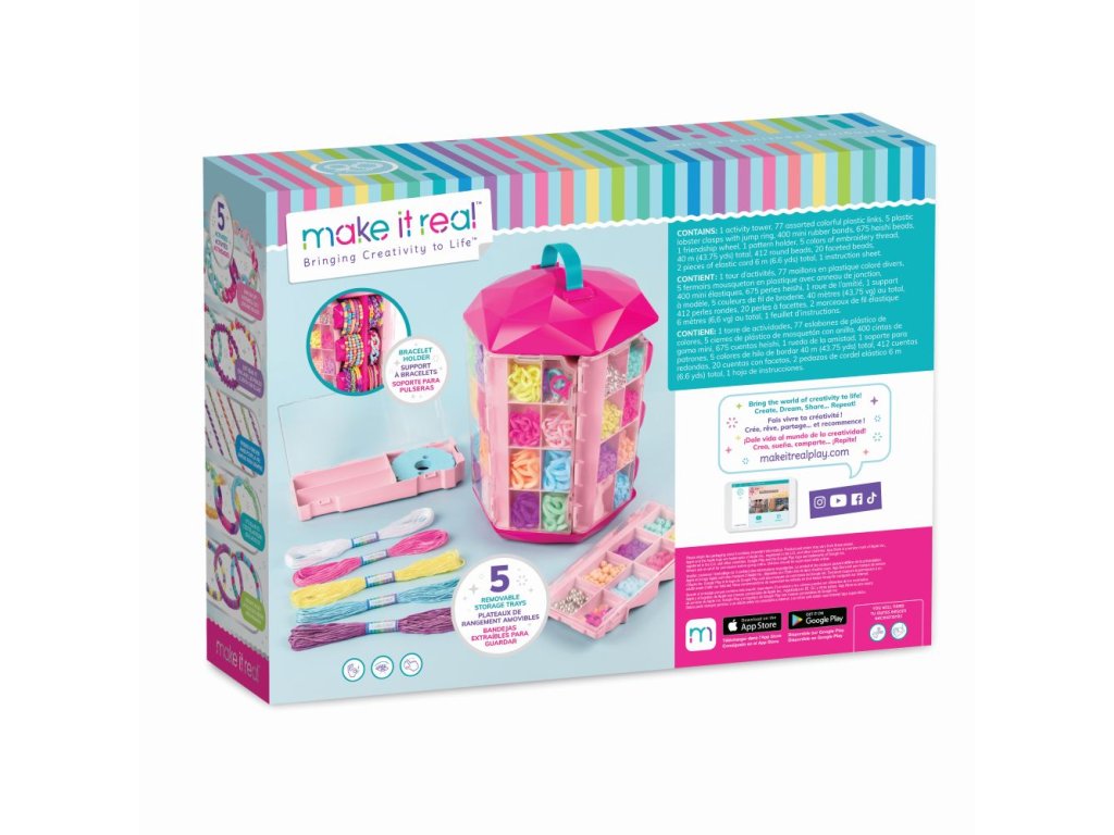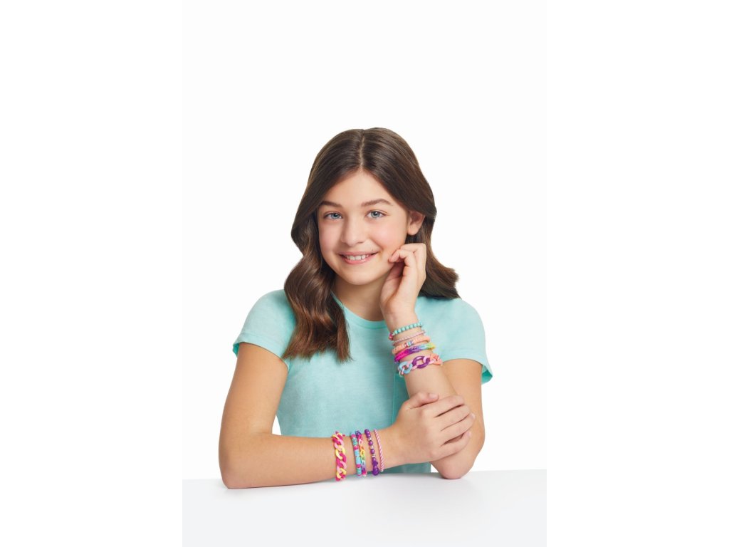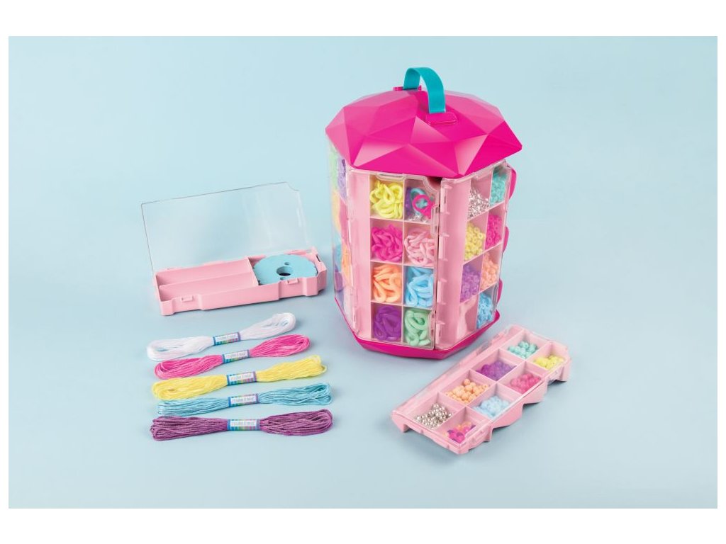Velký set 5 v 1 na výrobu náramků je ideálním dárkem pro každou šikovnou slečnu. Balení obsahuje vše potřebné ke kreativní tvorbě náramků. Velký set obsahuje celkem 1600 kusů. Komponenty jsou uloženy v krabičkách s přepážkami dle druhu náramku. Součástí sady jsou různo-barevné korálky, abecední korálky, kovové a metalické korálky, barevné vyšívací nitě, barevné gumičky, háček, přívěsky, omalovánky, tužky, 2 archy samolepek, šablony, humří sponky a elastické šňůrky. Vyráběním náramků se zdokonaluje jemná motorika prstů, kreativita a malé šikulky se na dlouhou dobu zabaví. Vhodné pro dívky od 8 let.