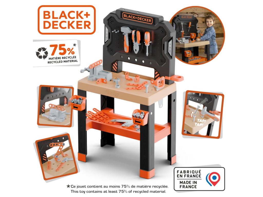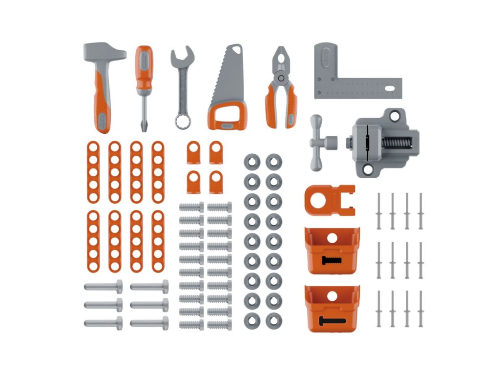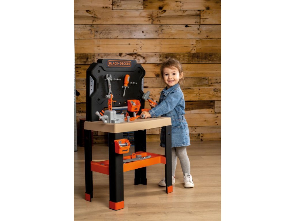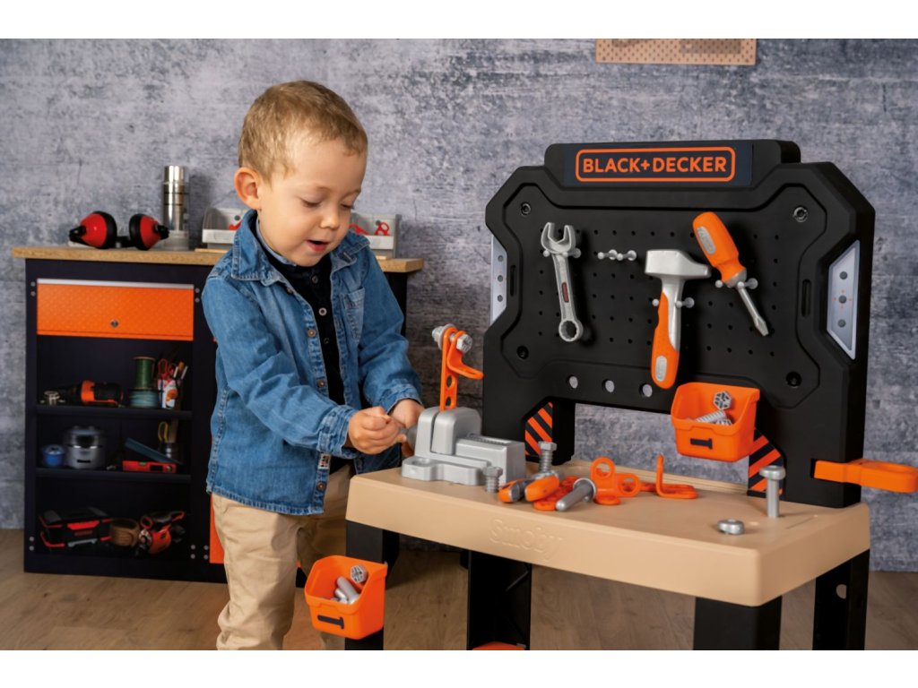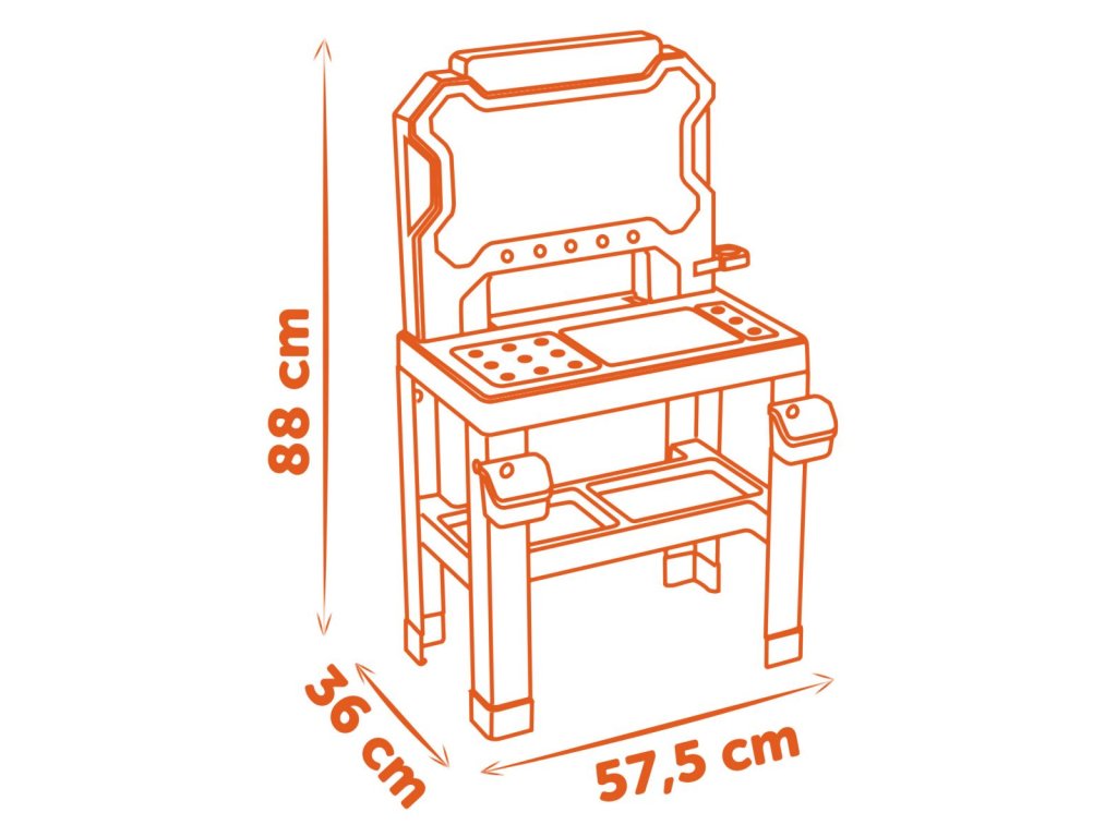 Realistické centrum pracovního stolu Smoby Black+Decker s 78 díly příslušenství a 7 nástroji. Velký, robustní pracovní stůl vypadá jako skutečný tátův pracovní stůl. Velká pracovní plocha v dřevěném designu nabízí dostatek prostoru pro různé nářadí. Mechanickým akumulátorovým šroubovákem lze ze stavebních bloků sešroubovat různá vozidla. Vybavení je doplněno šroubovou svorkou a posuvným pravítkem. Spousta úložných přihrádek na šrouby a hřebíky. Se zábavnou zatloukací funkcí hřebíků. Tento výrobek obsahuje minimálně 75 % recyklovaného materiálu. Rozměry produktu (DxŠxV): 36 x 57,5 x 88 cm.