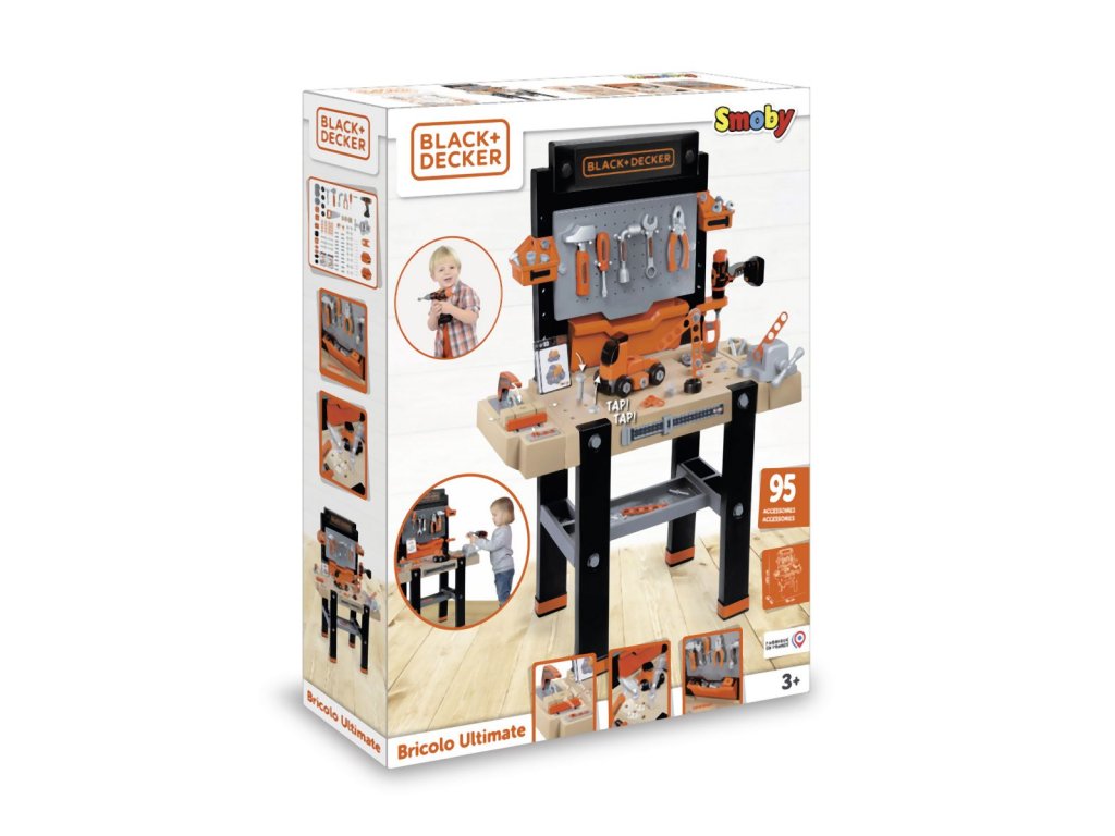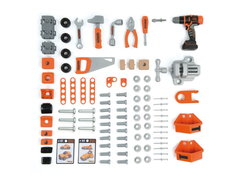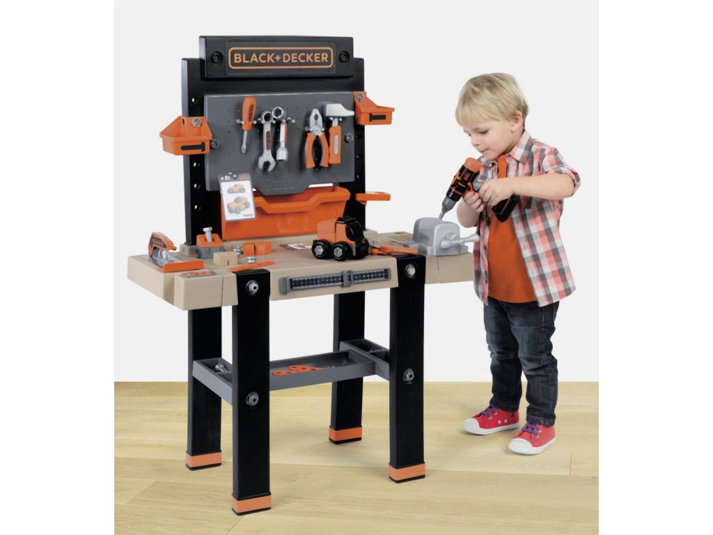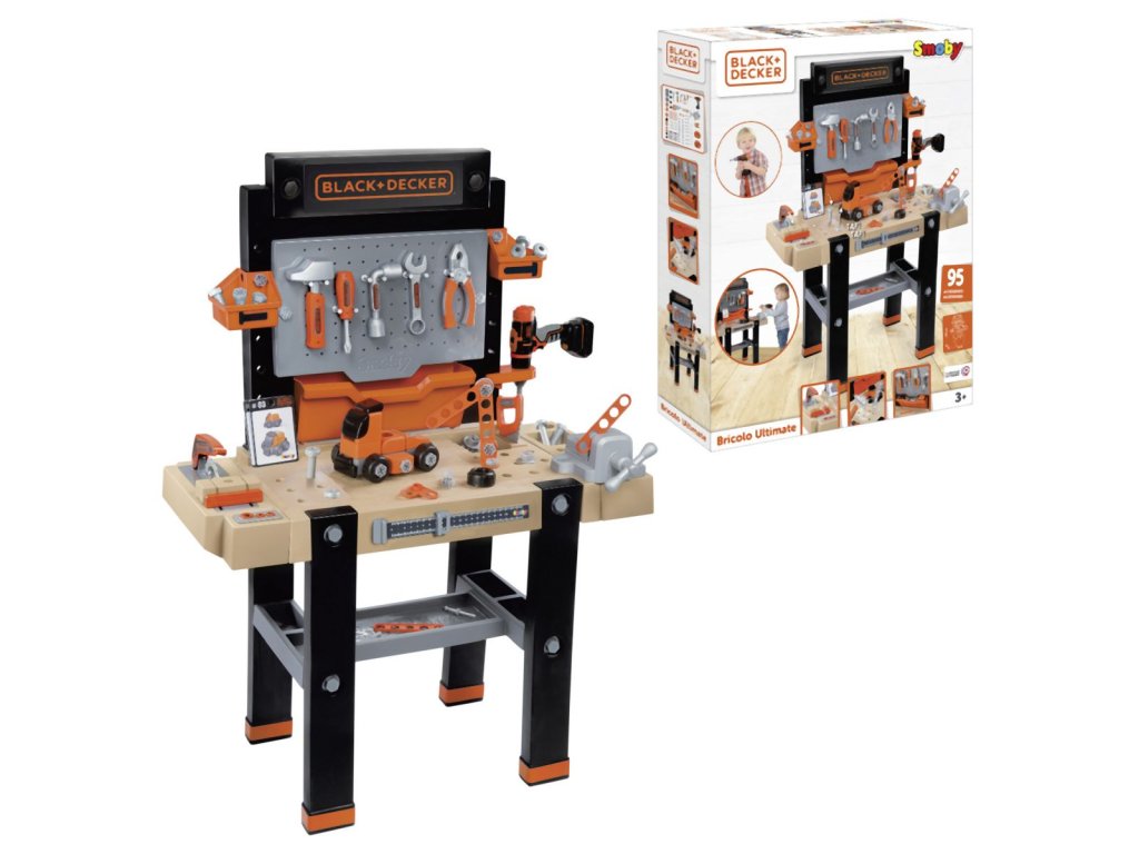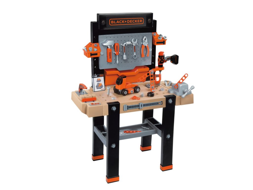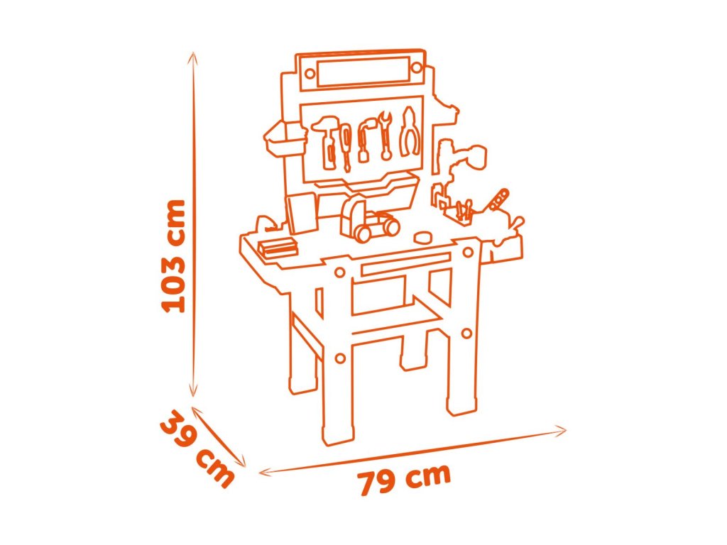 Elektronický pracovní stůl ve struktuře dřeva s přídavnou přihrádkou. Obsahuje 94 dílů příslušenství vč. akumulátorového šroubováku a kotoučové pily a sadou k výrobě vozidla. Baterie 2x LR44.Vhodné od 3 let.