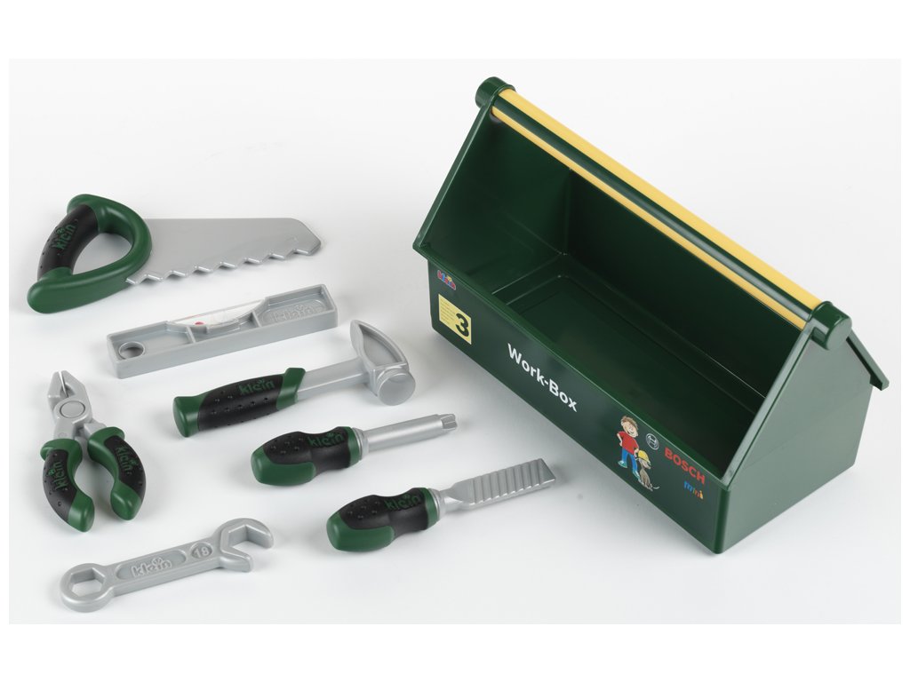 Nářadí Bosch v basičce. Kladívko, pilka, klíč, kleště a spousta dalšího nářadí, které je nepostaratelné pro malého opraváře. Vhodné pro děti od 3 let.
