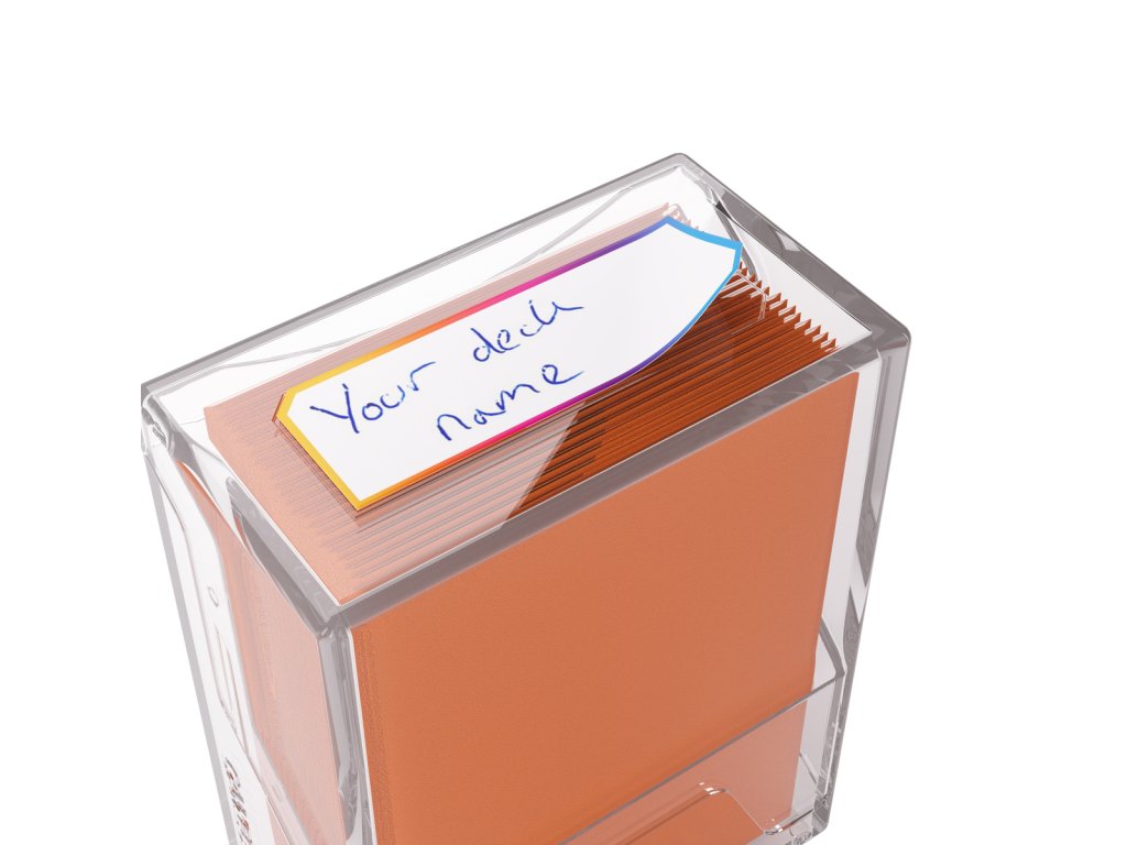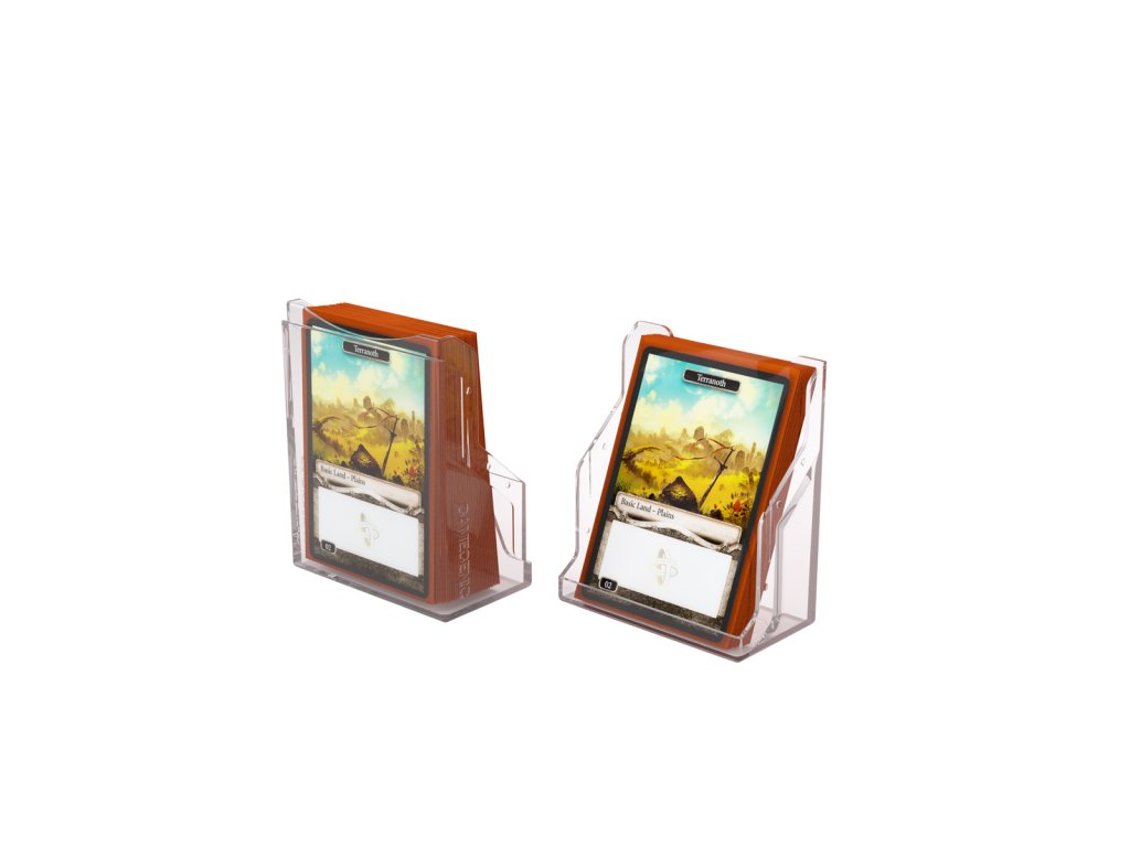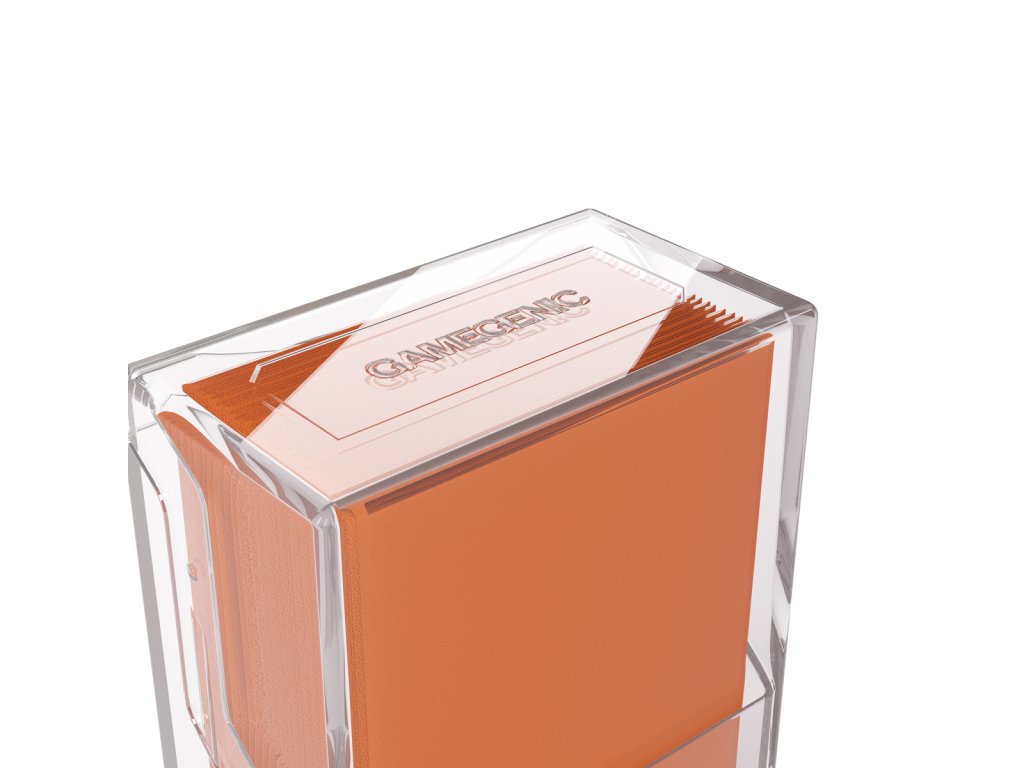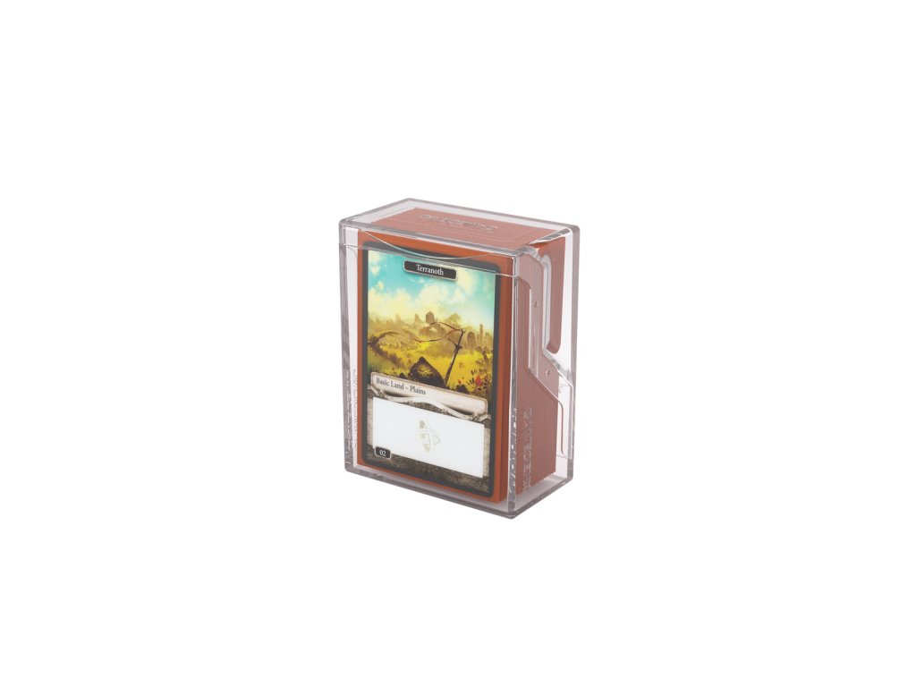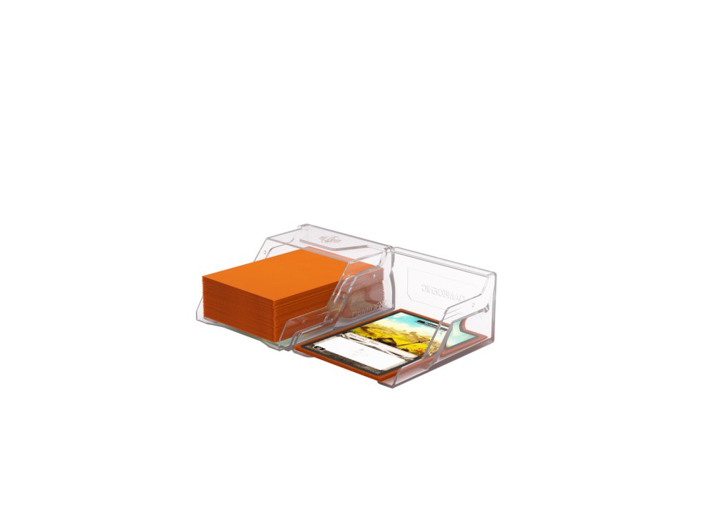Kompaktní a odolná krabička na karty, která pojme více než 50 karet v dvojobalech. Díky průhlednému materiálu a chytrému uzavírání je vrchní karta plně viditelná zvenčí bez nutnosti otevírání krabičky. Krabička je k dispozici v 10 různých barvách, včetně exkluzivní černé/průhledné verze.