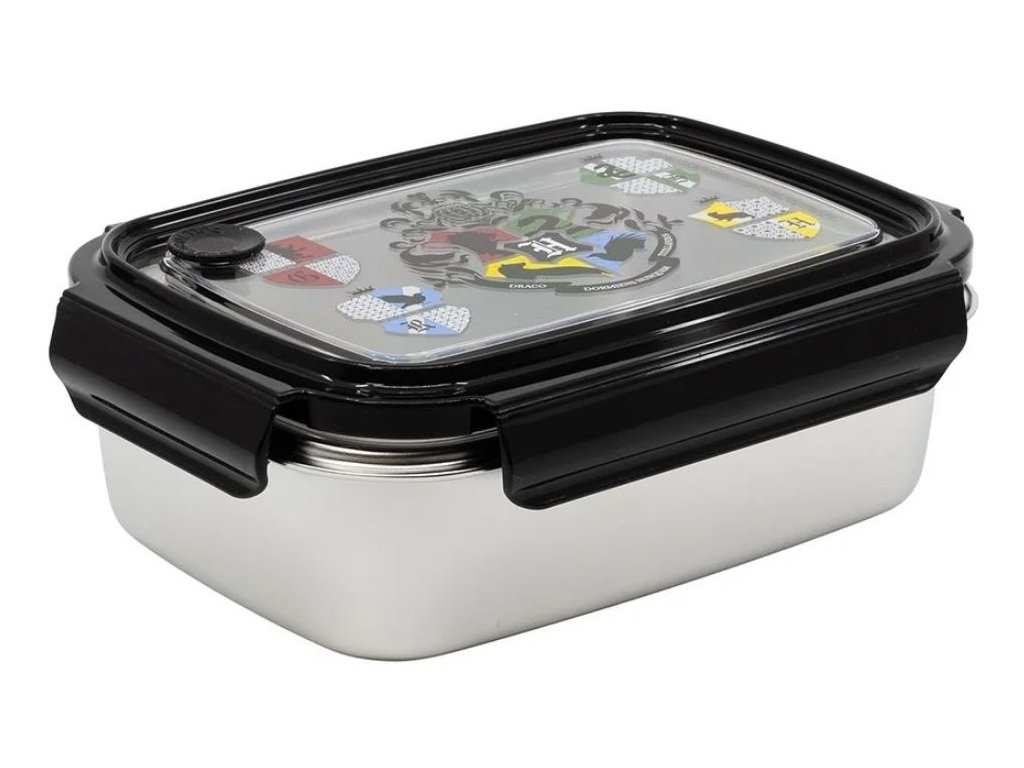 Nerezový svačinový box s uzávěrem a silikonovým těsněním vyvedený v motivu bradavických erbů a znakem Školy čar a kouzel.