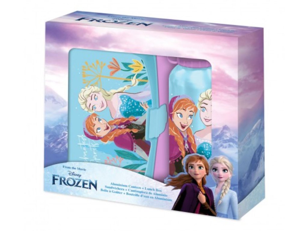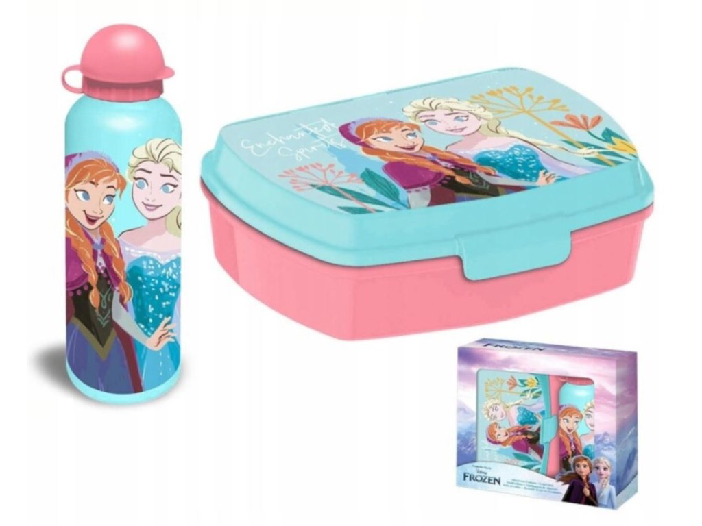 Dárkový set s láhví na pití a boxem na svačinu. To vše v růžovo-modré barvě s grafikou královských sester Elzy a Anny z pohádky Ledové království.