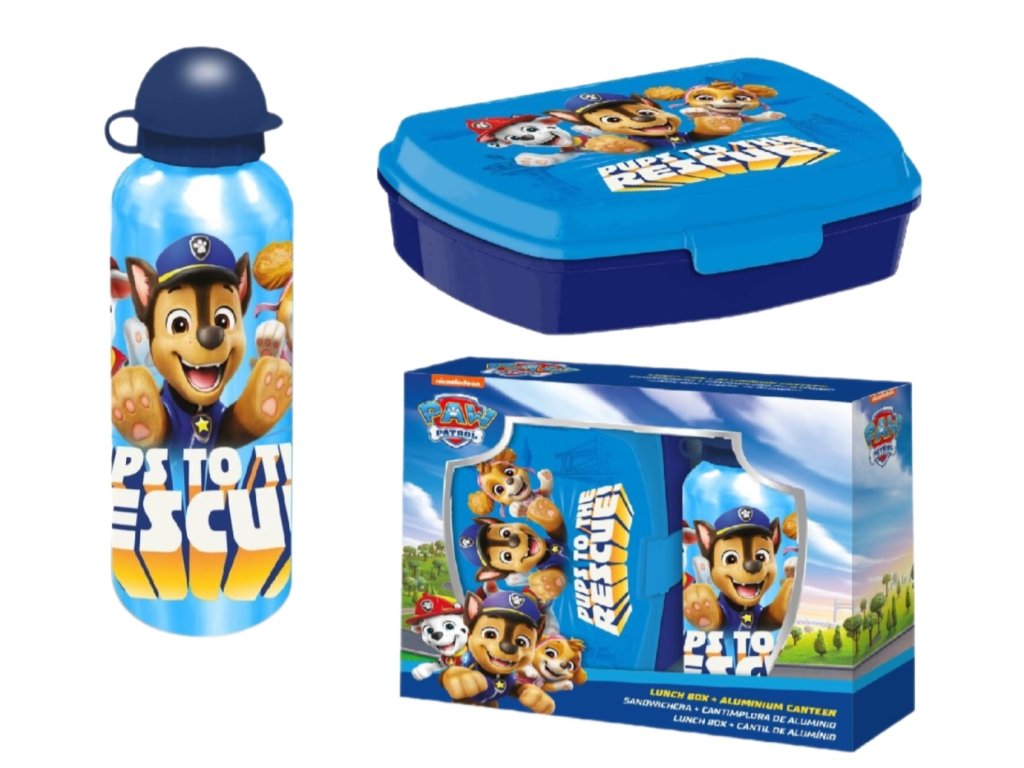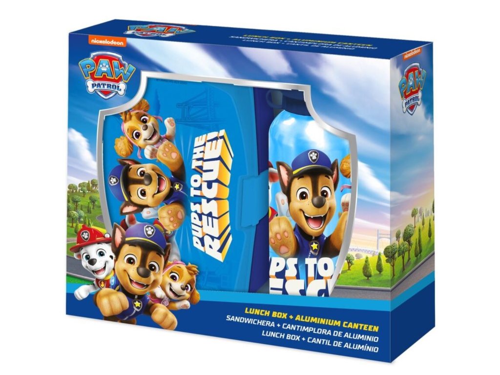Dárkový set s láhví na pití a boxem na svačinu. To vše v odstínech modré barvy s grafikou psích kamarádů v záchranné akci ze seriálu Paw Patrol.