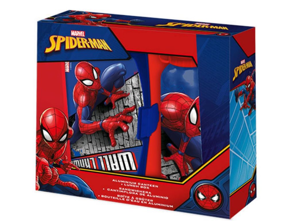 Dárkový set s láhví na pití a boxem na svačinu. To vše v červeno-modré barvě s grafikou zachycujícího superhrdinu Spidermana, jak šplhá na zeď.