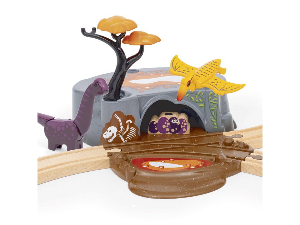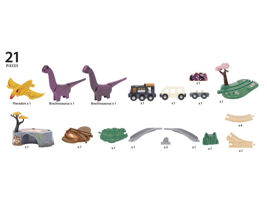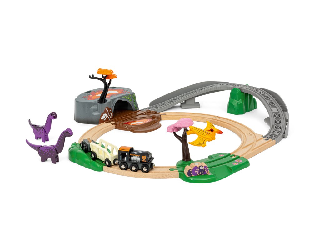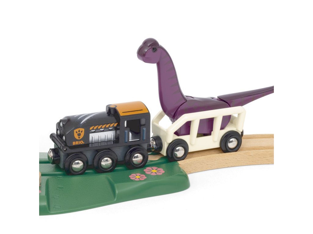 Prozkoumejte úžasný prehistorický svět dinosaurů v Dinosauří dobrodružné sadě. Tato 21dílná vláčkodráha s dinosauří tematikou obsahuje vláček se dvěma vagony, několik scénických dílů, jako je nebezpečná lávová jeskyně či travnaté luční kolejnice, a možnosti hraní s vláčkem v různých úrovních. Nechybí ani tři hraví barevní dinosauři, jedinečné pohyblivé části a klasické magnety BRIO pro interakci s okolním světem. Balení: 7,5x39x34,5cm. Věk: 3+