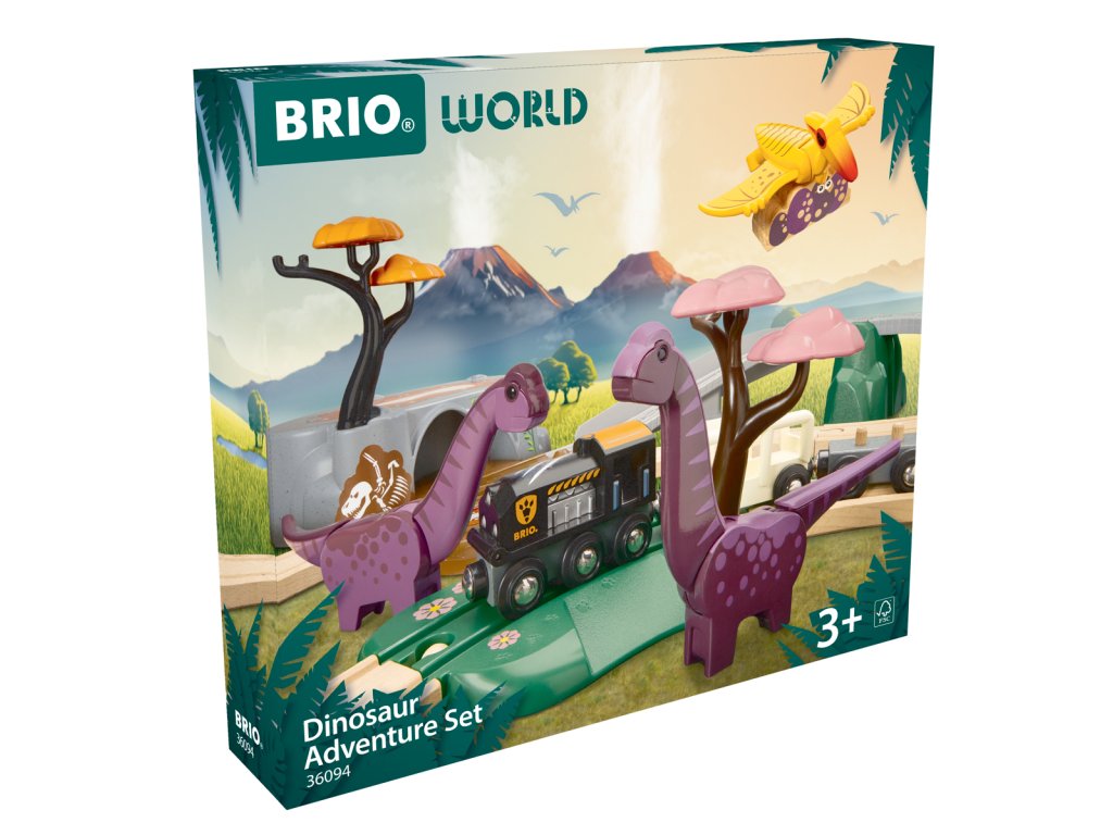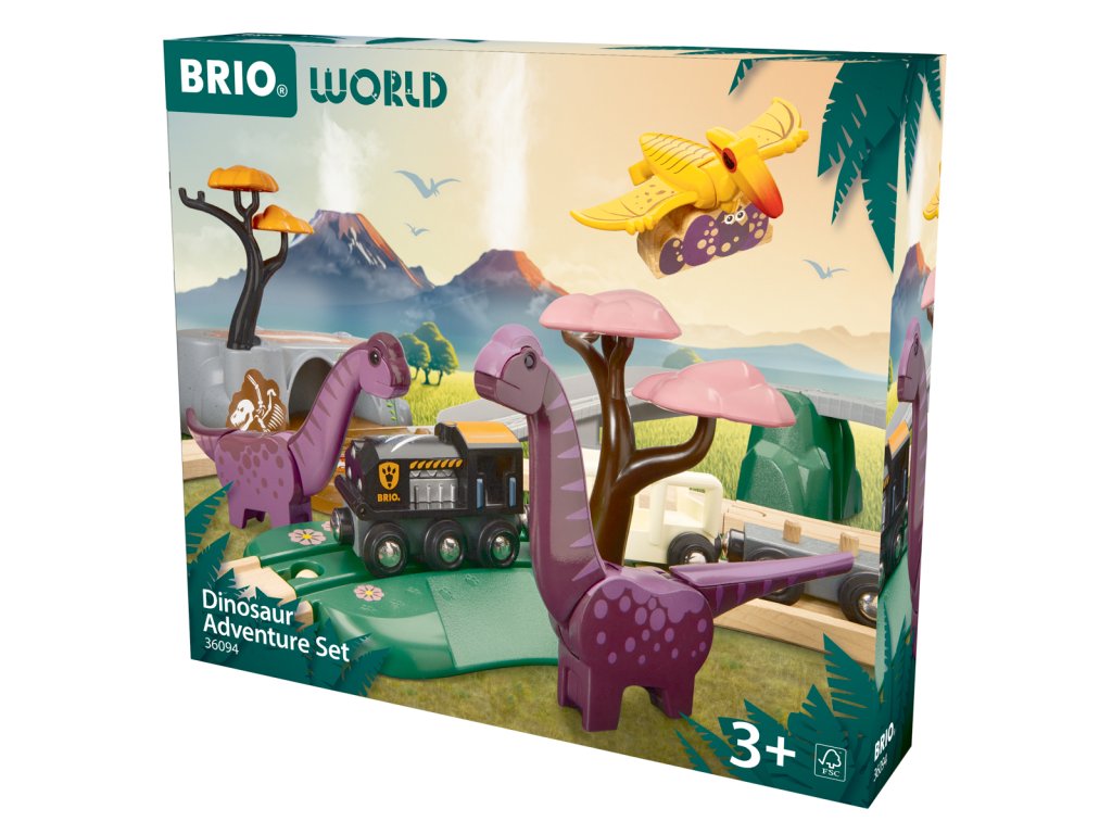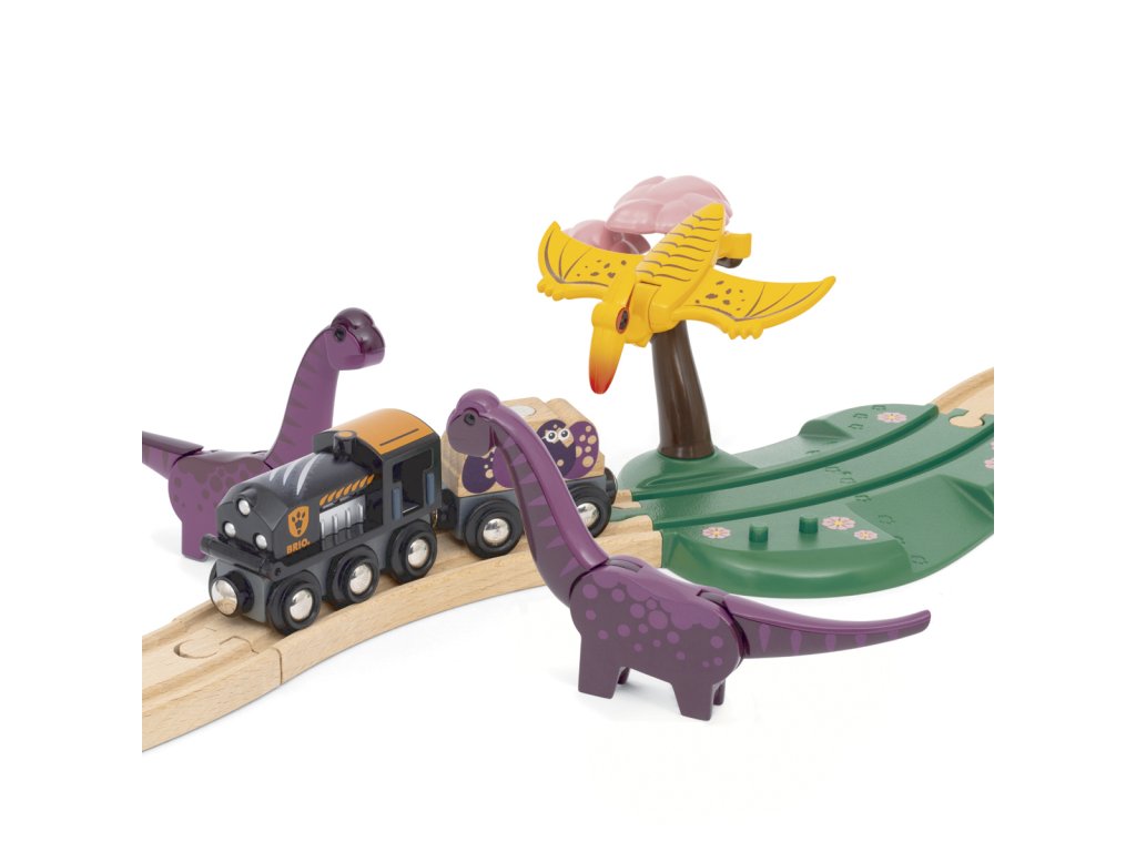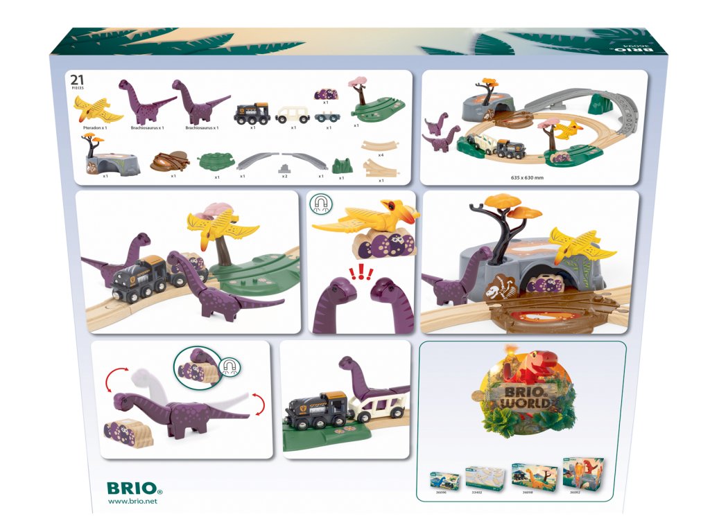 Prozkoumejte úžasný prehistorický svět dinosaurů v Dinosauří dobrodružné sadě. Tato 21dílná vláčkodráha s dinosauří tematikou obsahuje vláček se dvěma vagony, několik scénických dílů, jako je nebezpečná lávová jeskyně či travnaté luční kolejnice, a možnosti hraní s vláčkem v různých úrovních. Nechybí ani tři hraví barevní dinosauři, jedinečné pohyblivé části a klasické magnety BRIO pro interakci s okolním světem. Balení: 7,5x39x34,5cm. Věk: 3+