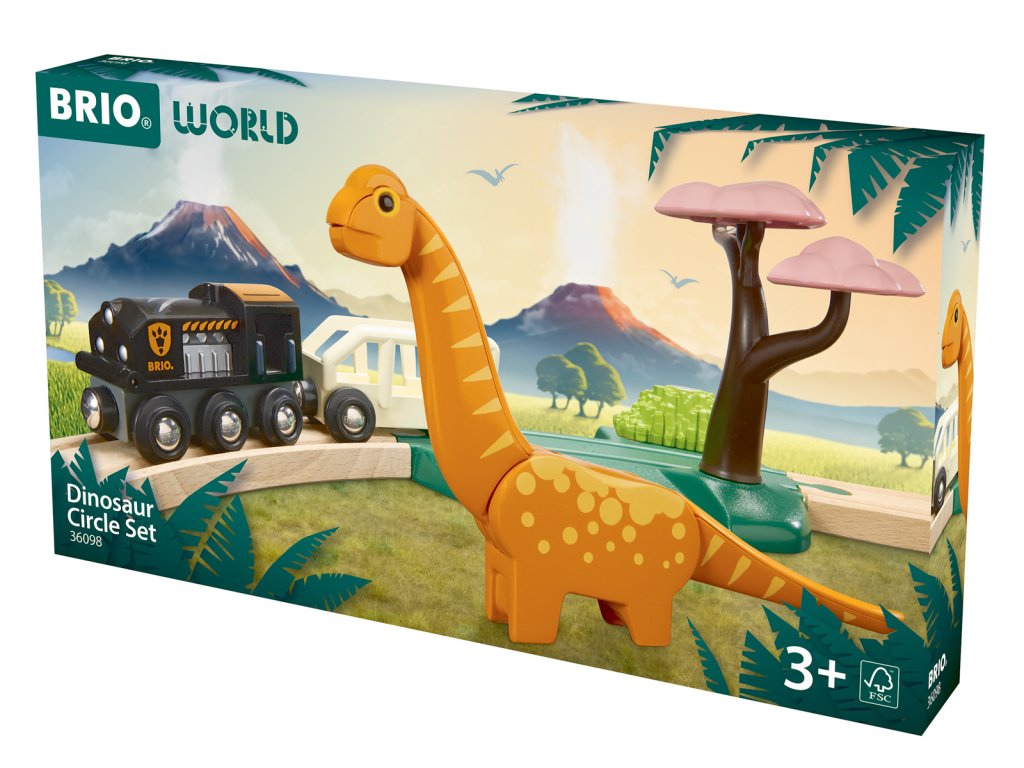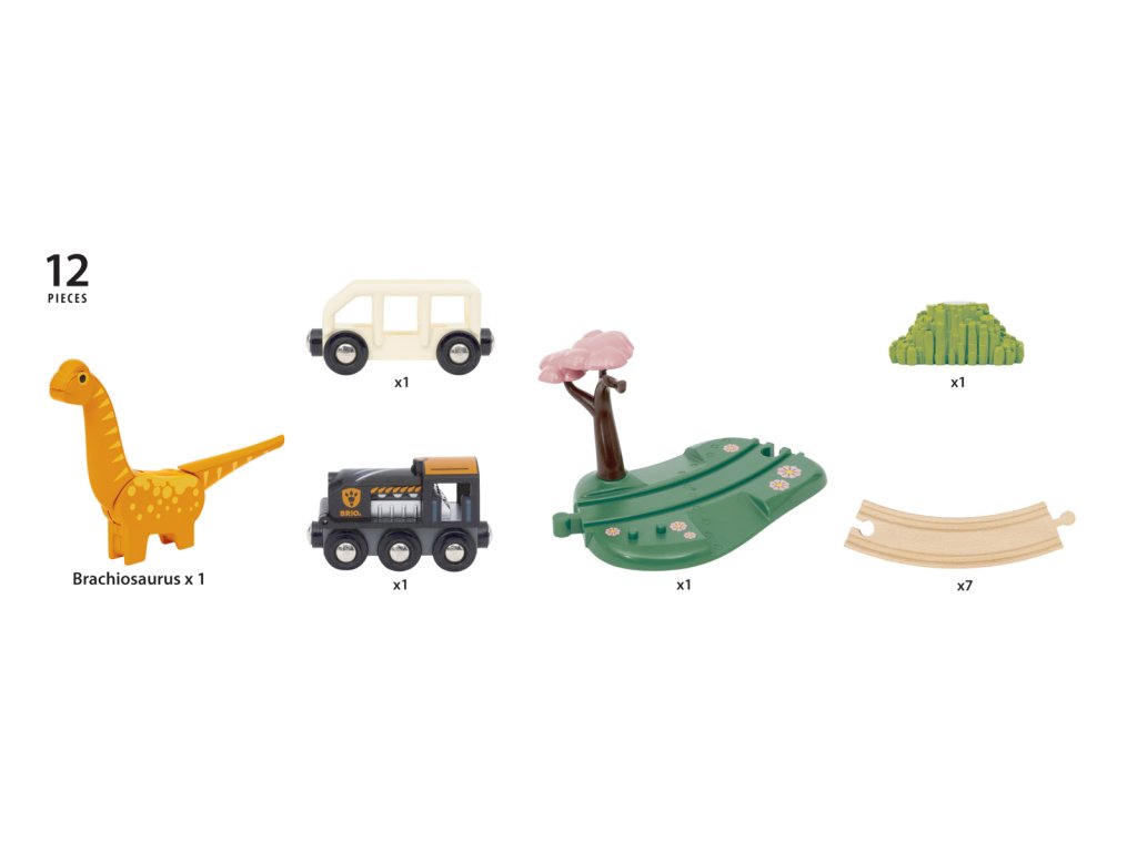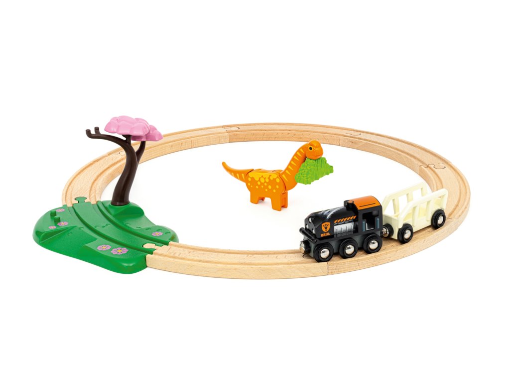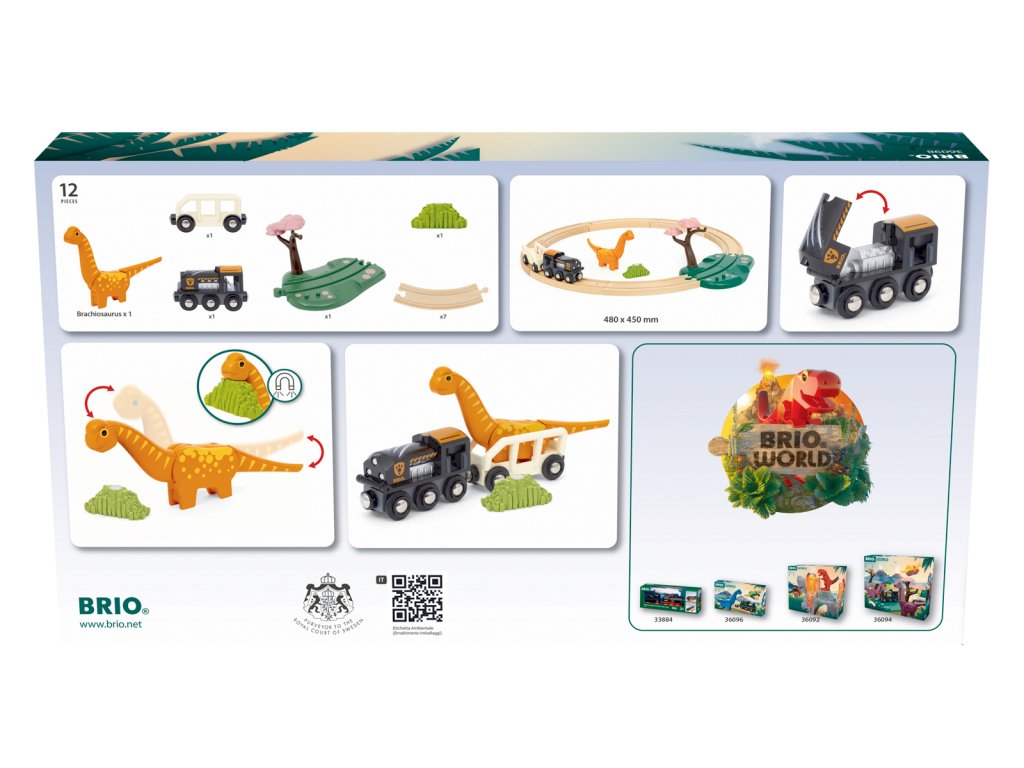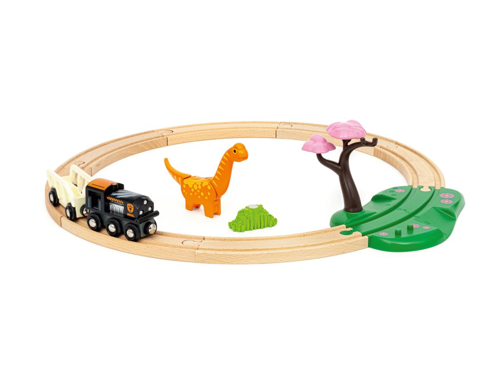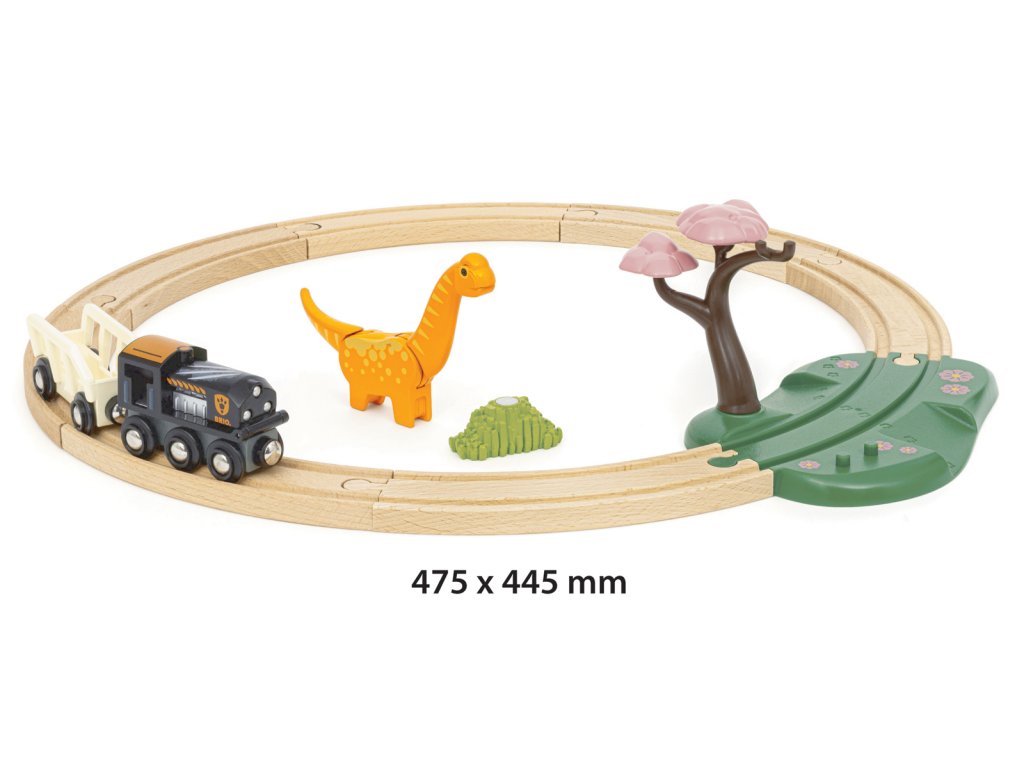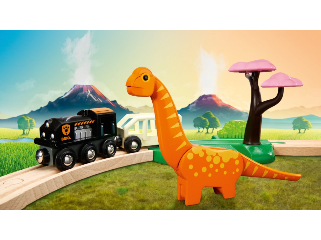 Huaíá! Po dinosauří kruhové vláčkodráze se pohybuje prehistorický tvor! Tato 12dílná dinosauří vláčkodráha obsahuje vláček s vagonkem, figurku dinosaura, přejezd přes travnatou louku a dřevěné kolejnice pro kruhové uspořádání. Na přejezdu buďte opatrní – barevný dinosaurus tuze rád pojídá listí ze stromu. Pohybem ocasu můžete zvedat a spouštět dinosauří hlavu k uchopení příslušenství klasickým magnetem BRIO. Balení: 5x36,5x20cm. Věk: 3+